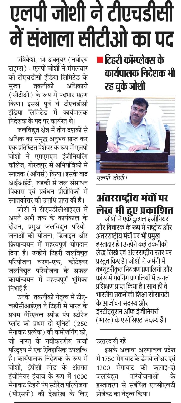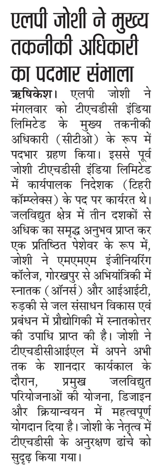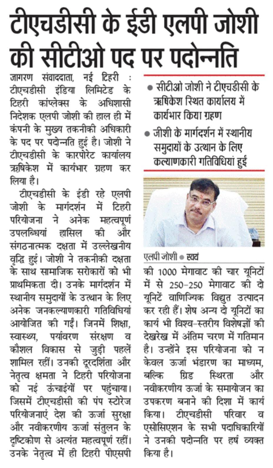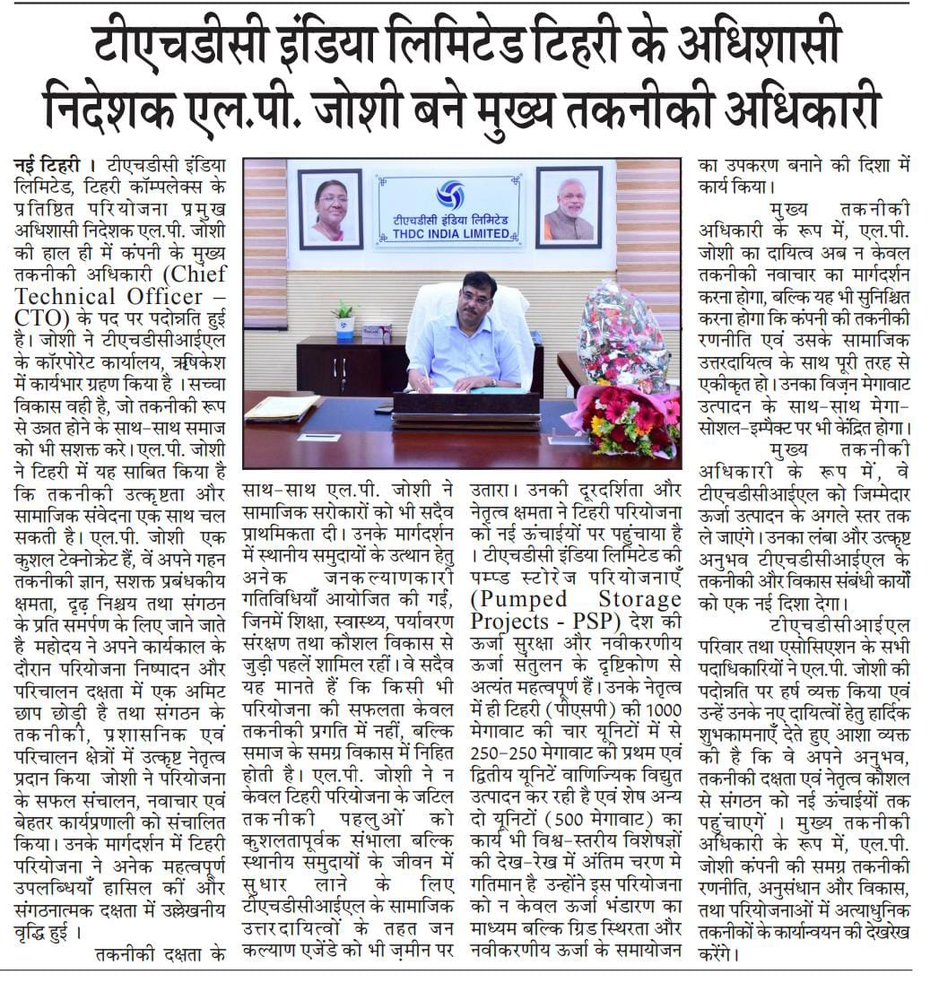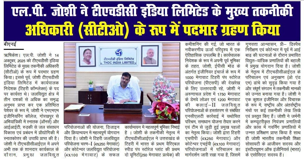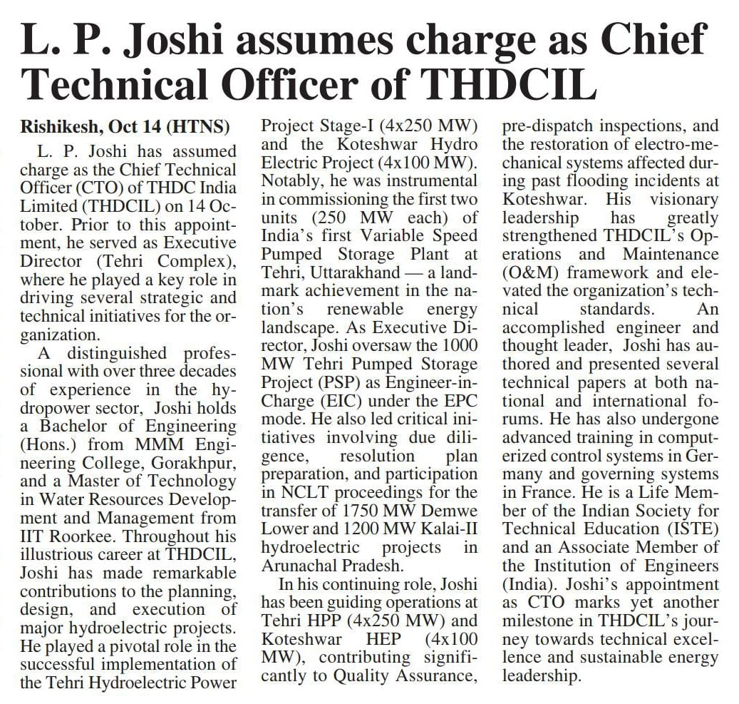 Rishikesh, 14 October, 2025: Shri L.P. Joshi has assumed charge as the Chief Technical Officer (CTO) of THDC India Limited on 14th October 2025. Prior to this, he was serving as Executive Director (Tehri Complex).