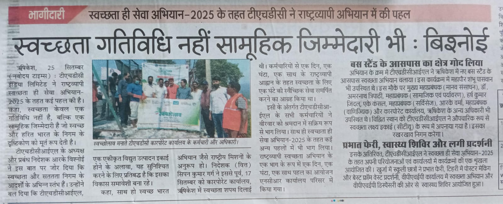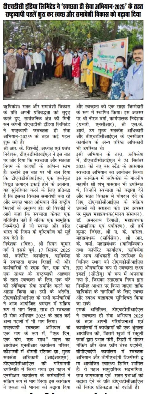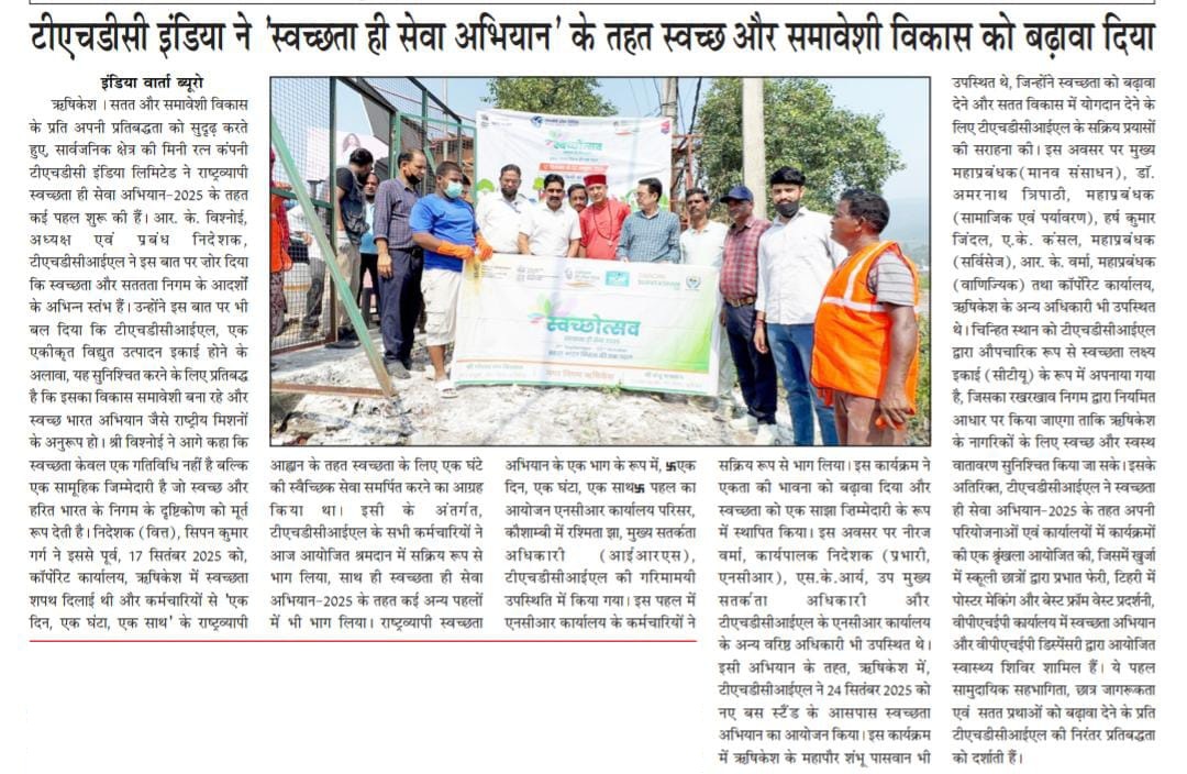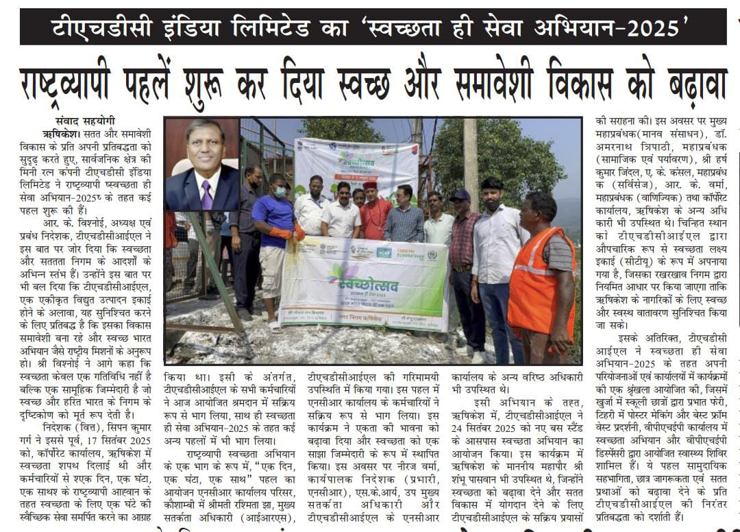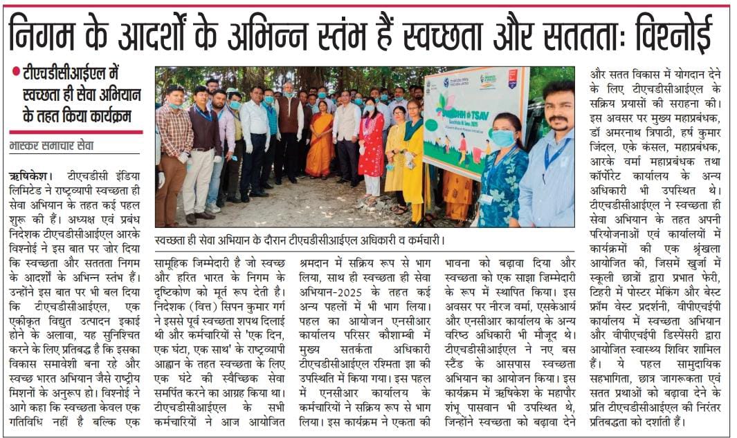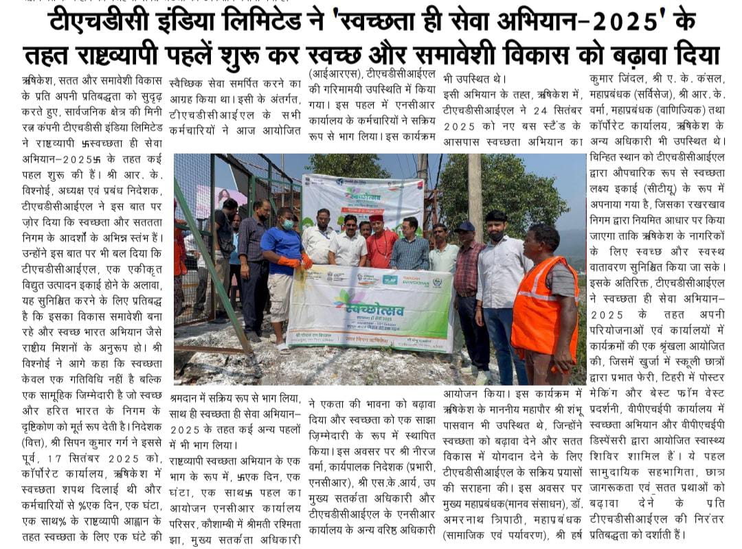 ऋषिकेश, 25 सितम्बर, 2025: सतत और समावेशी विकास के प्रति अपनी प्रतिबद्धता को सुदृढ़ करते हुए, सार्वजनिक क्षेत्र की मिनी रत्न कंपनी टीएचडीसी इंडिया लिमिटेड ने राष्ट्रव्यापी "स्वच्छता ही सेवा अभियान-2025" के तहत कई पहल शुरू की हैं।
