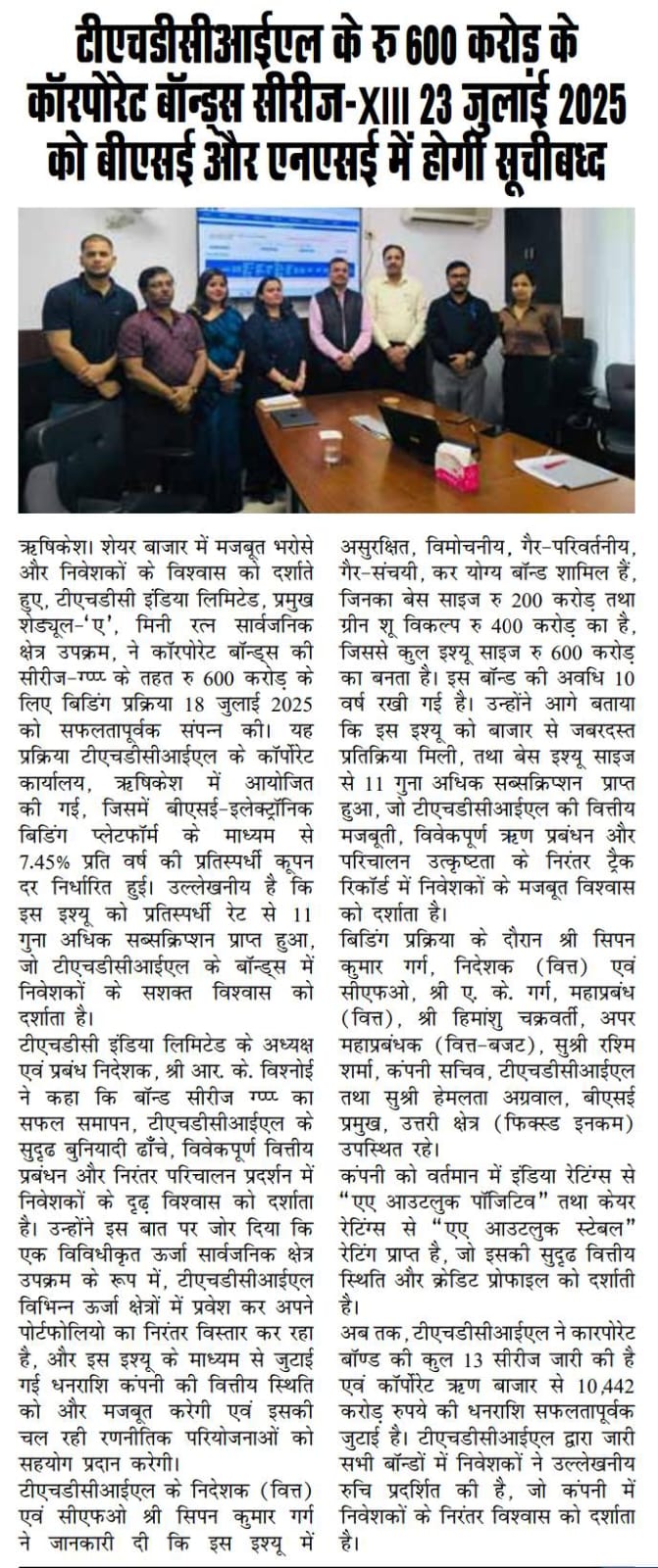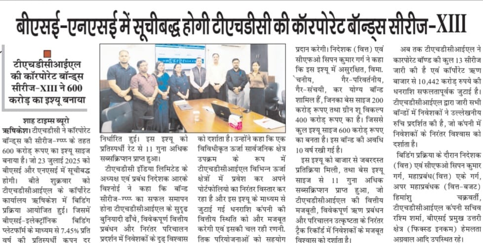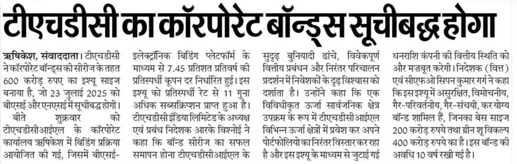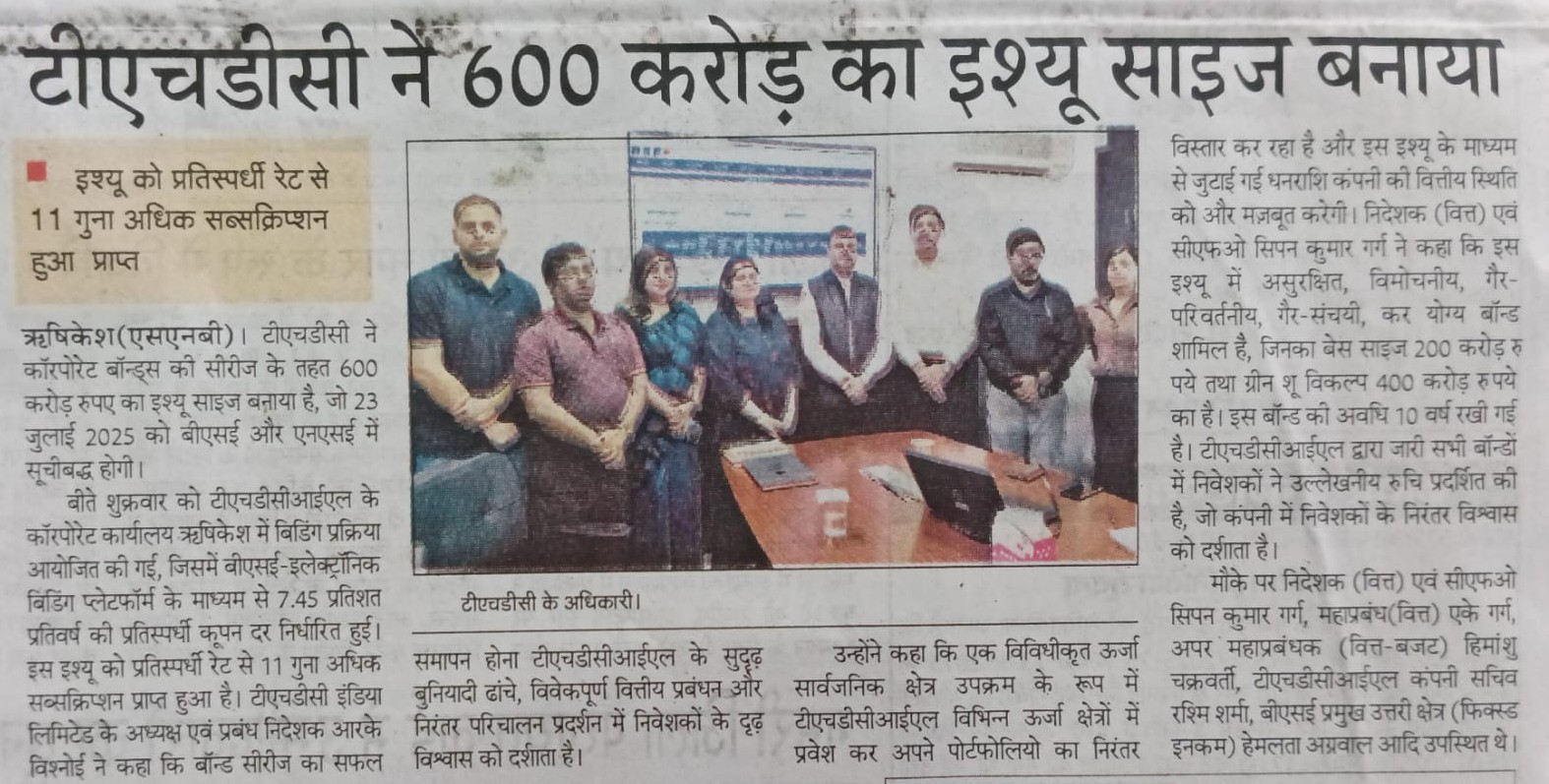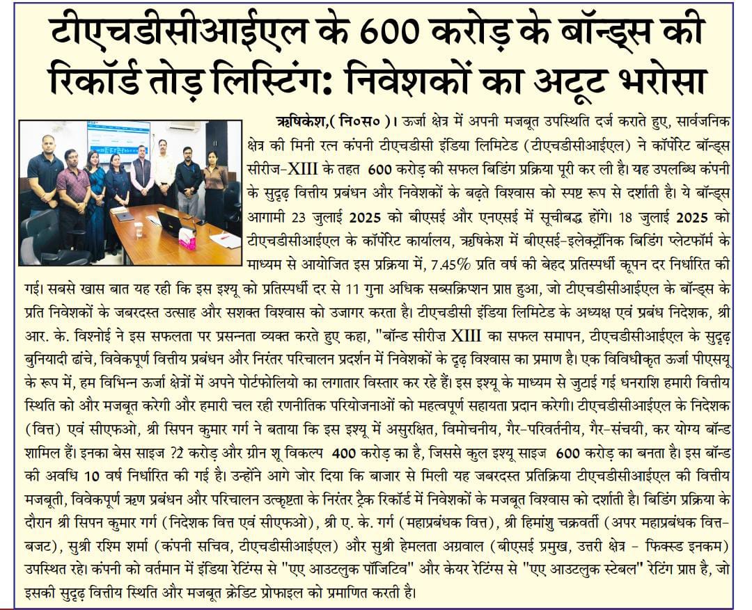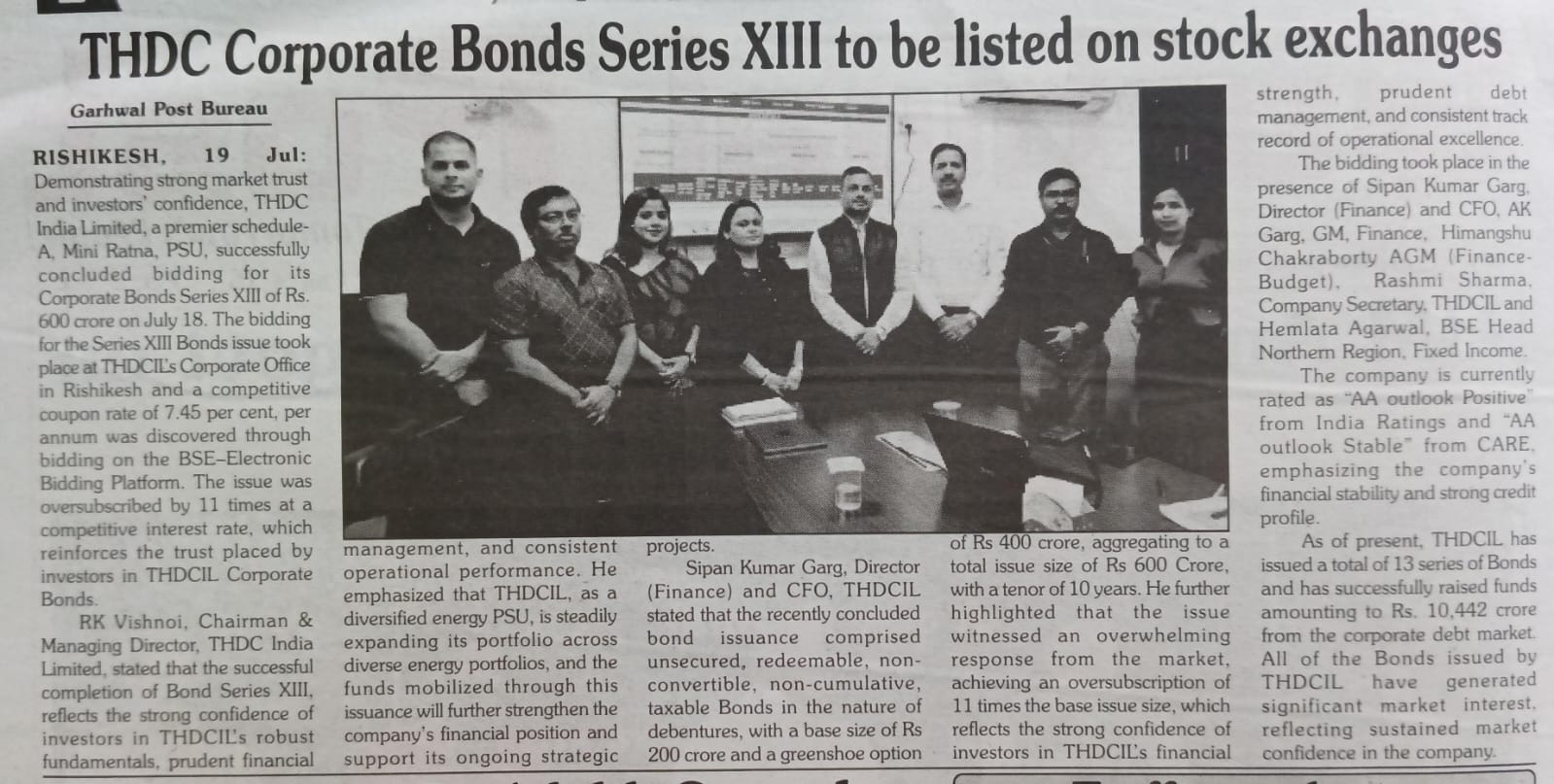 ऋषिकेश, 19 जुलाई 2025: शेयर बाजार में मजबूत भरोसे और निवेशकों के विश्वास को दर्शाते हुए, टीएचडीसी इंडिया लिमिटेड,  प्रमुख शेड्यूल-‘ए’, मिनी रत्न सार्वजनिक क्षेत्र उपक्रम, ने कॉरपोरेट बॉन्ड्स की सीरीज-XIII के तहत ₹600 करोड़ के लिए बिडिंग प्रक्रिया 18 जुलाई 2025 को सफलतापूर्वक संपन्न की। यह प्रक्रिया टीएचडीसीआईएल के कॉर्पोरेट कार्यालय, ऋषिकेश में आयोजित की गई, जिसमें बीएसई-इलेक्ट्रॉनिक बिडिंग प्लेटफॉर्म के माध्यम से 7.45% प्रति वर्ष की प्रतिस्पर्धी कूपन दर निर्धारित हुई। उल्लेखनीय है कि इस इश्यू को प्रतिस्पर्धी रेट से 11 गुना अधिक सब्सक्रिप्शन प्राप्त हुआ, जो टीएचडीसीआईएल के बॉन्ड्स में निवेशकों के सशक्त विश्वास को दर्शाता है।