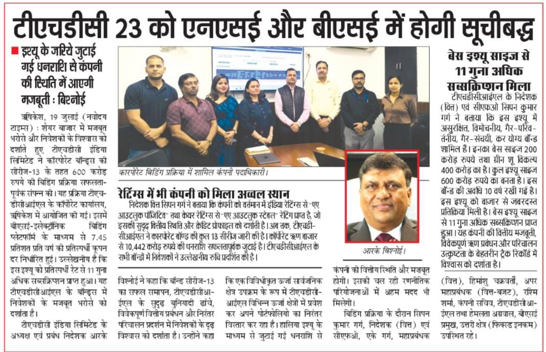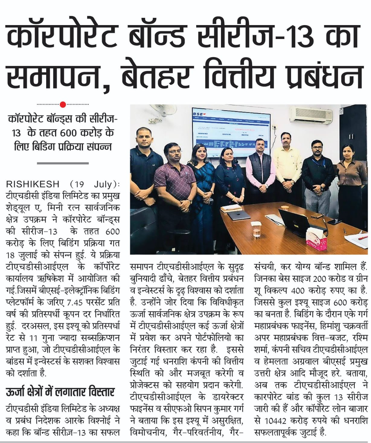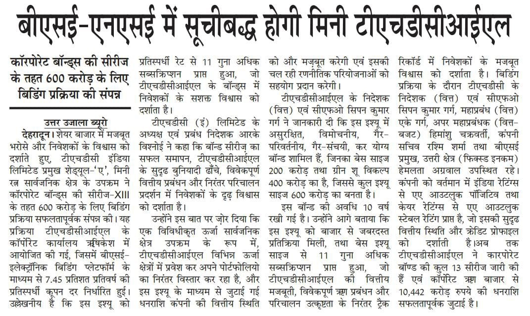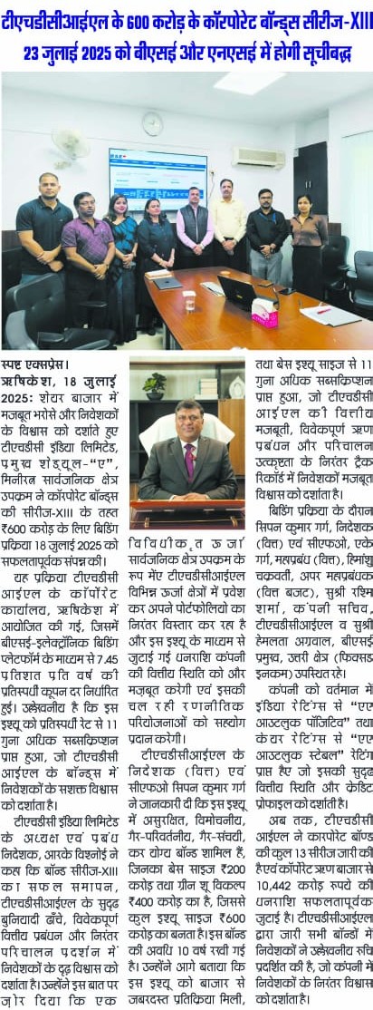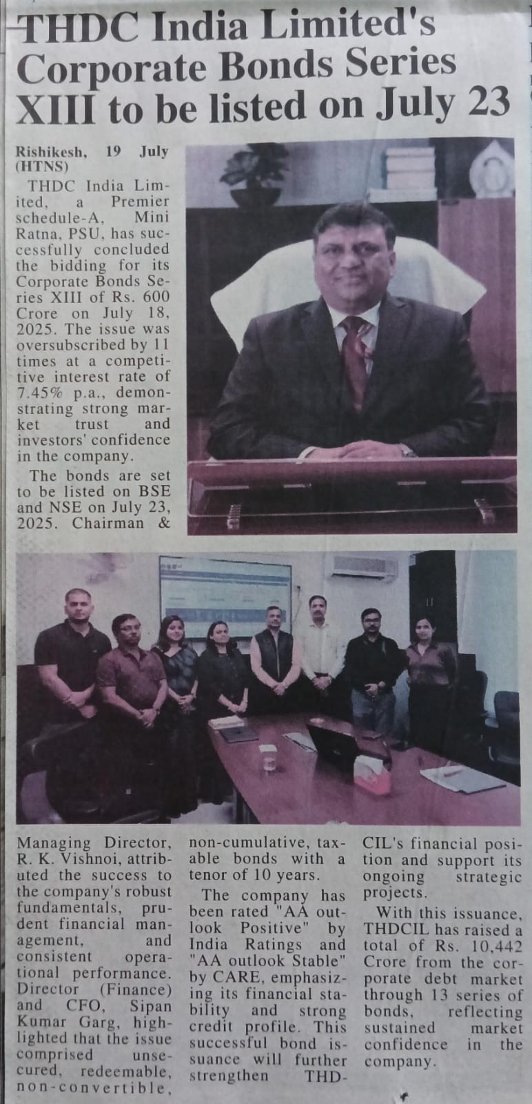 ऋषिकेश, 19 जुलाई 2025: शेयर बाजार में मजबूत भरोसे और निवेशकों के विश्वास को दर्शाते हुए, टीएचडीसी इंडिया लिमिटेड,  प्रमुख शेड्यूल-‘ए’, मिनी रत्न सार्वजनिक क्षेत्र उपक्रम, ने कॉरपोरेट बॉन्ड्स की सीरीज-XIII के तहत ₹600 करोड़ के लिए बिडिंग प्रक्रिया 18 जुलाई 2025 को सफलतापूर्वक संपन्न की। यह प्रक्रिया टीएचडीसीआईएल के कॉर्पोरेट कार्यालय, ऋषिकेश में आयोजित की गई, जिसमें बीएसई-इलेक्ट्रॉनिक बिडिंग प्लेटफॉर्म के माध्यम से 7.45% प्रति वर्ष की प्रतिस्पर्धी कूपन दर निर्धारित हुई। उल्लेखनीय है कि इस इश्यू को प्रतिस्पर्धी रेट से 11 गुना अधिक सब्सक्रिप्शन प्राप्त हुआ, जो टीएचडीसीआईएल के बॉन्ड्स में निवेशकों के सशक्त विश्वास को दर्शाता है।