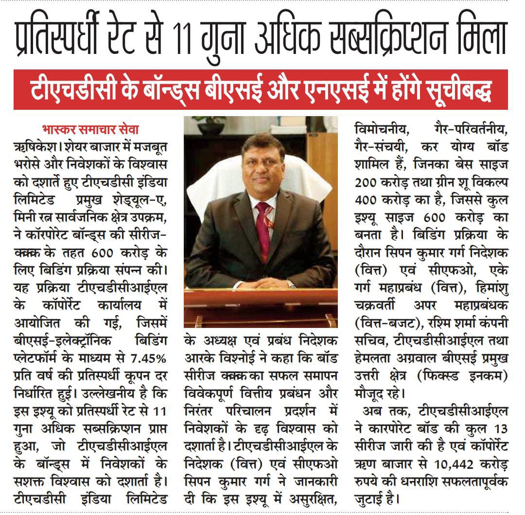 टीएचडीसीआईएल के निदेशक (वित्त) एवं सीएफओ श्री सिपन कुमार गर्ग ने जानकारी दी कि इस इश्यू में असुरक्षित, विमोचनीय, गैर-परिवर्तनीय, गैर-संचयी, कर योग्य बॉन्ड शामिल हैं, जिनका बेस साइज ₹200 करोड़ तथा ग्रीन शू विकल्प ₹400 करोड़ का है, जिससे कुल इश्यू साइज ₹600 करोड़ का बनता है। इस बॉन्ड की अवधि 10 वर्ष रखी गई है। उन्होंने आगे बताया कि इस इश्यू को बाजार से जबरदस्त प्रतिक्रिया मिली, तथा बेस इश्यू साइज से 11 गुना अधिक सब्सक्रिप्शन  प्राप्त हुआ, जो टीएचडीसीआईएल की वित्तीय मजबूती, विवेकपूर्ण ऋण प्रबंधन और परिचालन उत्कृष्टता के निरंतर ट्रैक रिकॉर्ड में निवेशकों के मजबूत विश्वास को दर्शाता है।