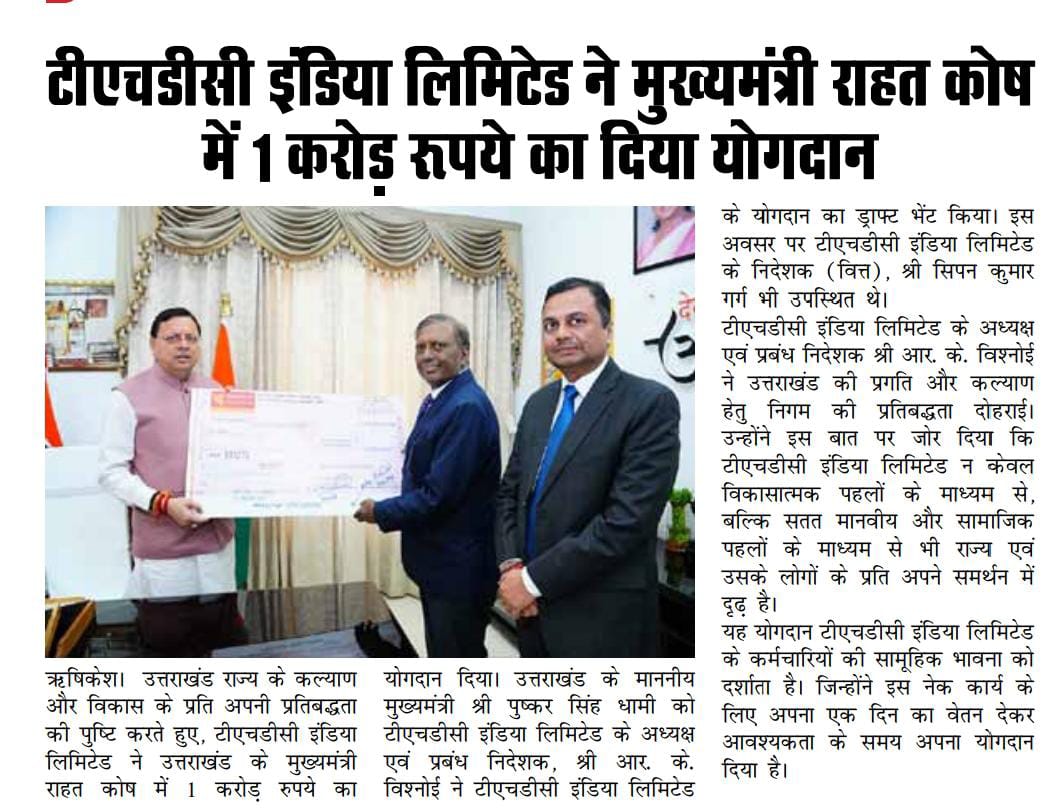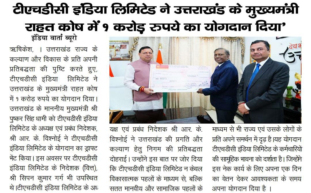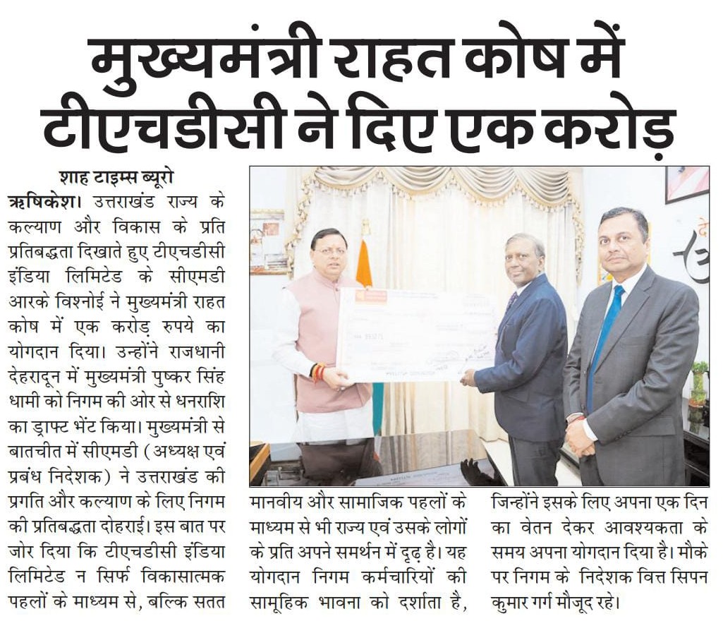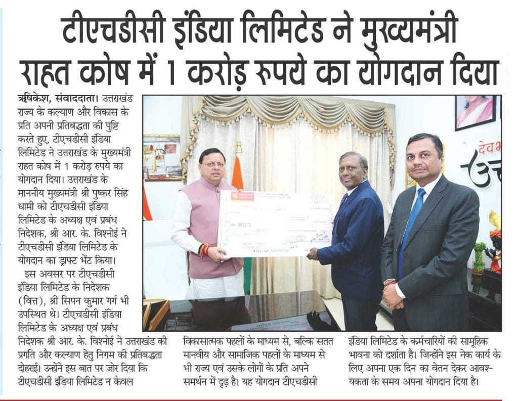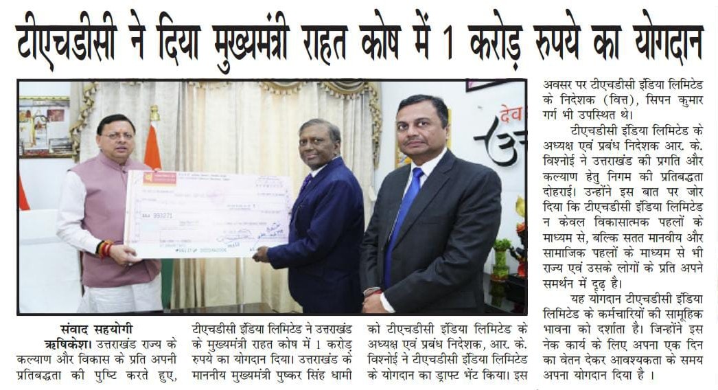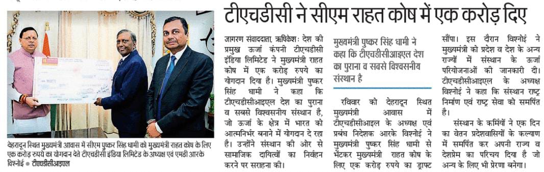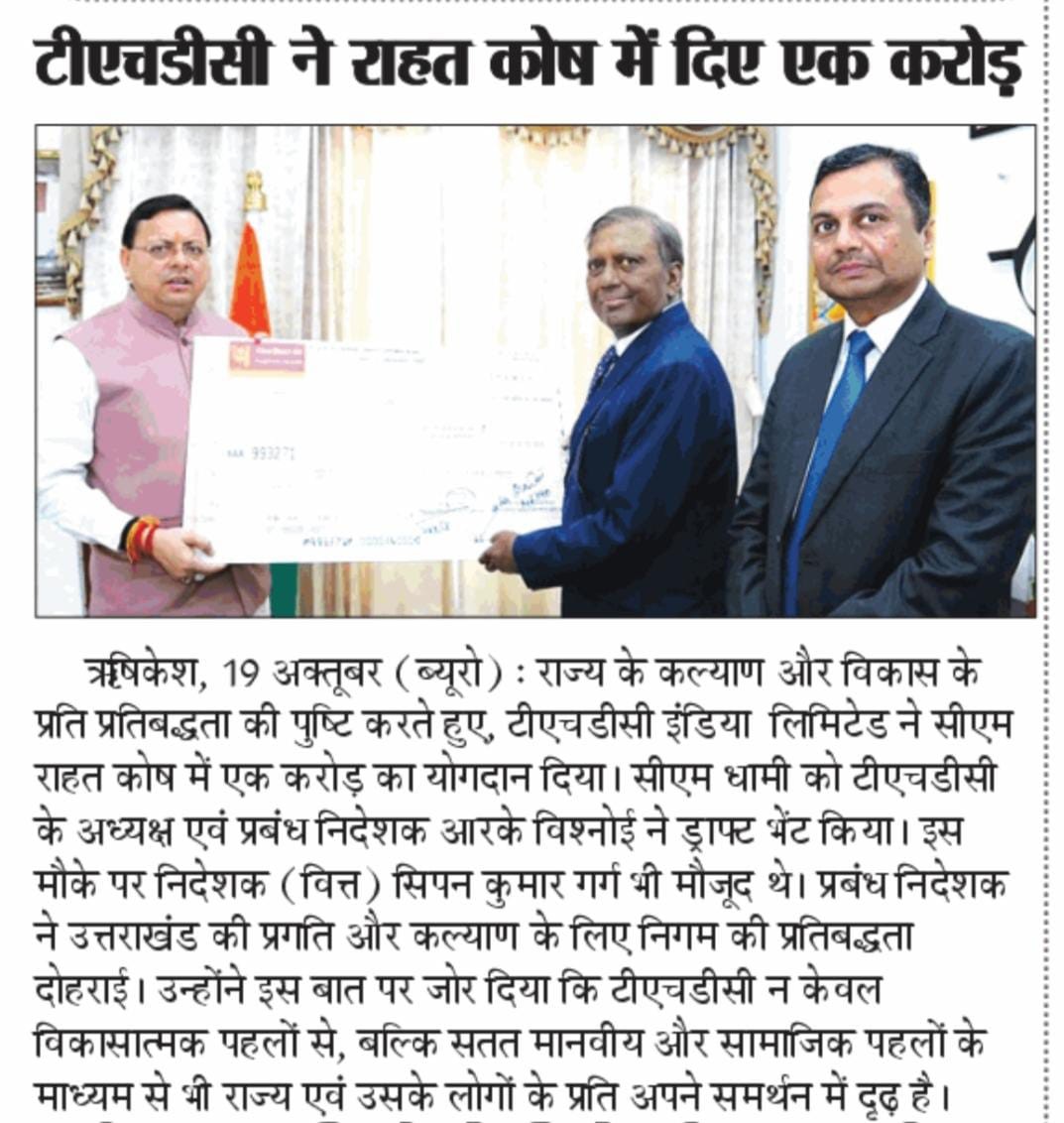 ऋषिकेश, 19 अक्टूबर, 2025:  उत्तराखंड राज्य के कल्याण और विकास के प्रति अपनी प्रतिबद्धता की पुष्टि करते हुए, टीएचडीसी इंडिया  लिमिटेड ने उत्तराखंड के मुख्यमंत्री राहत कोष में 1 करोड़ रुपये का योगदान दिया। उत्तराखंड के माननीय मुख्यमंत्री श्री पुष्कर सिंह धामी को टीएचडीसी इंडिया लिमिटेड के अध्यक्ष एवं प्रबंध निदेशक, श्री आर. के. विश्नोई ने टीएचडीसी इंडिया लिमिटेड के योगदान का ड्राफ्ट भेंट किया। इस अवसर पर टीएचडीसी इंडिया लिमिटेड के निदेशक (वित्त), श्री सिपन कुमार गर्ग भी उपस्थित थे।