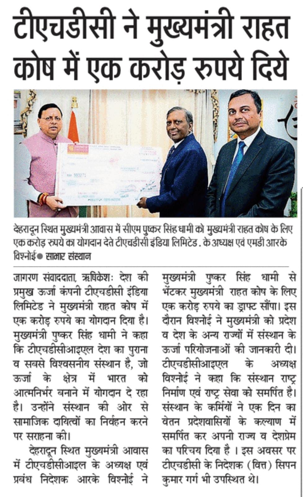 यह योगदान टीएचडीसी इंडिया लिमिटेड के कर्मचारियों की सामूहिक भावना को दर्शाता है। जिन्होंने इस नेक कार्य के लिए अपना एक दिन का वेतन देकर आवश्यकता के समय अपना योगदान दिया है।