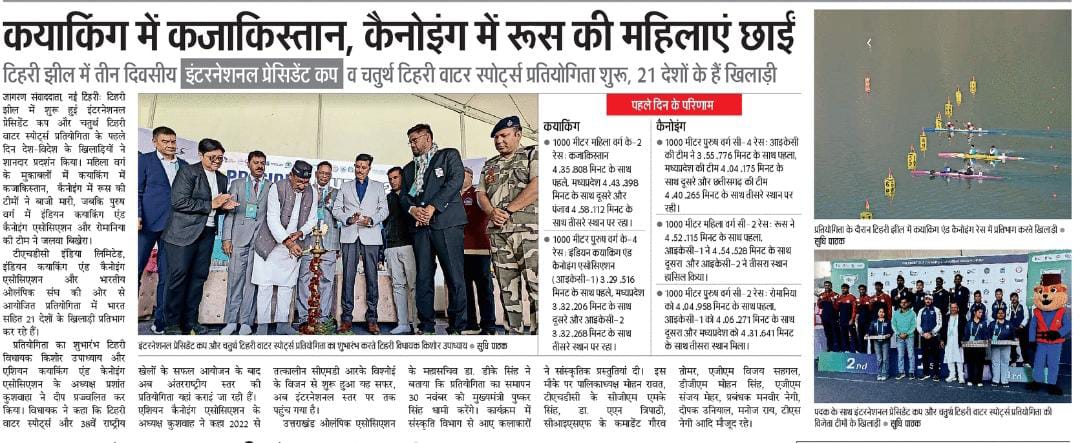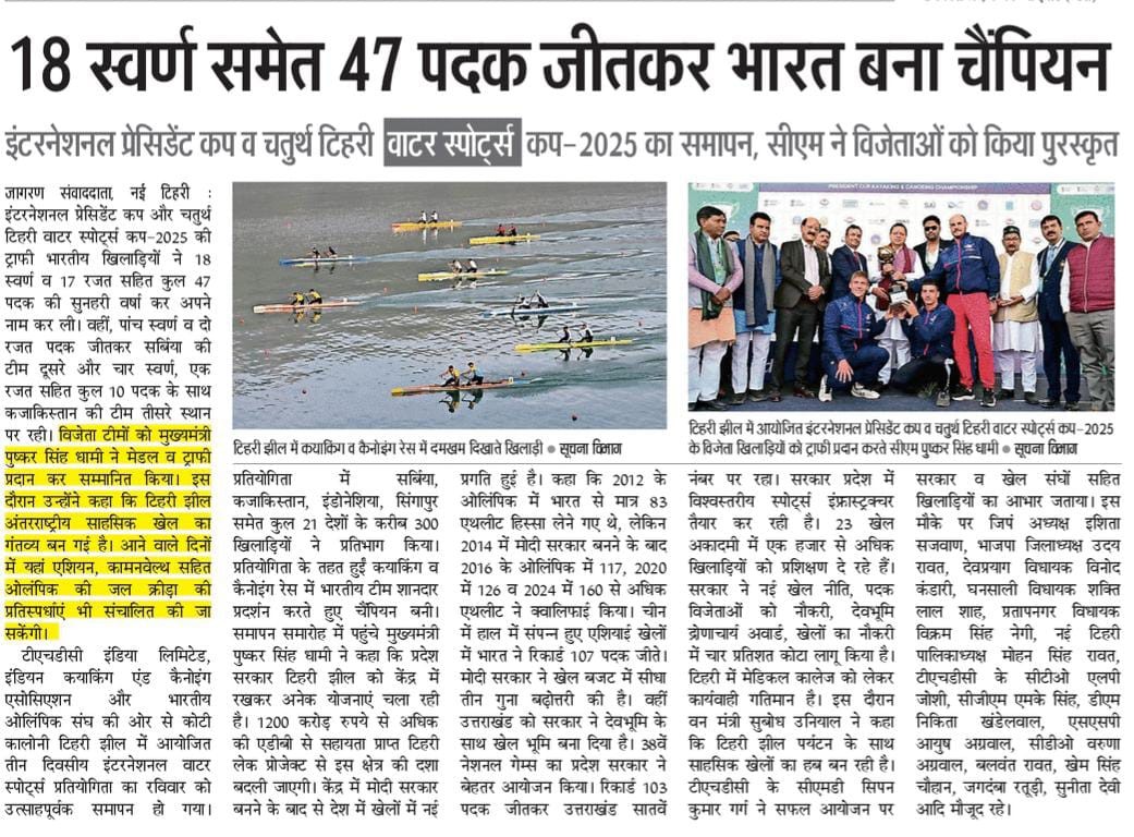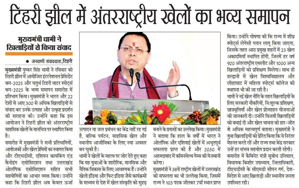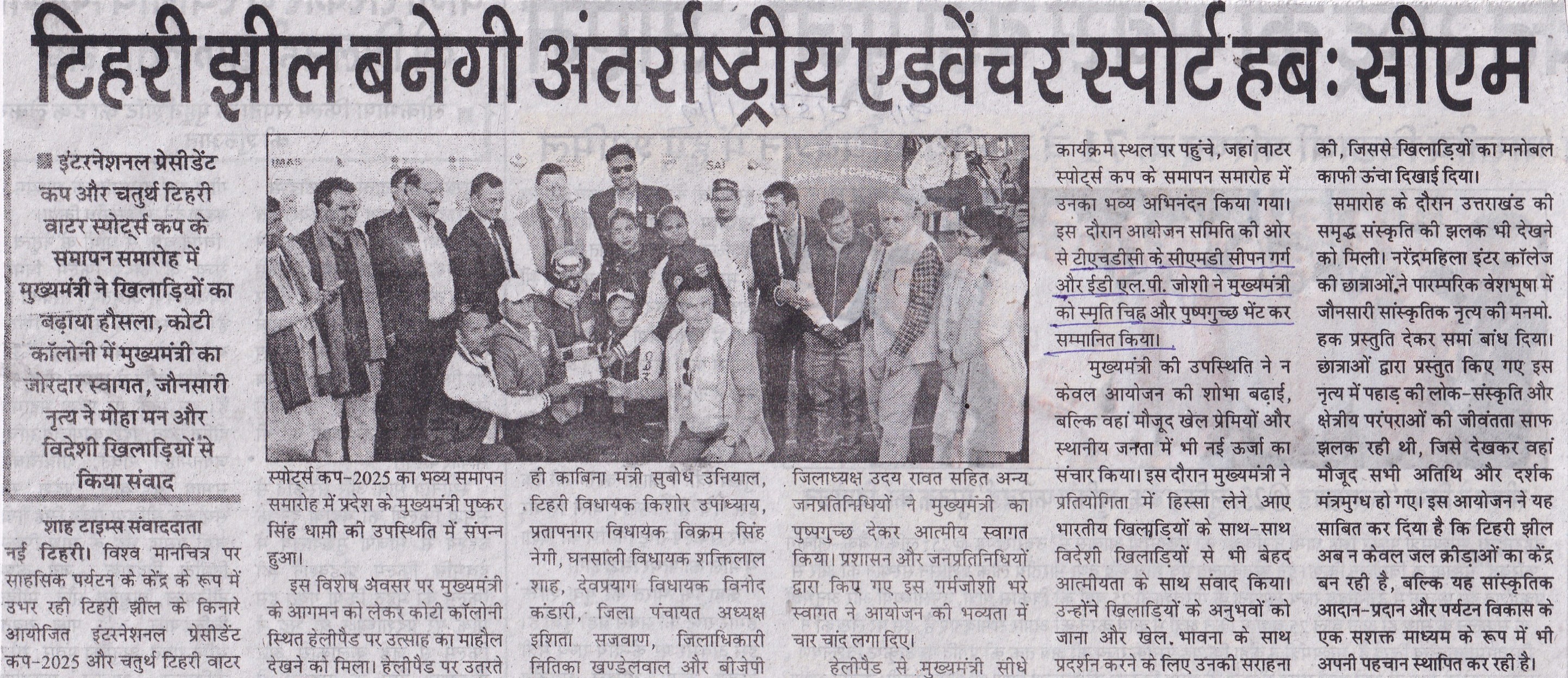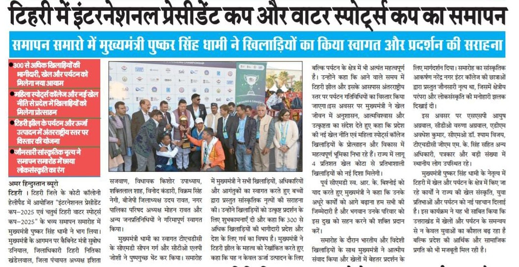ऋषिकेश, 30 November, 2025:  टीएचडीसी इंडिया लिमिटेड द्वारा आयोजित अंतर्राष्ट्रीय कयाकिंग एवं कैनोइंग प्रतियोगिता, प्रेसिडेंट कप और टिहरी वाटर स्पोर्ट्स कप 2025 के चौथे संस्करण का आज टिहरी बांध जलाशय, टिहरी गढ़वाल में समापन हुआ। भव्य समापन समारोह में उत्तराखंड के माननीय मुख्यमंत्री श्री पुष्कर सिंह धामी मुख्य अतिथि के रूप में उपस्थित रहे, जिनका टीएचडीसी इंडिया लिमिटेड के अध्यक्ष एवं प्रबंध निदेशक श्री सिपन कुमार गर्ग ने हार्दिक स्वागत किया।
