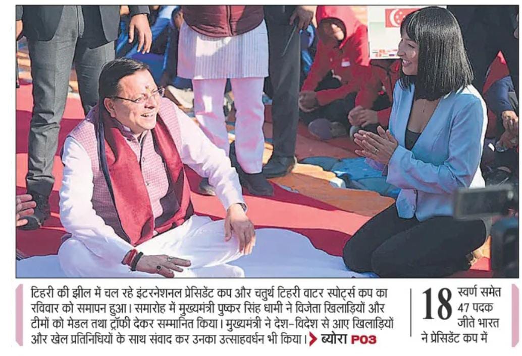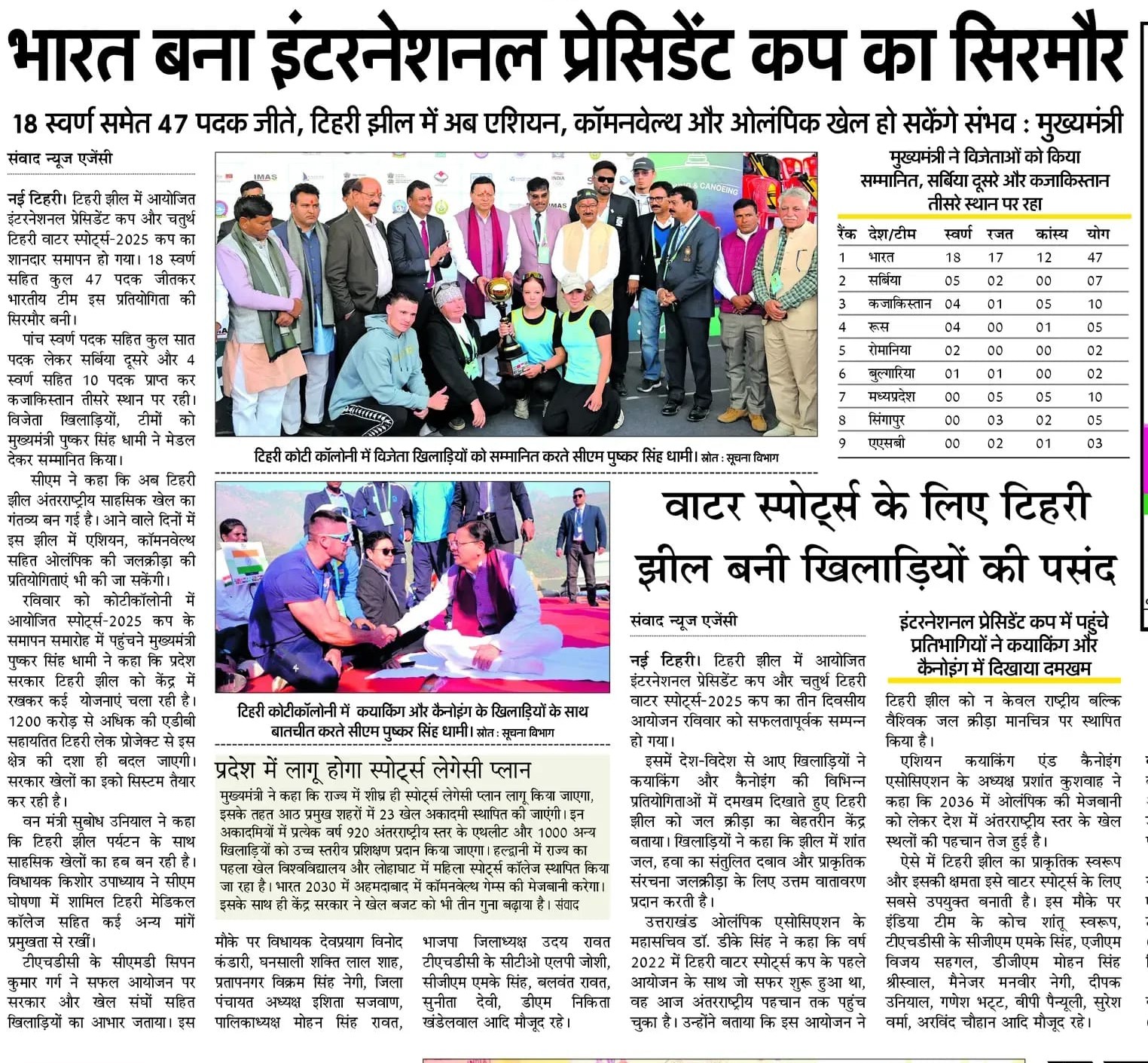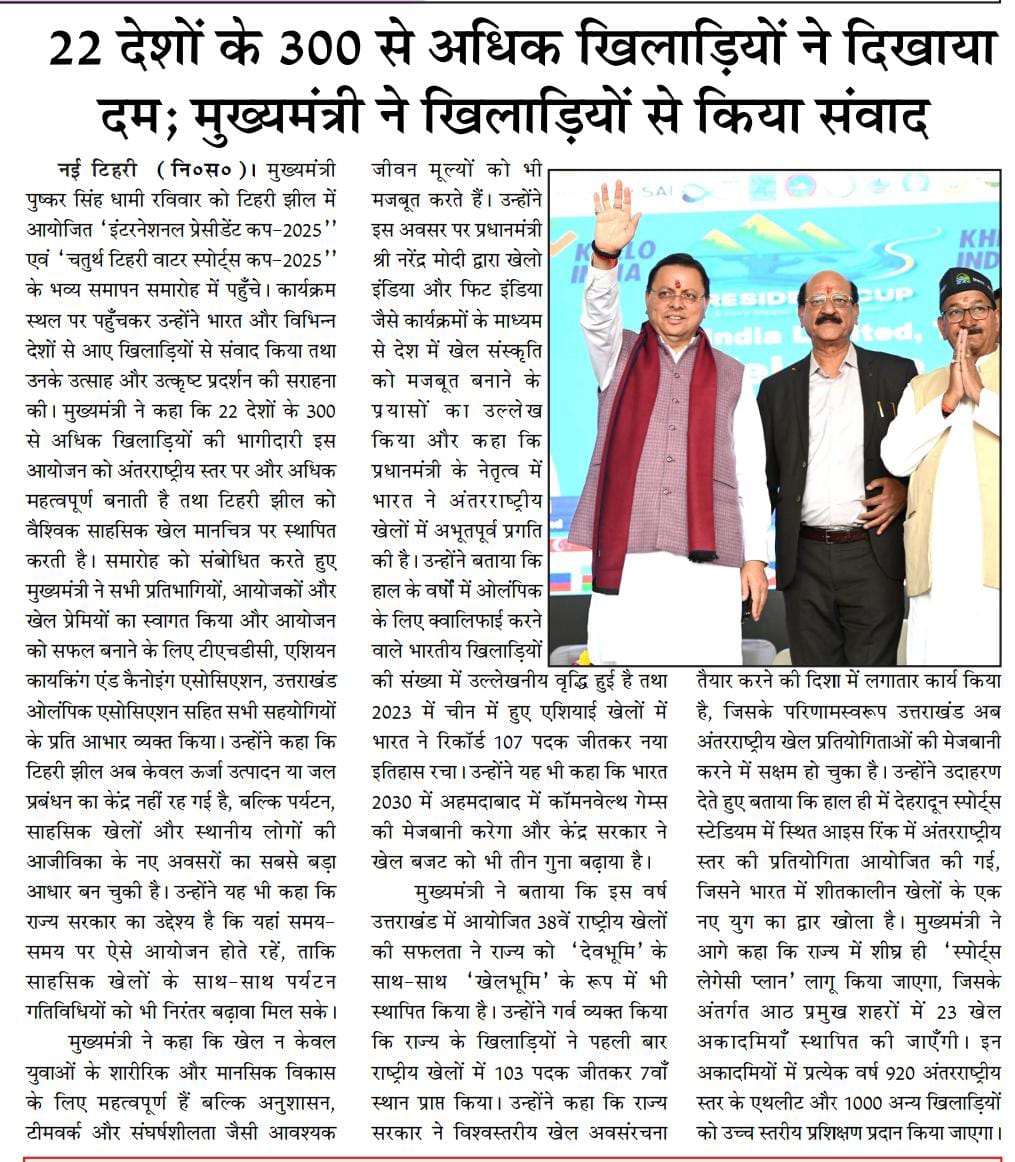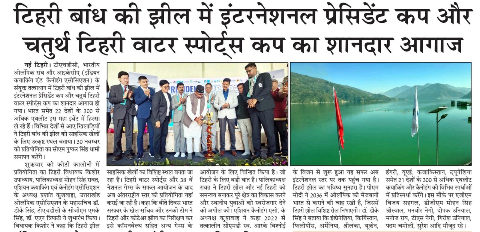 ऋषिकेश, 30 November, 2025:  टीएचडीसी इंडिया लिमिटेड द्वारा आयोजित अंतर्राष्ट्रीय कयाकिंग एवं कैनोइंग प्रतियोगिता, प्रेसिडेंट कप और टिहरी वाटर स्पोर्ट्स कप 2025 के चौथे संस्करण का आज टिहरी बांध जलाशय, टिहरी गढ़वाल में समापन हुआ। भव्य समापन समारोह में उत्तराखंड के माननीय मुख्यमंत्री श्री पुष्कर सिंह धामी मुख्य अतिथि के रूप में उपस्थित रहे, जिनका टीएचडीसी इंडिया लिमिटेड के अध्यक्ष एवं प्रबंध निदेशक श्री सिपन कुमार गर्ग ने हार्दिक स्वागत किया।
