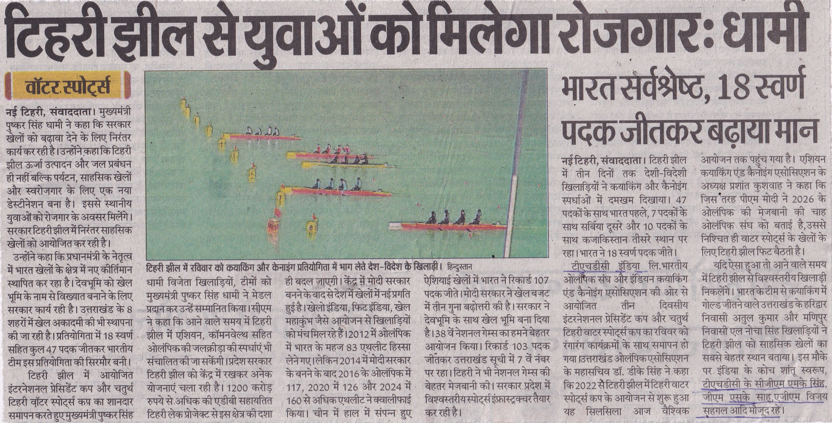 माननीय मुख्यमंत्री ने कहा कि टिहरी झील न केवल बिजली उत्पादन का एक प्रमुख स्रोत है, बल्कि पर्यटन, साहसिक खेलों और आर्थिक विकास का भी तेजी से बढ़ता केंद्र बन गई है।उन्होंने युवा एथलीटों को उत्कृष्टता के लिए प्रयास जारी रखने के लिए प्रोत्साहित किया और उन्हें केन्द्र तथा राज्य सरकार से अटूट समर्थन का आश्वासन दिया। उन्होंने टीएचडीसीआईएल के पूर्व सीएमडी स्वर्गीय श्री आर. के. विश्नोई को भी श्रद्धांजलि अर्पित की, उनके योगदान को स्मरण किया तथा उनके असामयिक निधन पर गहरा शोक व्यक्त किया।