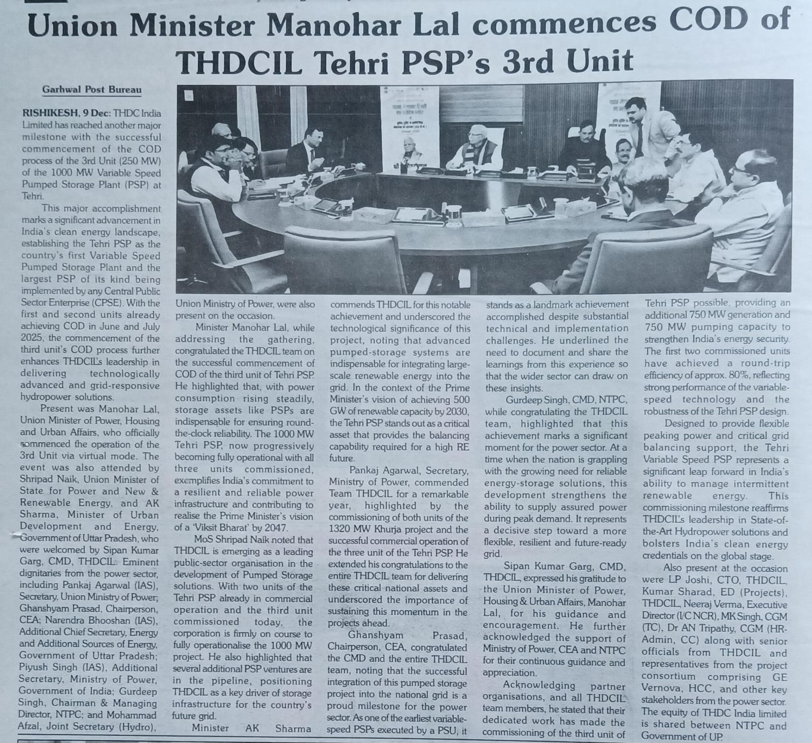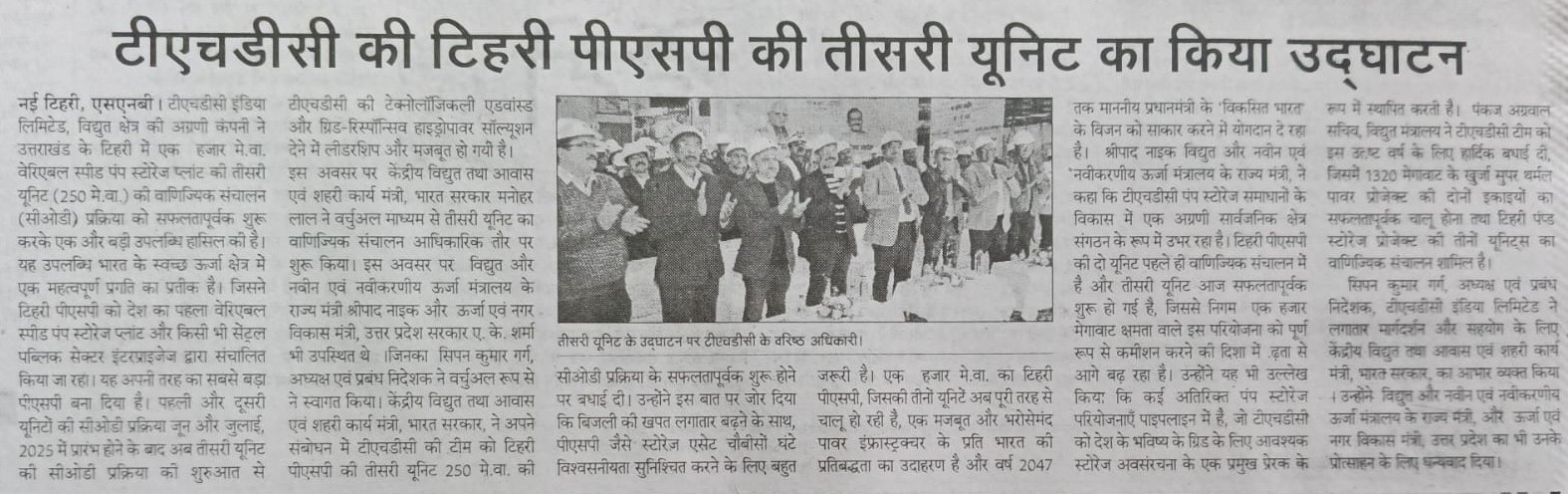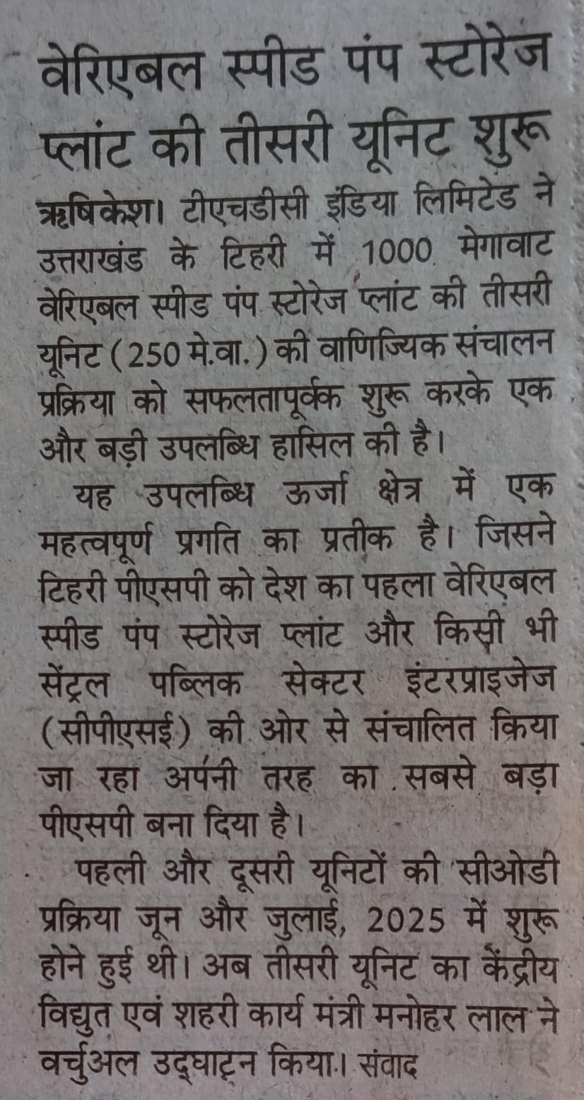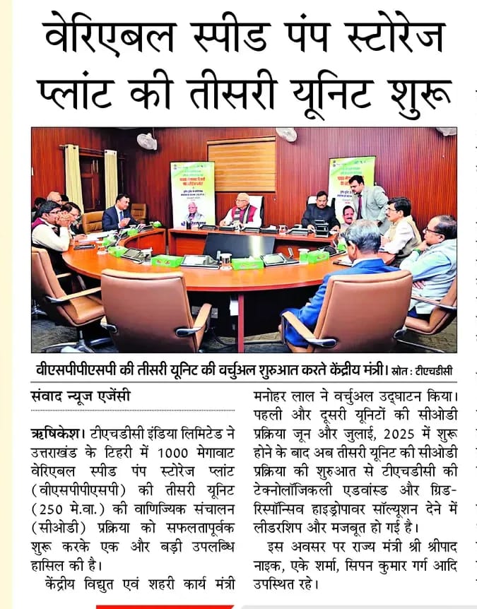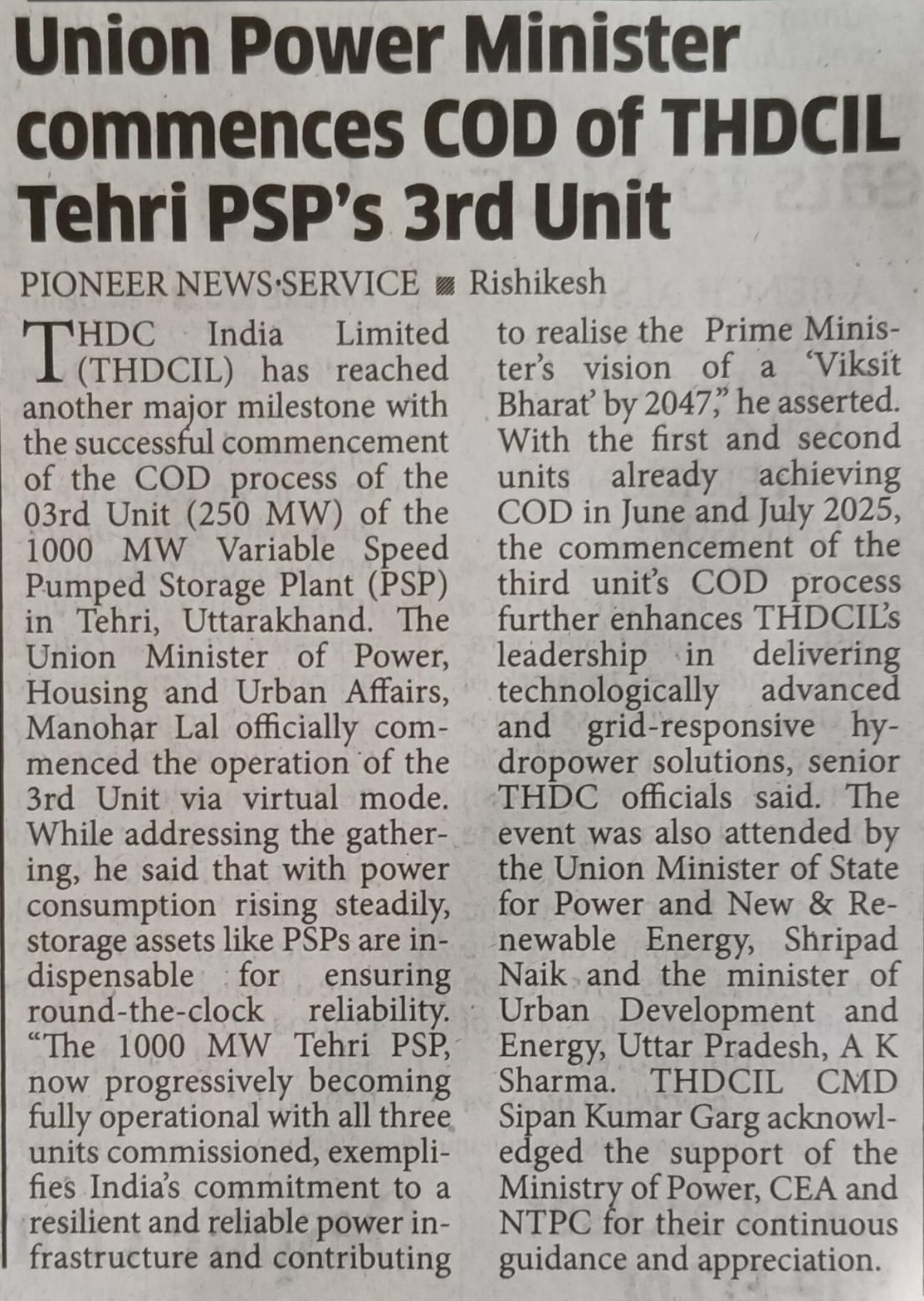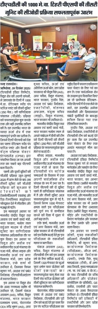 ऋषिकेश, 09 दिसंबर, 2025: टीएचडीसी इंडिया लिमिटेड, विद्युत क्षेत्र की अग्रणी कंपनी, ने उत्तराखंड के टिहरी में 1000 मे.वा. वेरिएबल स्पीड पंप स्टोरेज प्लांट की तीसरी यूनिट (250 मे.वा.) की वाणिज्यिक संचालन (सीओडी) प्रक्रिया को सफलतापूर्वक शुरू करके एक और बड़ी उपलब्धि हासिल की है।