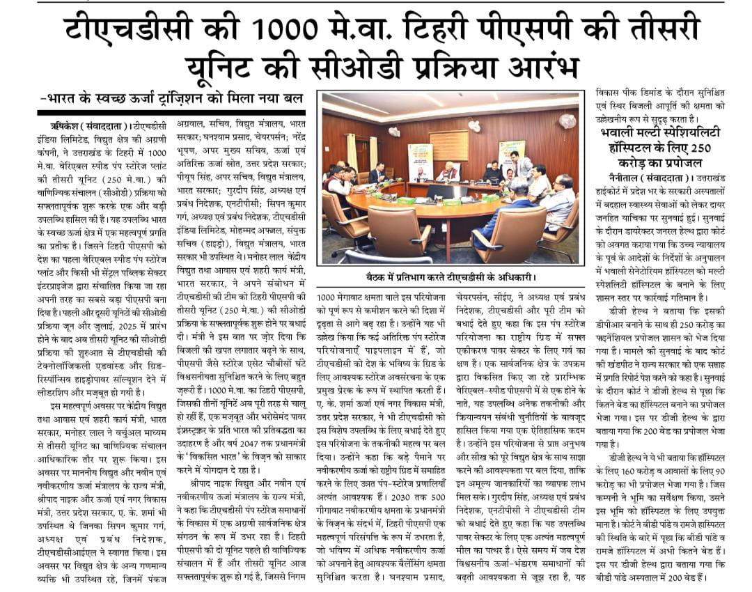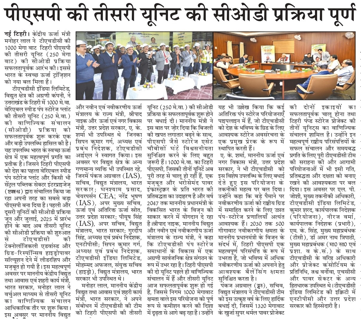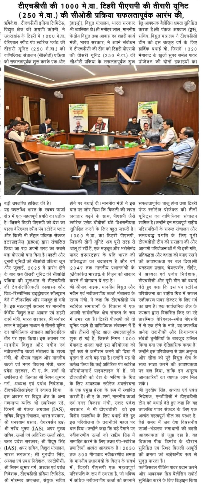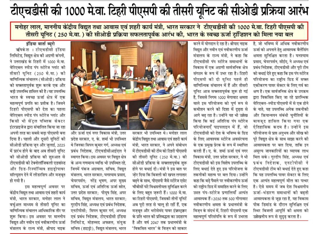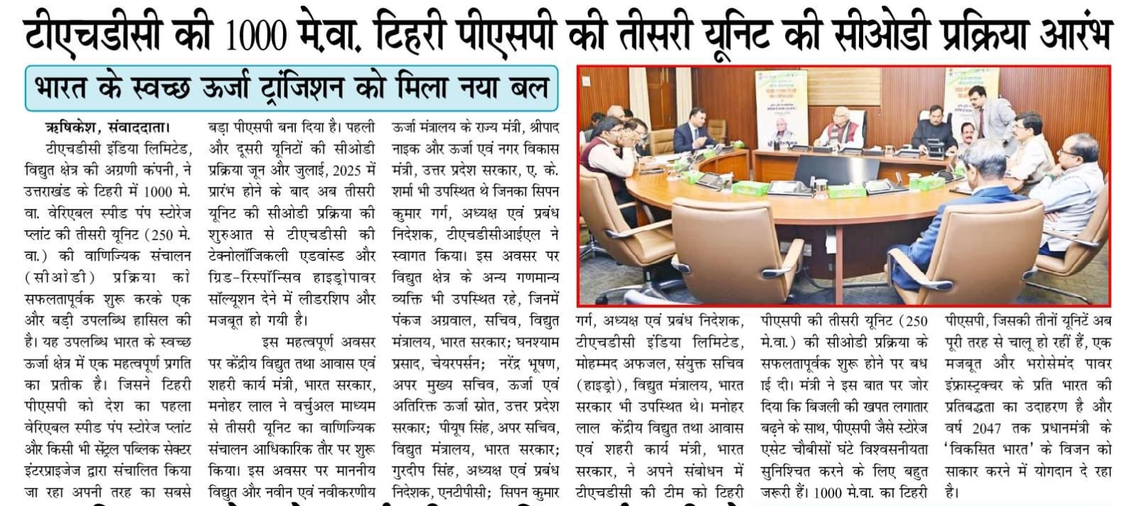 ऋषिकेश, 09 दिसंबर, 2025: टीएचडीसी इंडिया लिमिटेड, विद्युत क्षेत्र की अग्रणी कंपनी, ने उत्तराखंड के टिहरी में 1000 मे.वा. वेरिएबल स्पीड पंप स्टोरेज प्लांट की तीसरी यूनिट (250 मे.वा.) की वाणिज्यिक संचालन (सीओडी) प्रक्रिया को सफलतापूर्वक शुरू करके एक और बड़ी उपलब्धि हासिल की है।