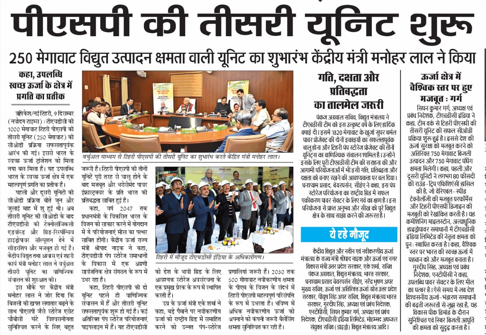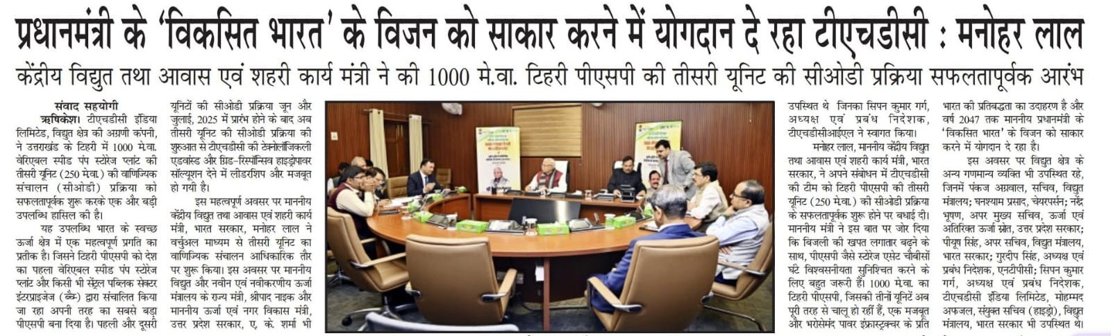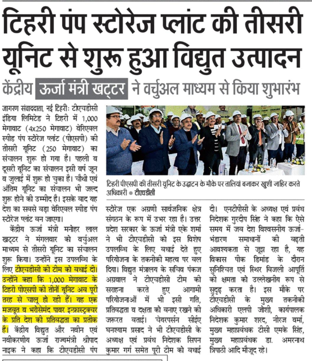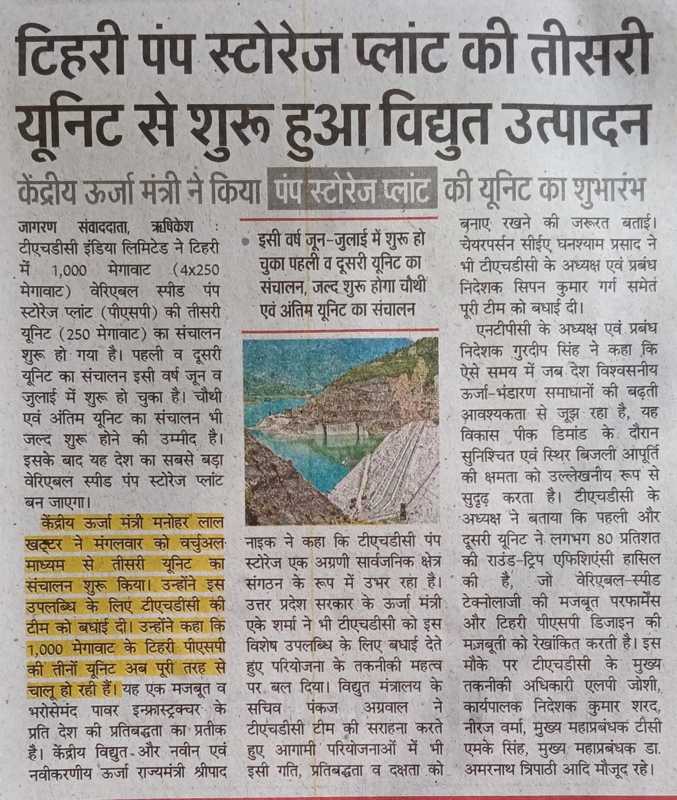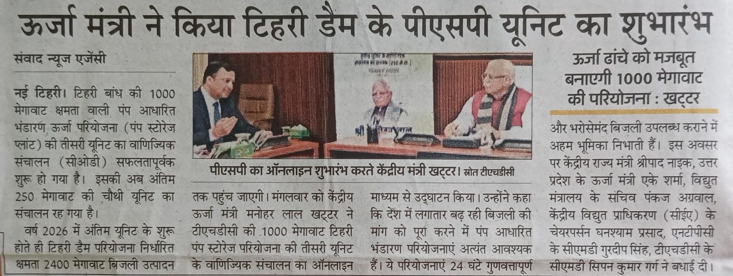 श्री गुरदीप सिंह, अध्यक्ष एवं प्रबंध निदेशक, एनटीपीसी ने टीएचडीसी टीम को बधाई देते हुए कहा कि यह उपलब्धि पावर सेक्टर के लिए एक अत्यंत महत्वपूर्ण मील का पत्थर है। ऐसे समय में जब देश विश्वसनीय ऊर्जा-भंडारण समाधानों की बढ़ती आवश्यकता से जूझ रहा है, यह विकास पीक डिमांड के दौरान सुनिश्चित एवं स्थिर बिजली आपूर्ति की क्षमता को उल्लेखनीय रूप से सुदृढ़ करता है। उन्होंने कहा कि यह उपलब्धि अधिक लचीले, अधिक सक्षम और भविष्य की आवश्यकताओं के अनुरूप तैयार राष्ट्रीय ग्रिड की दिशा में एक निर्णायक और दूरगामी कदम है।”