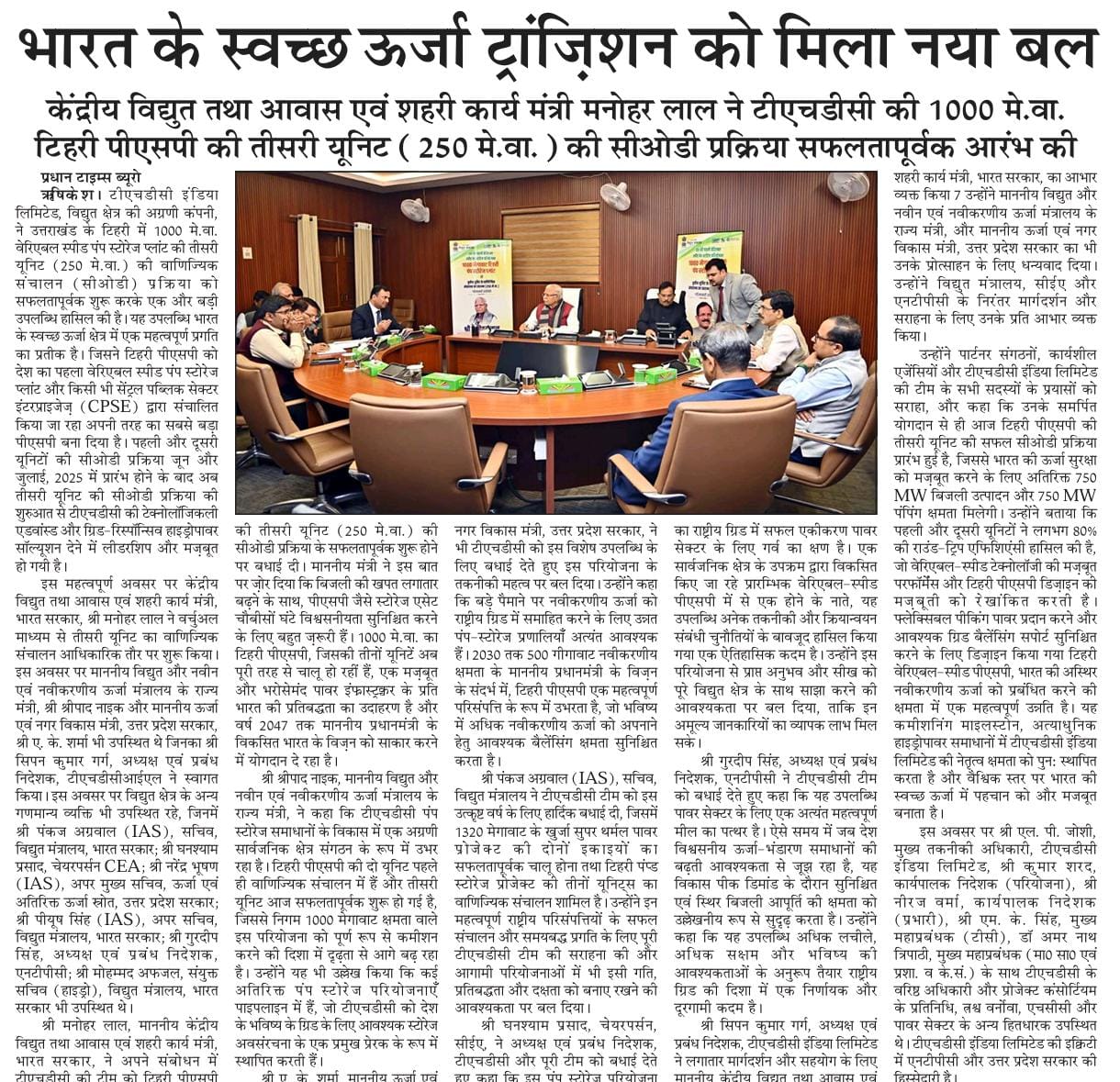 श्री मनोहर लाल, माननीय केंद्रीय विद्युत तथा आवास एवं शहरी कार्य मंत्री, भारत सरकार, ने अपने संबोधन में टीएचडीसी की टीम को टिहरी पीएसपी की तीसरी यूनिट (250 मे.वा.) की सीओडी प्रक्रिया के सफलतापूर्वक शुरू होने पर बधाई दी। माननीय मंत्री ने इस बात पर ज़ोर दिया कि बिजली की खपत लगातार बढ़ने के साथ, पीएसपी जैसे स्टोरेज एसेट चौबीसों घंटे विश्वसनीयता सुनिश्चित करने के लिए बहुत ज़रूरी हैं। 1000 मे.वा. का टिहरी पीएसपी, जिसकी तीनों यूनिटें अब पूरी तरह से चालू हो रहीं हैं, एक मज़बूत और भरोसेमंद पावर इंफ्रास्ट्रक्चर के प्रति भारत की प्रतिबद्धता का उदाहरण है और वर्ष 2047 तक माननीय प्रधानमंत्री के 'विकसित भारत' के विज़न को साकार करने में योगदान दे रहा है।