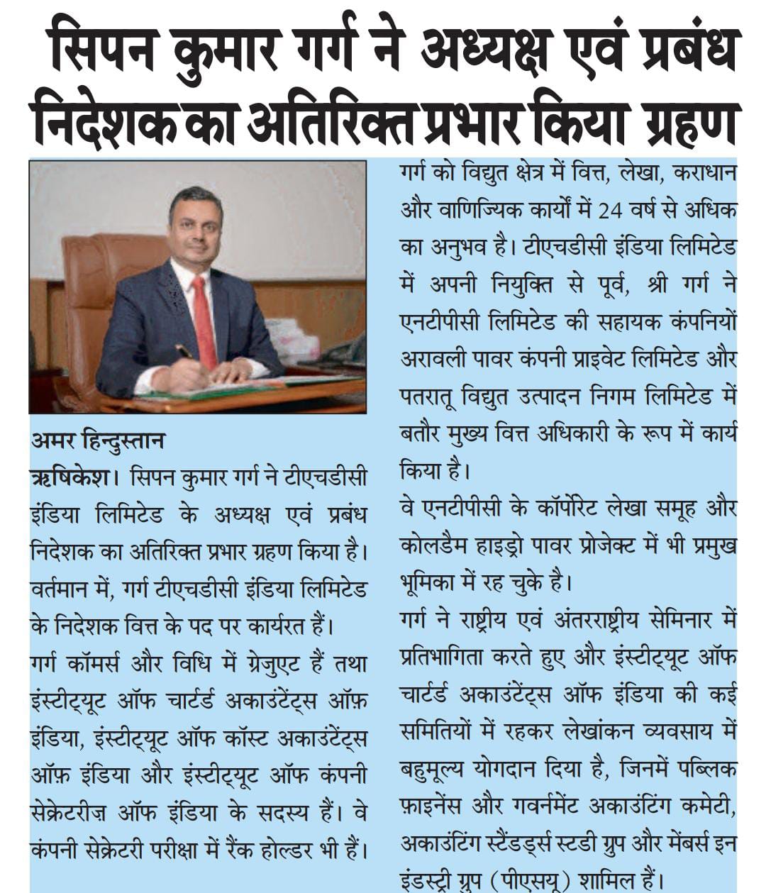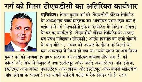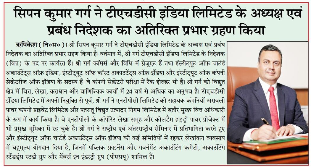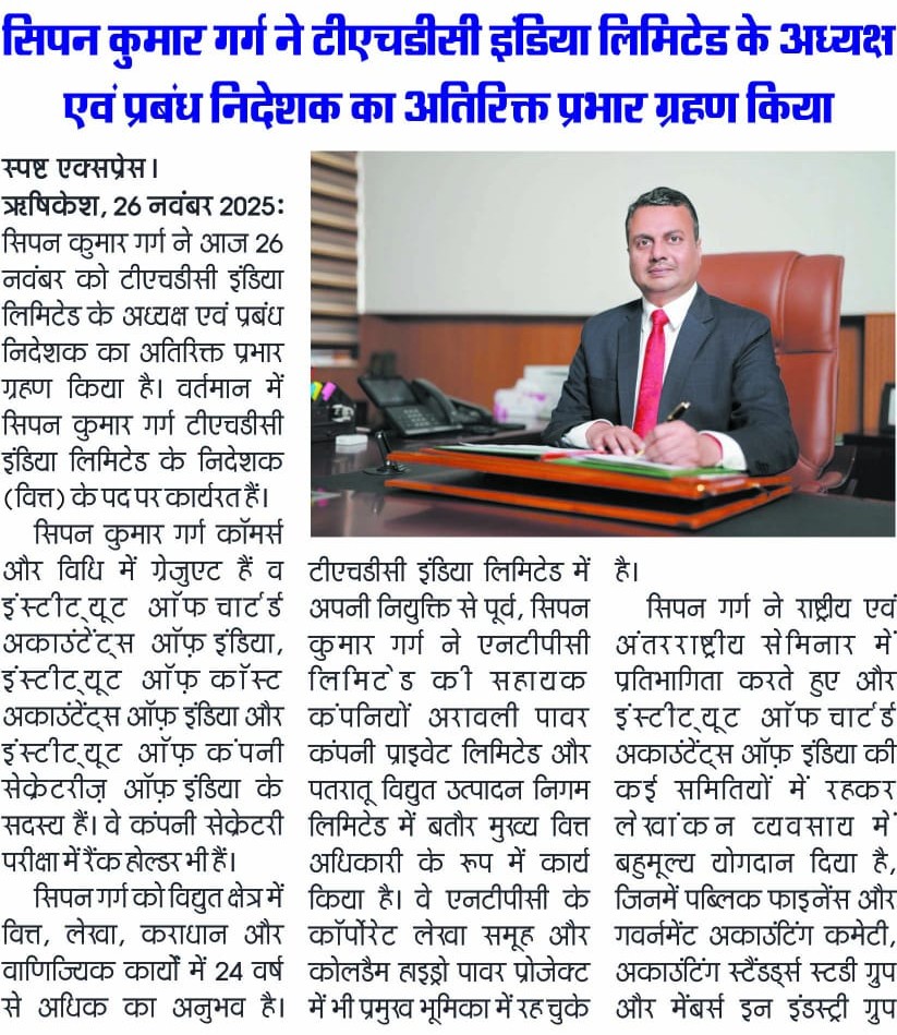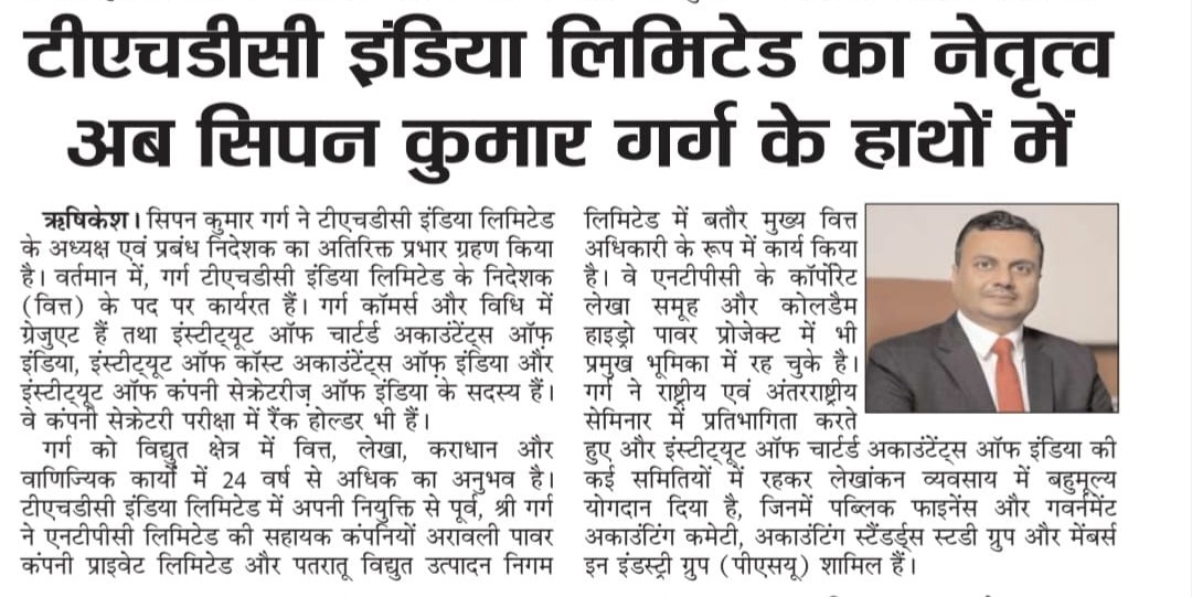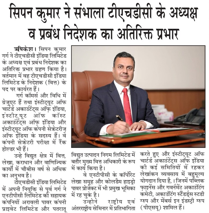 ऋषिकेश, 26 नवंबर, 2025: श्री सिपन कुमार गर्ग ने टीएचडीसी इंडिया लिमिटेड के अध्यक्ष एवं प्रबंध निदेशक का अतिरिक्त प्रभार ग्रहण किया है। वर्तमान में, श्री गर्ग टीएचडीसी इंडिया लिमिटेड के निदेशक (वित्त) के पद पर कार्यरत हैं। श्री गर्ग कॉमर्स और विधि में ग्रेजुएट हैं तथा इंस्टीट्यूट ऑफ़ चार्टर्ड अकाउंटेंट्स ऑफ़ इंडिया, इंस्टीट्यूट ऑफ़ कॉस्ट अकाउंटेंट्स ऑफ़ इंडिया और इंस्टीट्यूट ऑफ़ कंपनी सेक्रेटरीज़ ऑफ़ इंडिया के सदस्य हैं। वे कंपनी सेक्रेटरी परीक्षा में रैंक होल्डर भी हैं।