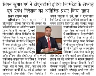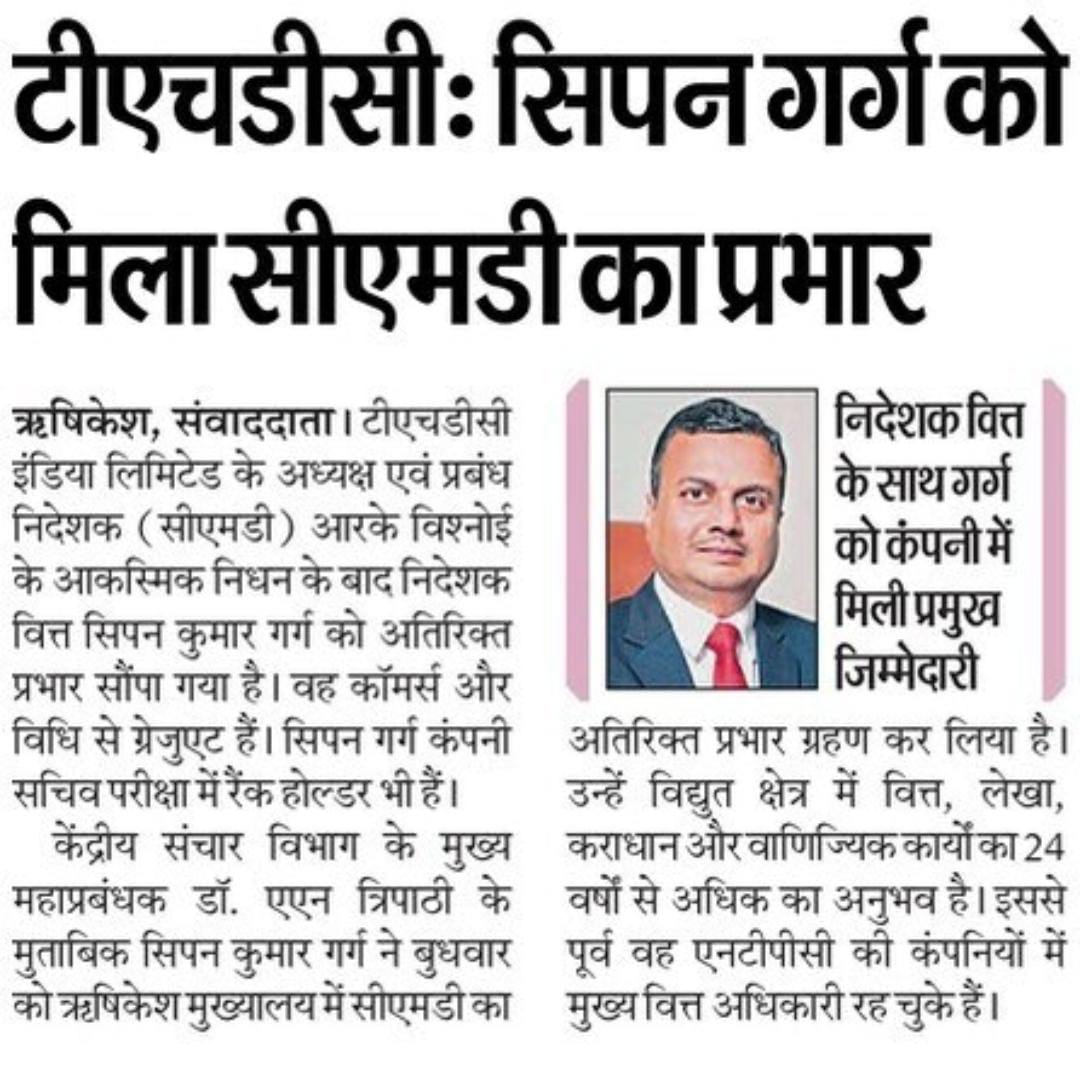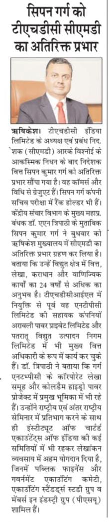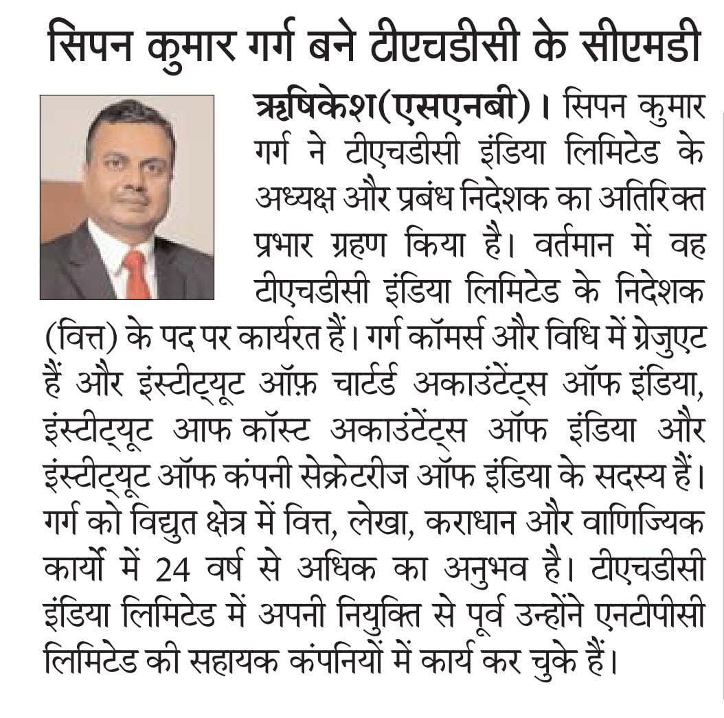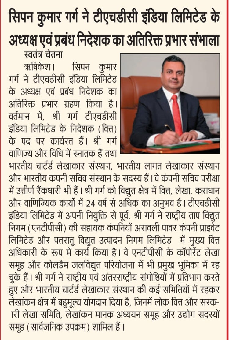 ऋषिकेश, 26 नवंबर, 2025: श्री सिपन कुमार गर्ग ने टीएचडीसी इंडिया लिमिटेड के अध्यक्ष एवं प्रबंध निदेशक का अतिरिक्त प्रभार ग्रहण किया है। वर्तमान में, श्री गर्ग टीएचडीसी इंडिया लिमिटेड के निदेशक (वित्त) के पद पर कार्यरत हैं। श्री गर्ग कॉमर्स और विधि में ग्रेजुएट हैं तथा इंस्टीट्यूट ऑफ़ चार्टर्ड अकाउंटेंट्स ऑफ़ इंडिया, इंस्टीट्यूट ऑफ़ कॉस्ट अकाउंटेंट्स ऑफ़ इंडिया और इंस्टीट्यूट ऑफ़ कंपनी सेक्रेटरीज़ ऑफ़ इंडिया के सदस्य हैं। वे कंपनी सेक्रेटरी परीक्षा में रैंक होल्डर भी हैं।