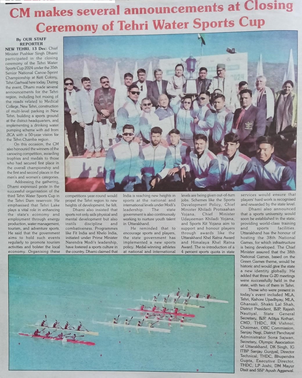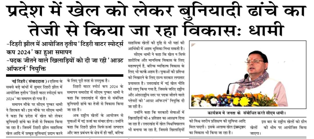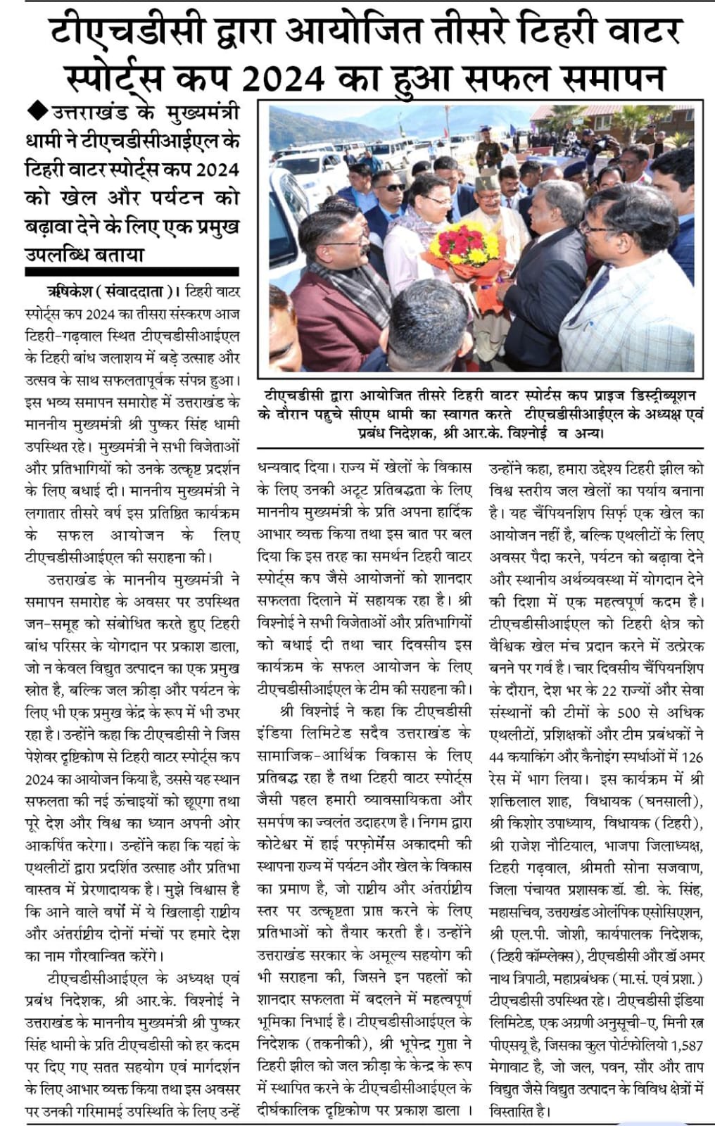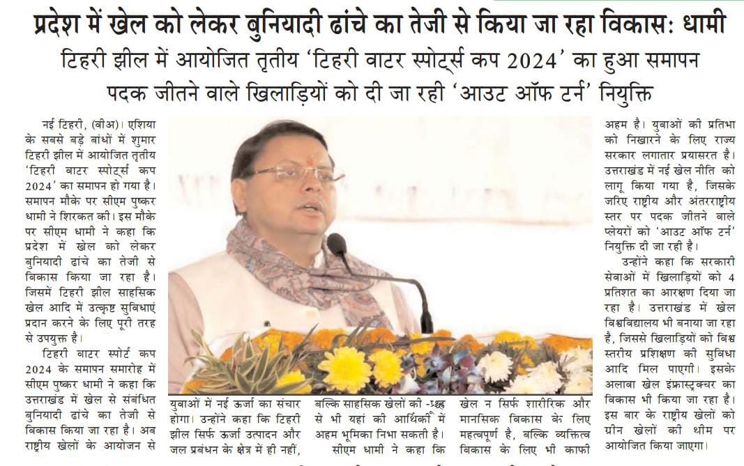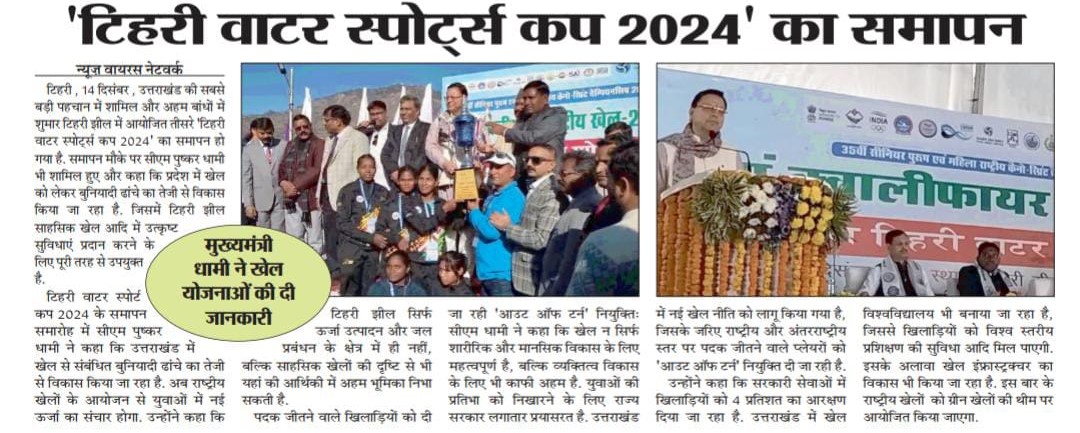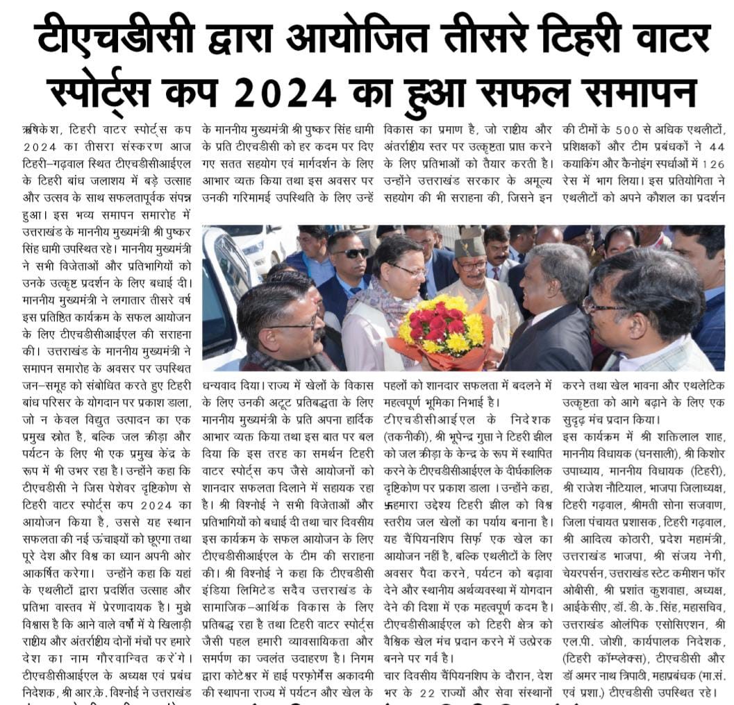 ऋषिकेश, 13-12-2024: टिहरी वाटर स्पोर्ट्स कप 2024 का तीसरा संस्करण आज टिहरी-गढ़वाल स्थित टीएचडीसीआईएल के टिहरी बांध जलाशय में बड़े उत्साह और उत्सव के साथ सफलतापूर्वक संपन्न हुआ। इस भव्य समापन समारोह में उत्तराखंड के माननीय मुख्यमंत्री श्री पुष्कर सिंह धामी उपस्थित रहे। माननीय मुख्यमंत्री ने सभी विजेताओं और प्रतिभागियों को उनके उत्कृष्ट प्रदर्शन के लिए बधाई दी। माननीय मुख्यमंत्री ने लगातार तीसरे वर्ष इस प्रतिष्ठित कार्यक्रम के सफल आयोजन के लिए टीएचडीसीआईएल की सराहना की।