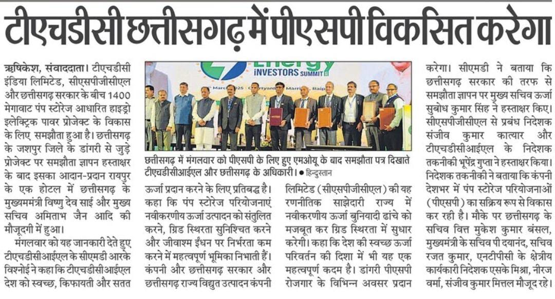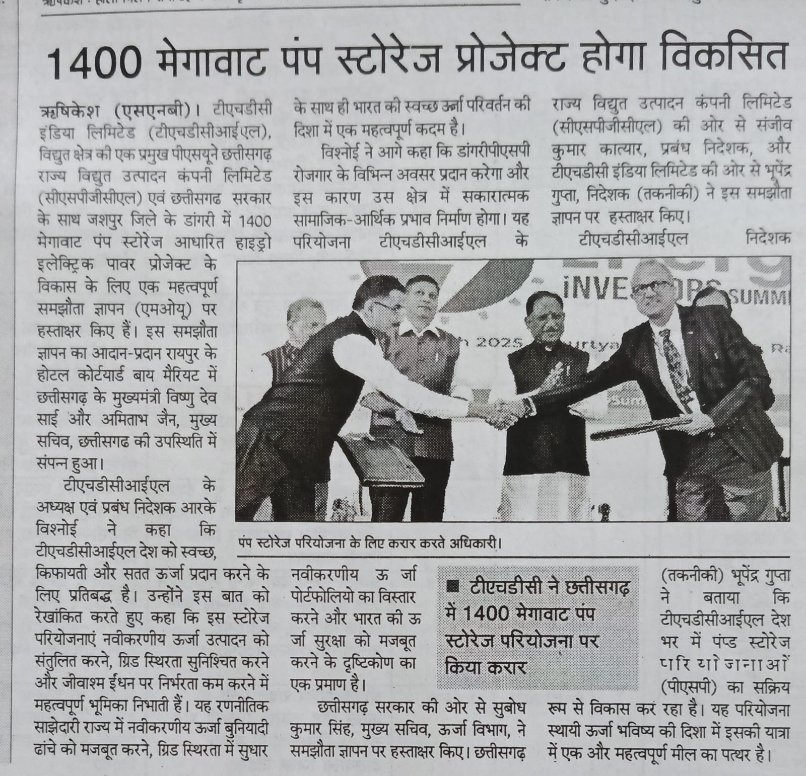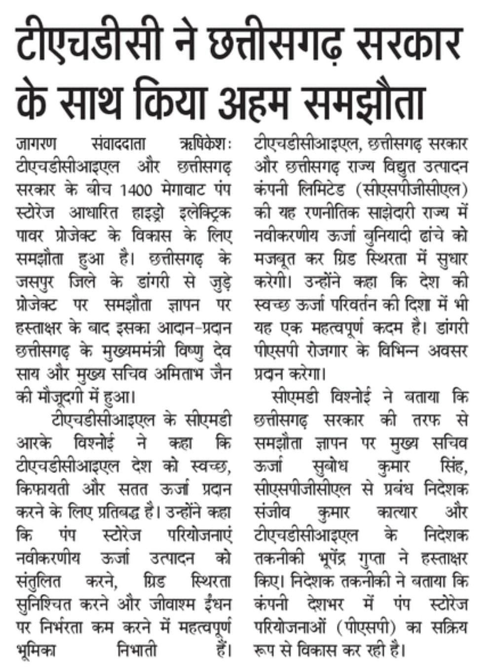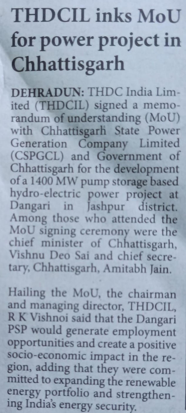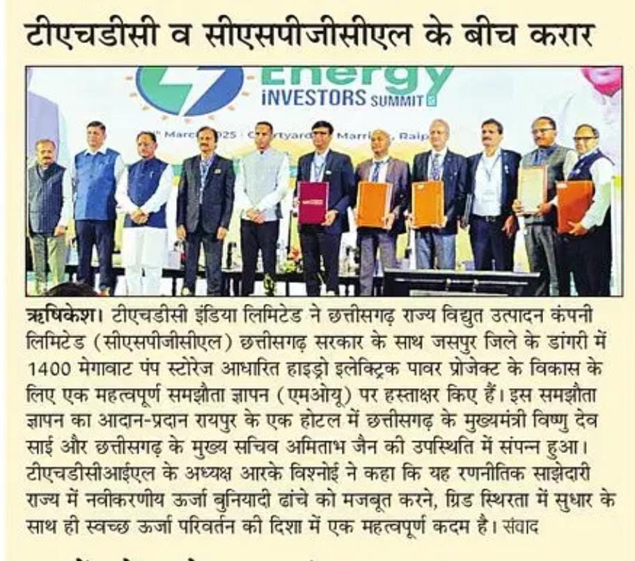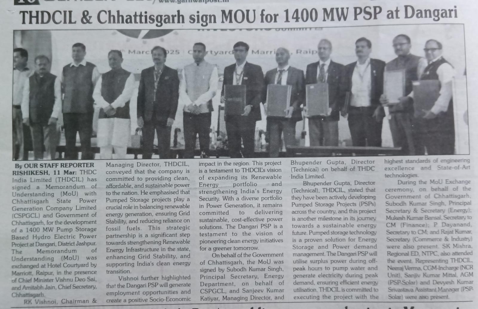 ऋषिकेश 11 मार्च, 2025 - टीएचडीसी इंडिया लिमिटेड (टीएचडीसीआईएल), विद्युत क्षेत्र की एक प्रमुख पीएसयू ने छत्तीसगढ़ राज्य विद्युत उत्पादन कंपनी लिमिटेड (सीएसपीजीसीएल) एवं छत्तीसगढ़ सरकार के साथ जशपुर जिले के डांगरी में 1400 मेगावाट पंप स्टोरेज आधारित हाइड्रो इलेक्ट्रिक पावर प्रोजेक्ट के विकास के लिए एक महत्वपूर्ण समझौता ज्ञापन (एमओयू) पर हस्ताक्षर किए हैं। इस समझौता ज्ञापन का आदान-प्रदान रायपुर के होटल कोर्टयार्ड बाय मैरियट में छत्तीसगढ़ के माननीय मुख्यमंत्री, श्री विष्णु देव साई जी और श्री अमिताभ जैन, मुख्य सचिव, छत्तीसगढ़ की उपस्थिति में सम्पन्न हुआ।