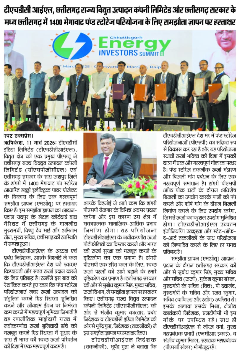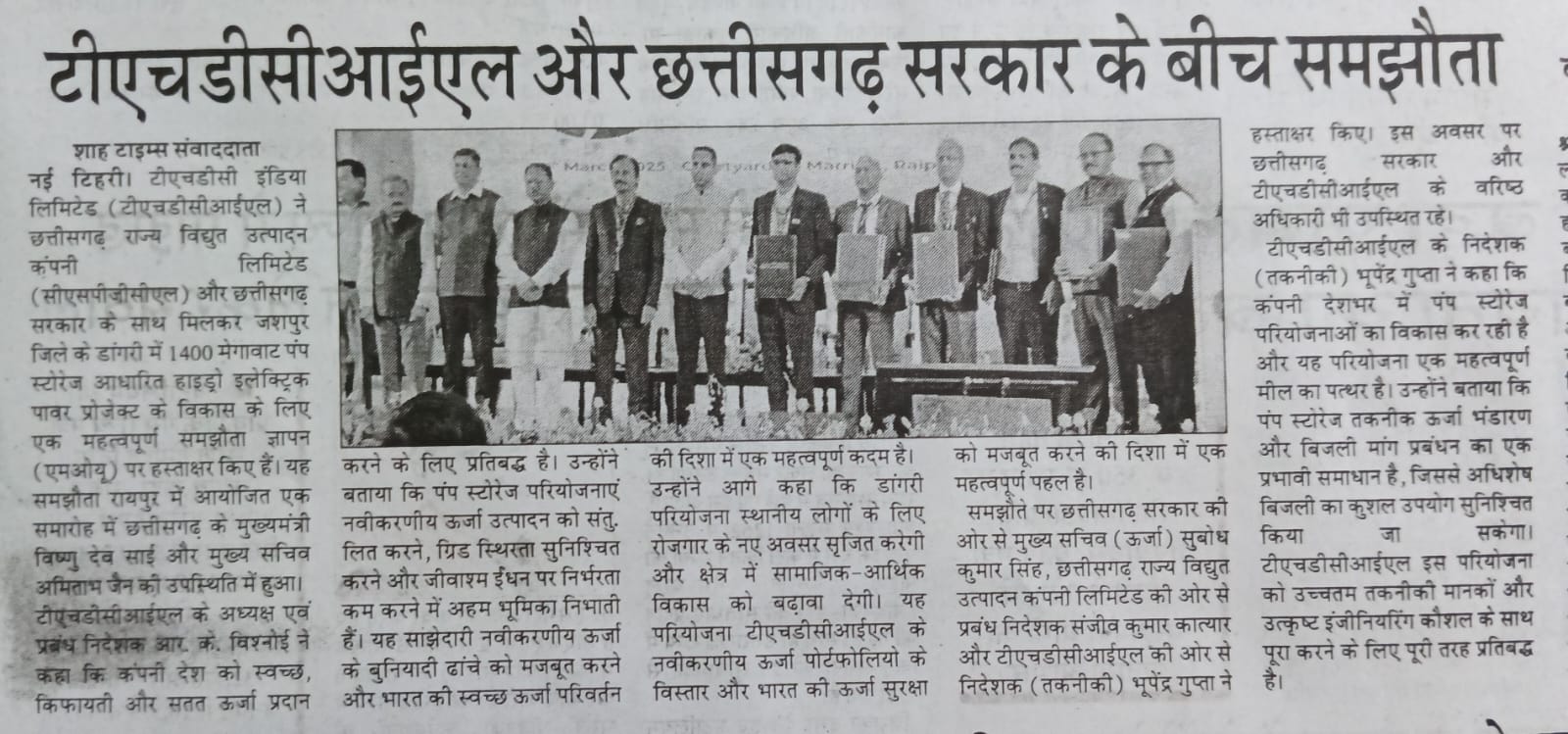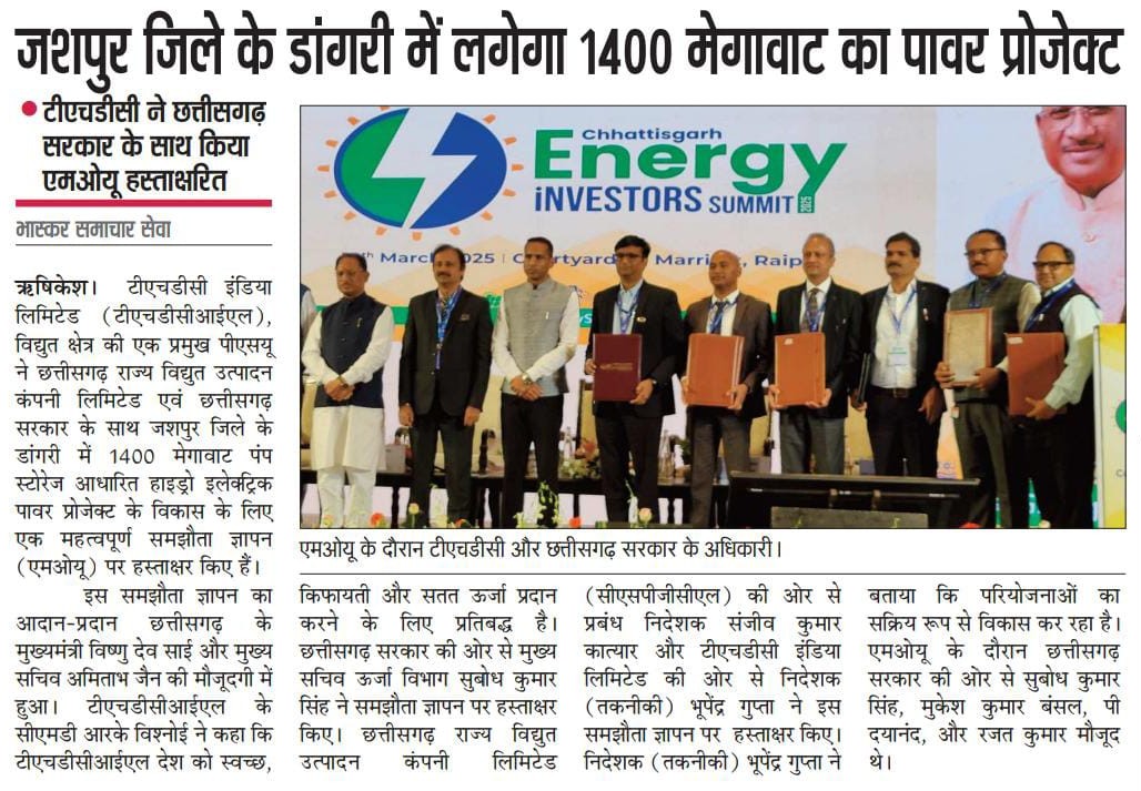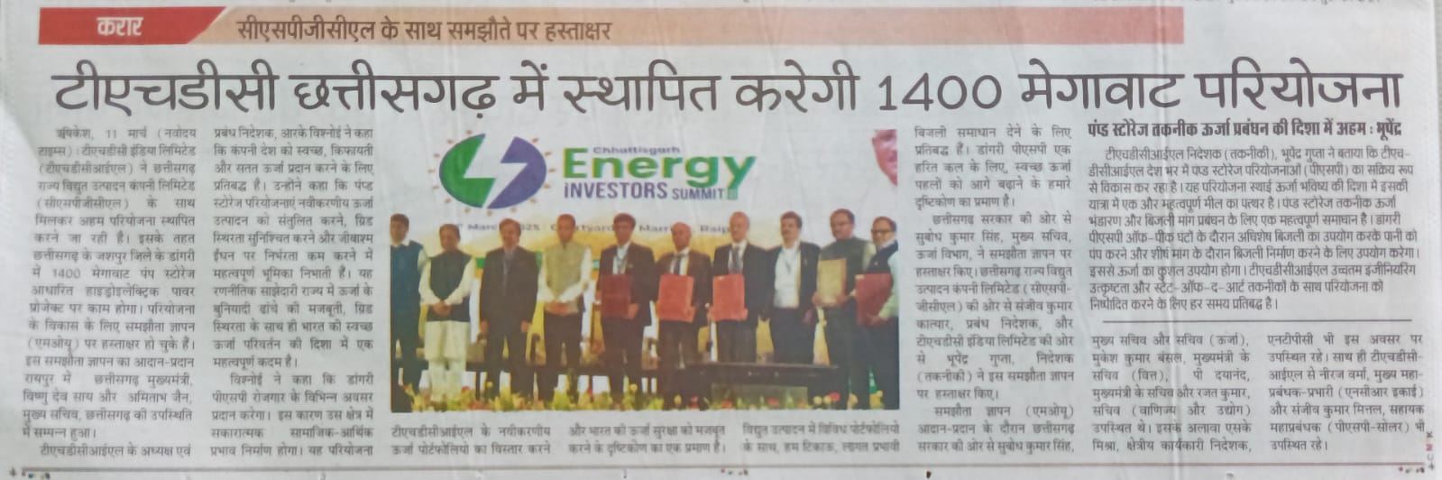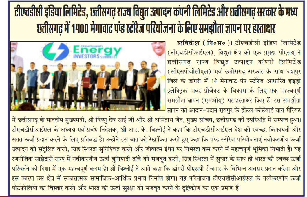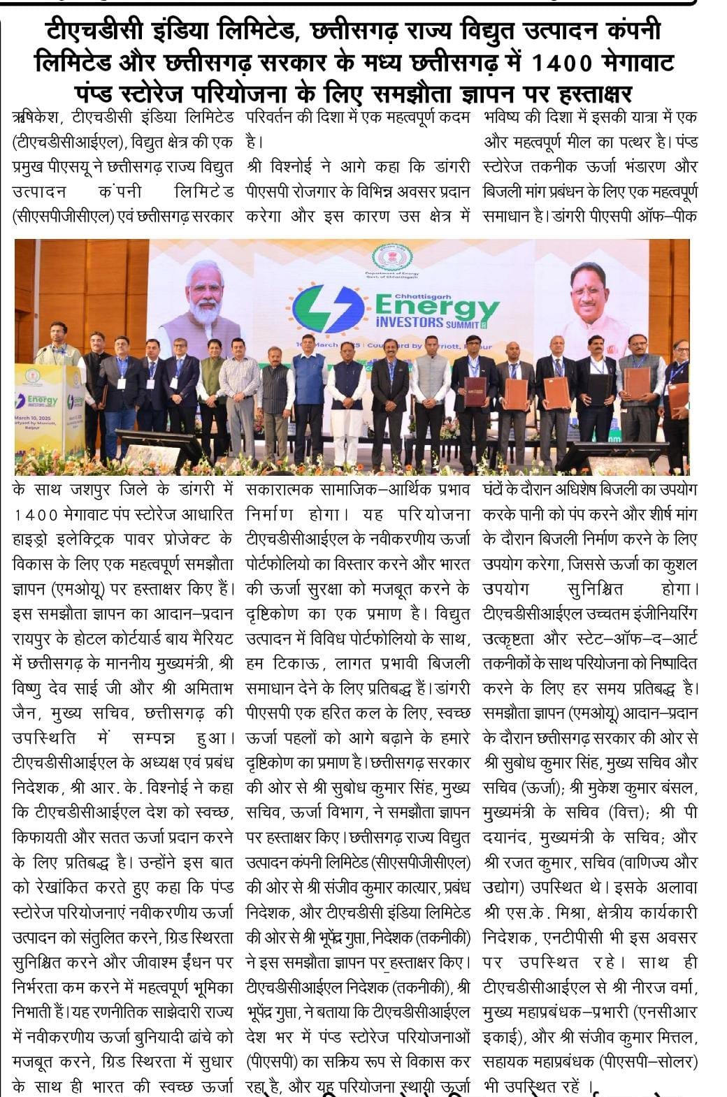 ऋषिकेश 11 मार्च, 2025 - टीएचडीसी इंडिया लिमिटेड (टीएचडीसीआईएल), विद्युत क्षेत्र की एक प्रमुख पीएसयू ने छत्तीसगढ़ राज्य विद्युत उत्पादन कंपनी लिमिटेड (सीएसपीजीसीएल) एवं छत्तीसगढ़ सरकार के साथ जशपुर जिले के डांगरी में 1400 मेगावाट पंप स्टोरेज आधारित हाइड्रो इलेक्ट्रिक पावर प्रोजेक्ट के विकास के लिए एक महत्वपूर्ण समझौता ज्ञापन (एमओयू) पर हस्ताक्षर किए हैं। इस समझौता ज्ञापन का आदान-प्रदान रायपुर के होटल कोर्टयार्ड बाय मैरियट में छत्तीसगढ़ के माननीय मुख्यमंत्री, श्री विष्णु देव साई जी और श्री अमिताभ जैन, मुख्य सचिव, छत्तीसगढ़ की उपस्थिति में सम्पन्न हुआ।