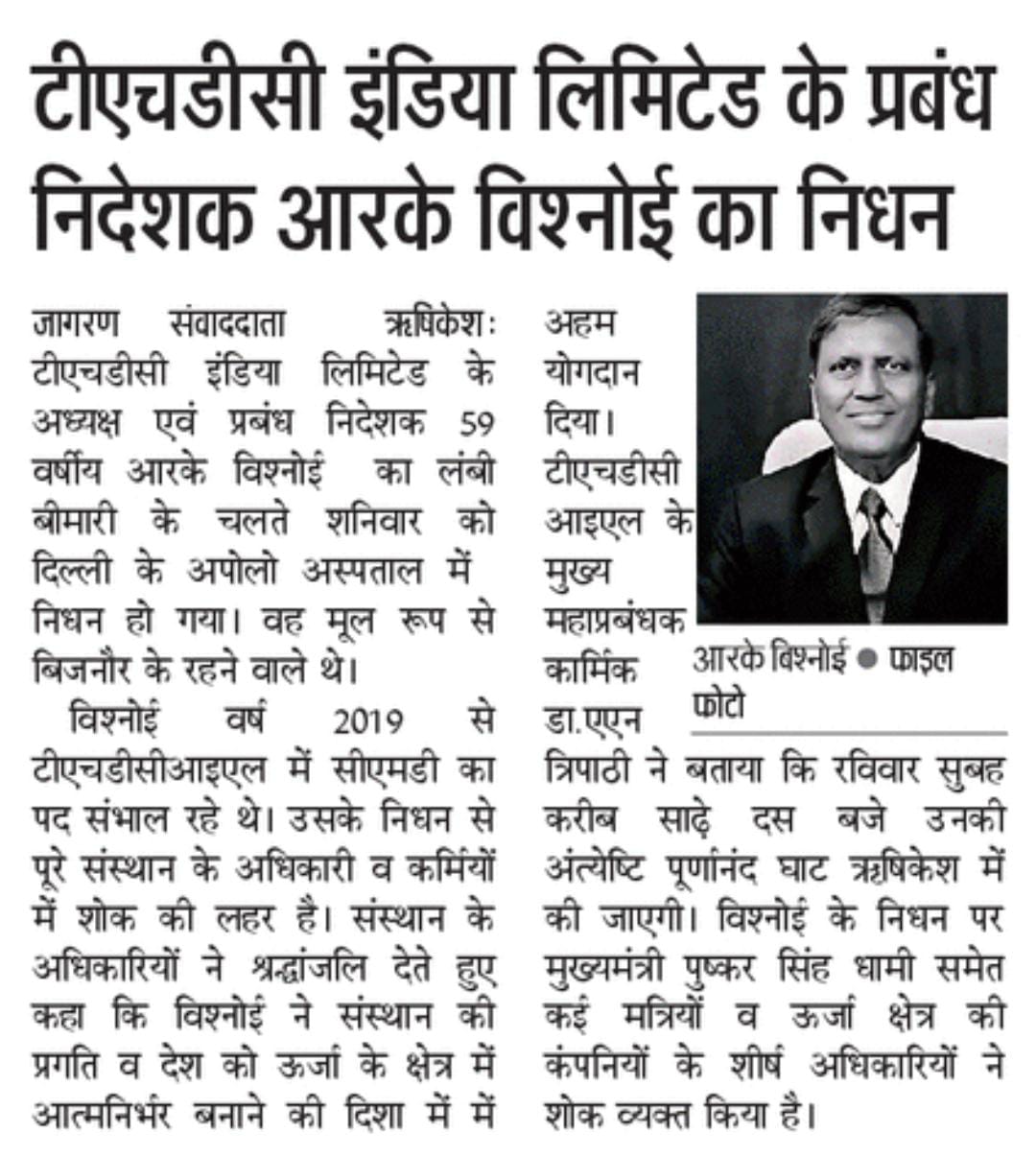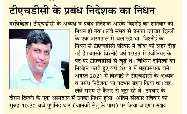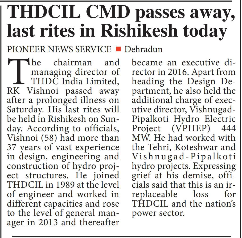 टीएचडीसी इंडिया लिमिटेड के सीएमडी का आकस्मिक निधन, ऊर्जा क्षेत्र ने खोया एक दूरदर्शी स्तंभ