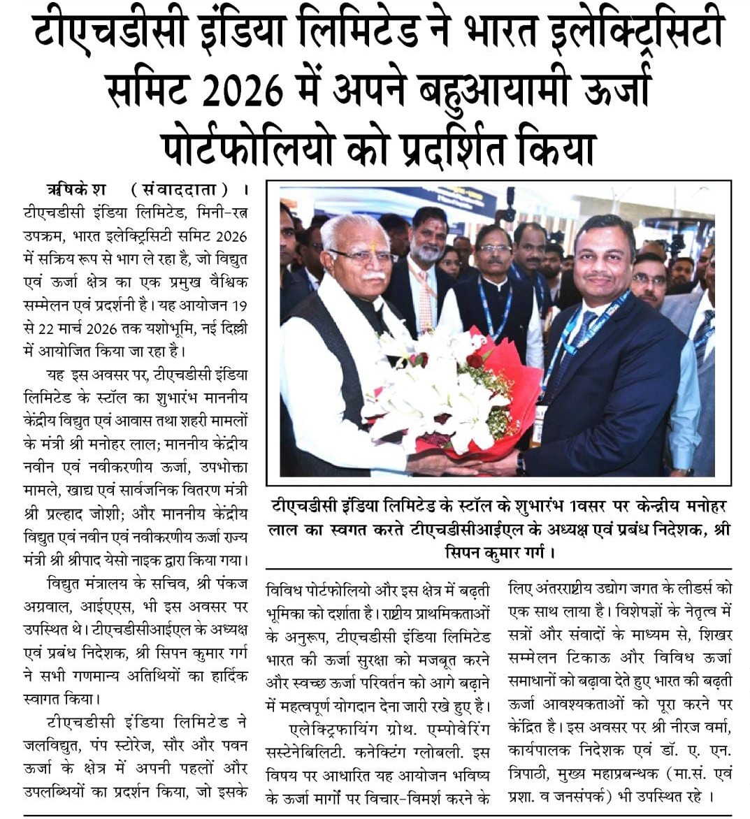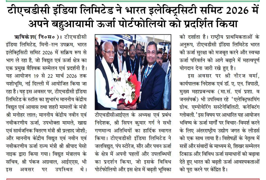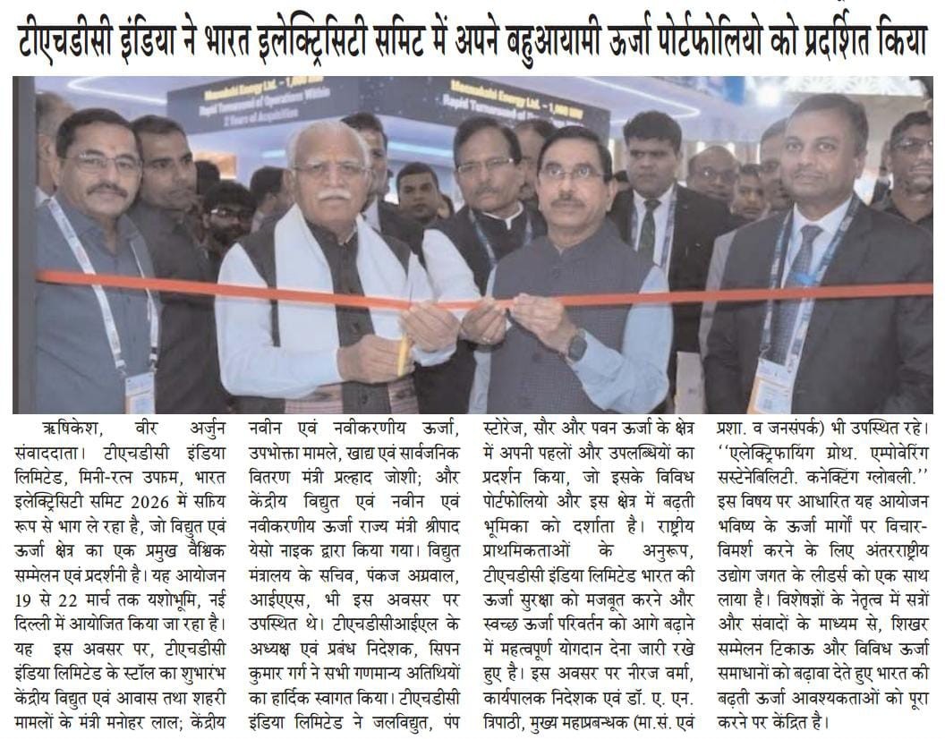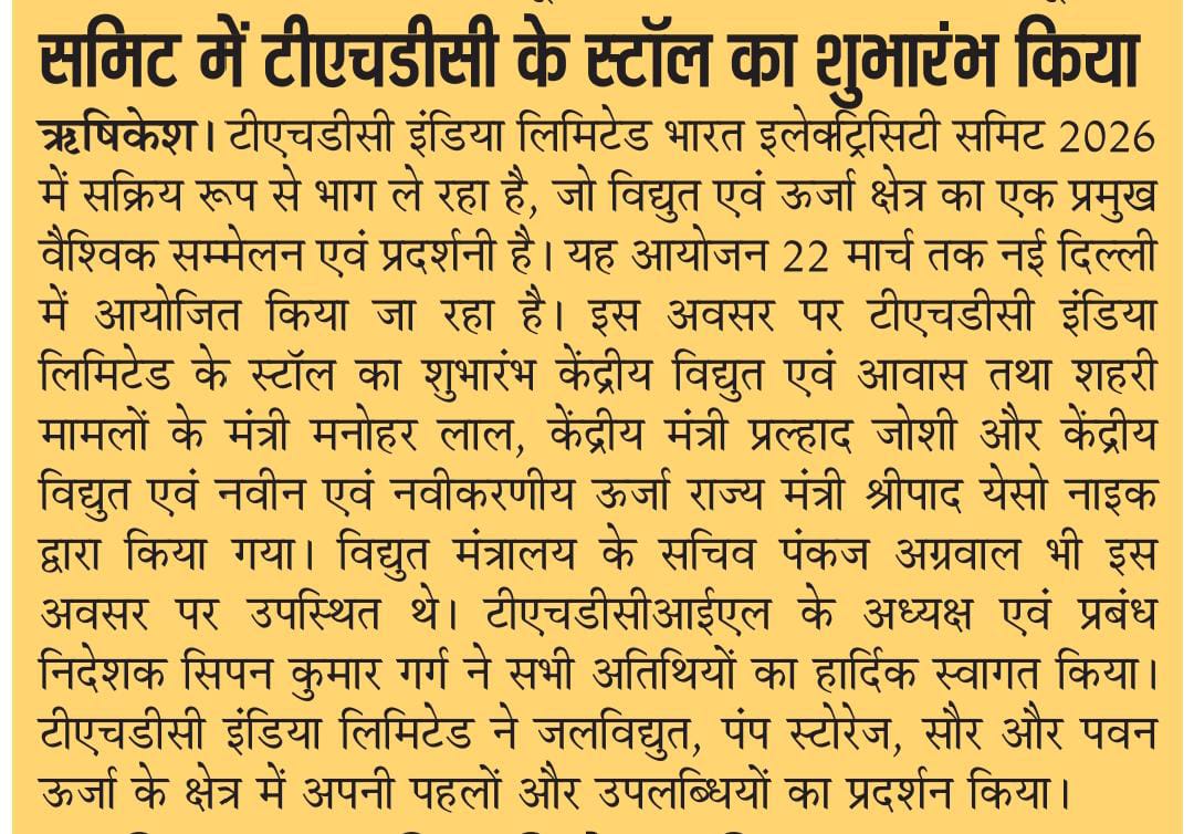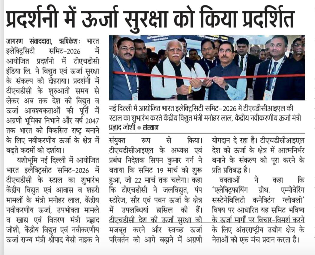ऋषिकेश, 21.03.2026: टीएचडीसी इंडिया लिमिटेड, मिनी-रत्न उपक्रम, भारत इलेक्ट्रिसिटी समिट 2026 में सक्रिय रूप से भाग ले रहा है, जो विद्युत एवं ऊर्जा क्षेत्र का एक प्रमुख वैश्विक सम्मेलन एवं प्रदर्शनी है। यह आयोजन 19 से 22 मार्च 2026 तक यशोभूमि, नई दिल्ली में आयोजित किया जा रहा है। यह इस अवसर पर, टीएचडीसी इंडिया लिमिटेड के स्टॉल का शुभारंभ माननीय केंद्रीय विद्युत एवं आवास तथा शहरी मामलों के मंत्री श्री मनोहर लाल; माननीय केंद्रीय नवीन एवं नवीकरणीय ऊर्जा, उपभोक्ता मामले, खाद्य एवं सार्वजनिक वितरण मंत्री श्री प्रल्हाद जोशी; और माननीय केंद्रीय विद्युत एवं नवीन एवं नवीकरणीय ऊर्जा राज्य मंत्री श्री श्रीपाद येसो नाइक द्वारा किया गया। विद्युत मंत्रालय के सचिव, श्री पंकज अग्रवाल, आईएएस, भी इस अवसर पर उपस्थित थे। टीएचडीसीआईएल के अध्यक्ष एवं प्रबंध निदेशक, श्री सिपन कुमार गर्ग ने सभी गणमान्य अतिथियों का हार्दिक स्वागत किया। टीएचडीसी इंडिया लिमिटेड ने जलविद्युत, पंप स्टोरेज, सौर और पवन ऊर्जा के क्षेत्र में अपनी पहलों और उपलब्धियों का प्रदर्शन किया, जो इसके विविध पोर्टफोलियो और इस क्षेत्र में बढ़ती भूमिका को दर्शाता है। राष्ट्रीय प्राथमिकताओं के अनुरूप, टीएचडीसी इंडिया लिमिटेड भारत की ऊर्जा सुरक्षा को मजबूत करने और स्वच्छ ऊर्जा परिवर्तन को आगे बढ़ाने में महत्वपूर्ण योगदान देना जारी रखे हुए है। इस अवसर पर श्री नीरज वर्मा, कार्यपालक निदेशक एवं डॉ. ए. एन. त्रिपाठी, मुख्य महाप्रबन्धक (मा.सं. एवं प्रशा. व जनसंपर्क) भी उपस्थित रहे | “एलेक्ट्रिफायिंग ग्रोथ. एम्पोवेरिंग सस्टेनेबिलिटी. कनेक्टिंग ग्लोबली.” इस विषय पर आधारित यह आयोजन भविष्य के ऊर्जा मार्गों पर विचार-विमर्श करने के लिए अंतरराष्ट्रीय उद्योग जगत के लीडर्स को एक साथ लाया है। विशेषज्ञों के नेतृत्व में सत्रों और संवादों के माध्यम से, शिखर सम्मेलन टिकाऊ और विविध ऊर्जा समाधानों को बढ़ावा देते हुए भारत की बढ़ती ऊर्जा आवश्यकताओं को पूरा करने पर केंद्रित है।