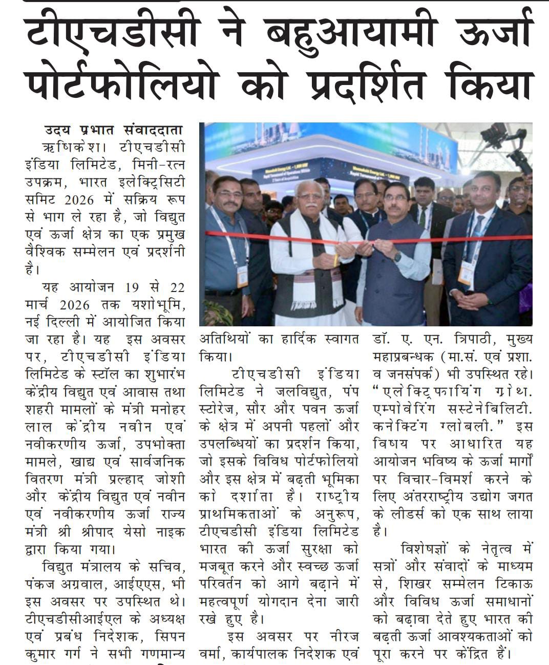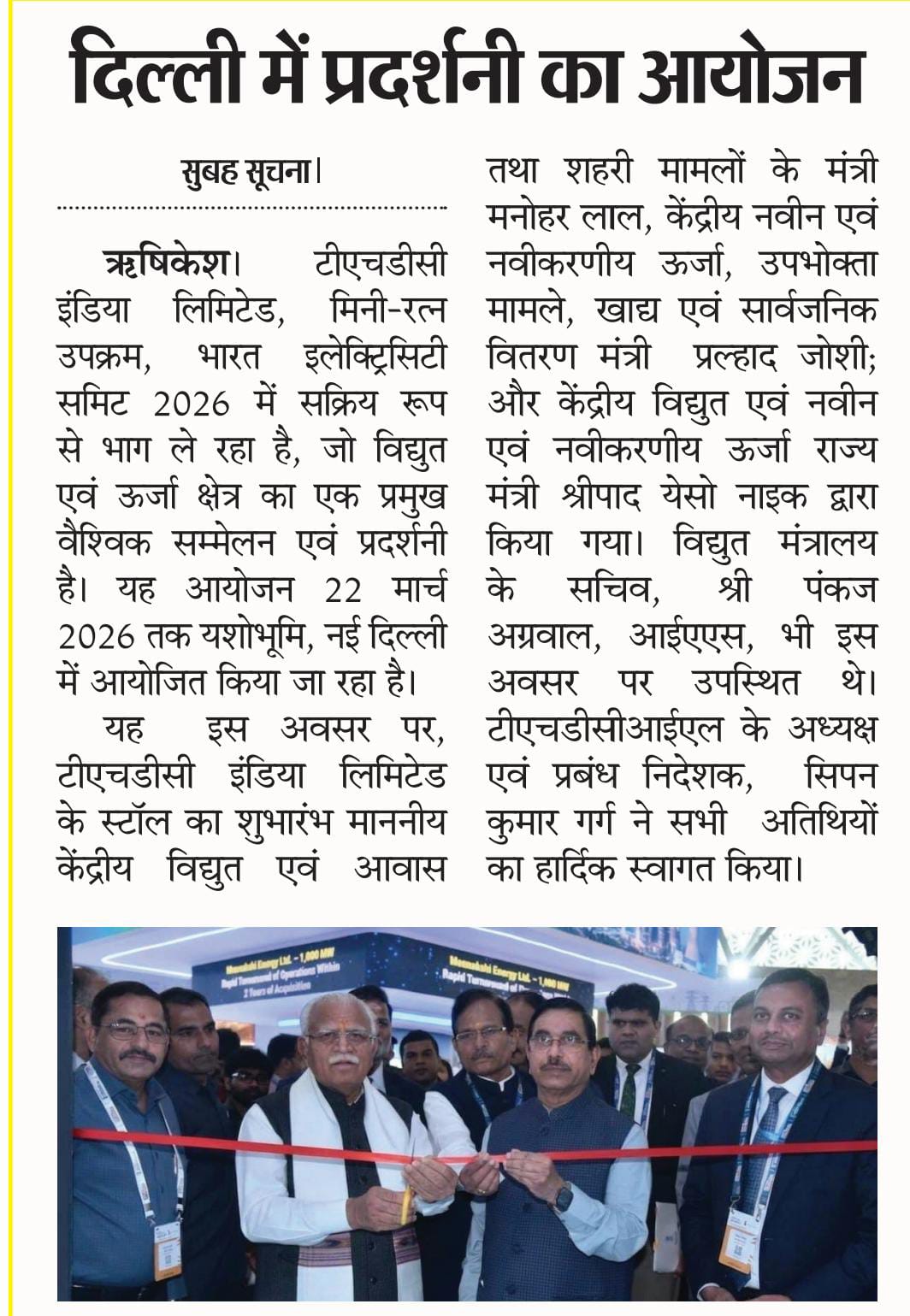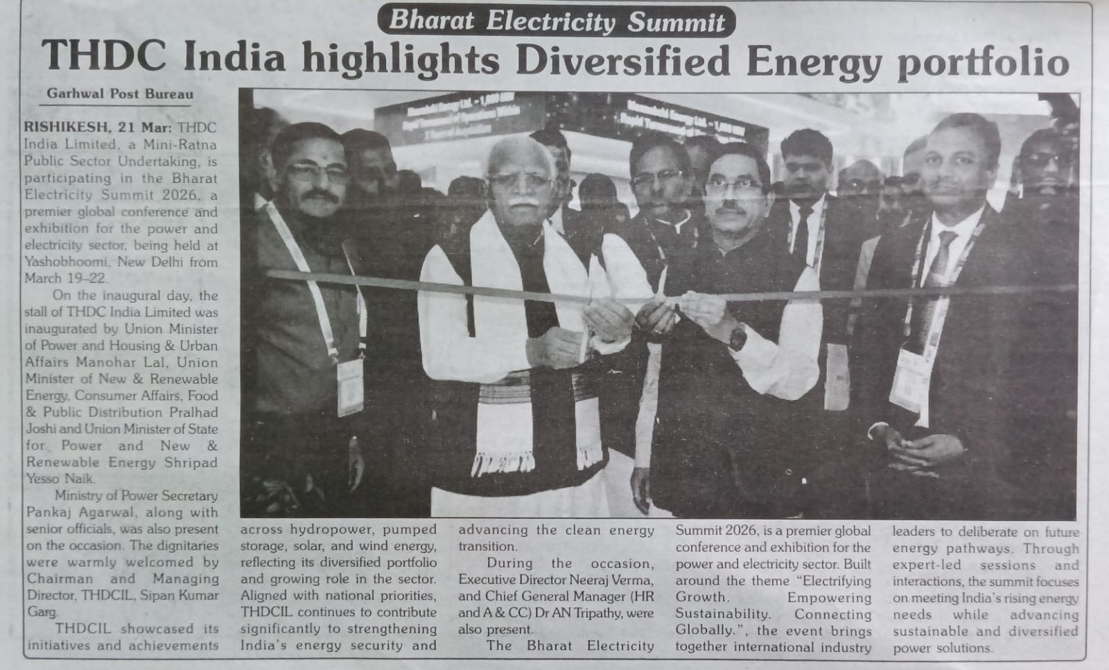 ऋषिकेश, 21.03.2026: टीएचडीसी इंडिया लिमिटेड, मिनी-रत्न उपक्रम, भारत इलेक्ट्रिसिटी समिट 2026 में सक्रिय रूप से भाग ले रहा है, जो विद्युत एवं ऊर्जा क्षेत्र का एक प्रमुख वैश्विक सम्मेलन एवं प्रदर्शनी है। यह आयोजन 19 से 22 मार्च 2026 तक यशोभूमि, नई दिल्ली में आयोजित किया जा रहा है। यह इस अवसर पर, टीएचडीसी इंडिया लिमिटेड के स्टॉल का शुभारंभ माननीय केंद्रीय विद्युत एवं आवास तथा शहरी मामलों के मंत्री श्री मनोहर लाल; माननीय केंद्रीय नवीन एवं नवीकरणीय ऊर्जा, उपभोक्ता मामले, खाद्य एवं सार्वजनिक वितरण मंत्री श्री प्रल्हाद जोशी; और माननीय केंद्रीय विद्युत एवं नवीन एवं नवीकरणीय ऊर्जा राज्य मंत्री श्री श्रीपाद येसो नाइक द्वारा किया गया। विद्युत मंत्रालय के सचिव, श्री पंकज अग्रवाल, आईएएस, भी इस अवसर पर उपस्थित थे। टीएचडीसीआईएल के अध्यक्ष एवं प्रबंध निदेशक, श्री सिपन कुमार गर्ग ने सभी गणमान्य अतिथियों का हार्दिक स्वागत किया। टीएचडीसी इंडिया लिमिटेड ने जलविद्युत, पंप स्टोरेज, सौर और पवन ऊर्जा के क्षेत्र में अपनी पहलों और उपलब्धियों का प्रदर्शन किया, जो इसके विविध पोर्टफोलियो और इस क्षेत्र में बढ़ती भूमिका को दर्शाता है। राष्ट्रीय प्राथमिकताओं के अनुरूप, टीएचडीसी इंडिया लिमिटेड भारत की ऊर्जा सुरक्षा को मजबूत करने और स्वच्छ ऊर्जा परिवर्तन को आगे बढ़ाने में महत्वपूर्ण योगदान देना जारी रखे हुए है। इस अवसर पर श्री नीरज वर्मा, कार्यपालक निदेशक एवं डॉ. ए. एन. त्रिपाठी, मुख्य महाप्रबन्धक (मा.सं. एवं प्रशा. व जनसंपर्क) भी उपस्थित रहे | “एलेक्ट्रिफायिंग ग्रोथ. एम्पोवेरिंग सस्टेनेबिलिटी. कनेक्टिंग ग्लोबली.” इस विषय पर आधारित यह आयोजन भविष्य के ऊर्जा मार्गों पर विचार-विमर्श करने के लिए अंतरराष्ट्रीय उद्योग जगत के लीडर्स को एक साथ लाया है। विशेषज्ञों के नेतृत्व में सत्रों और संवादों के माध्यम से, शिखर सम्मेलन टिकाऊ और विविध ऊर्जा समाधानों को बढ़ावा देते हुए भारत की बढ़ती ऊर्जा आवश्यकताओं को पूरा करने पर केंद्रित है।