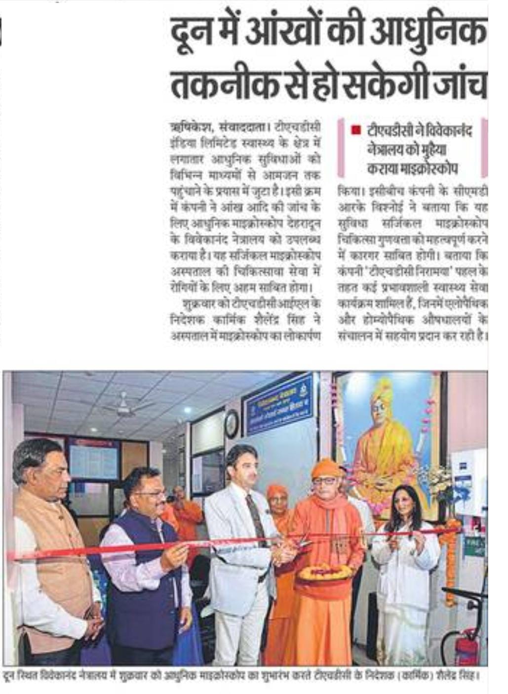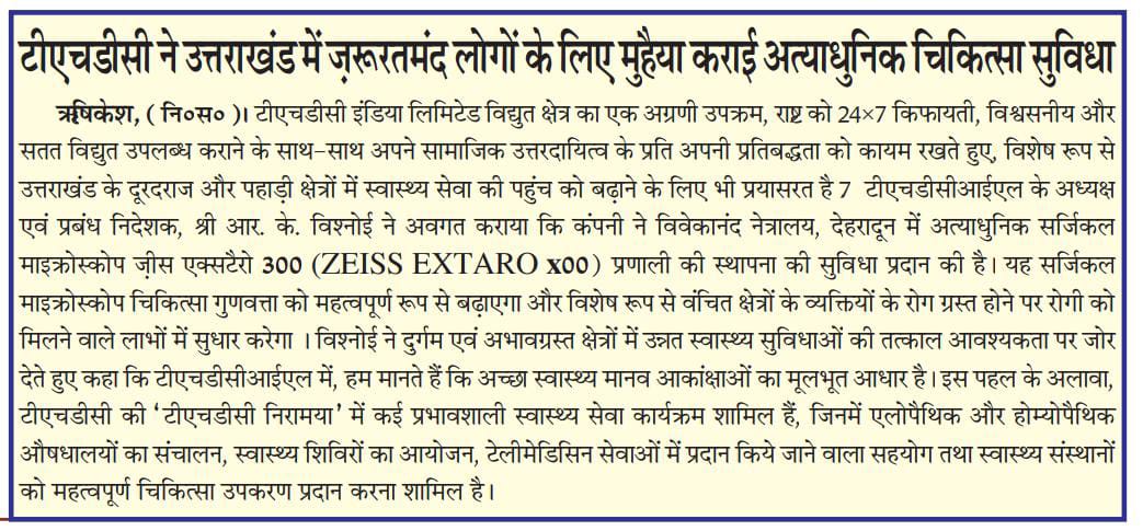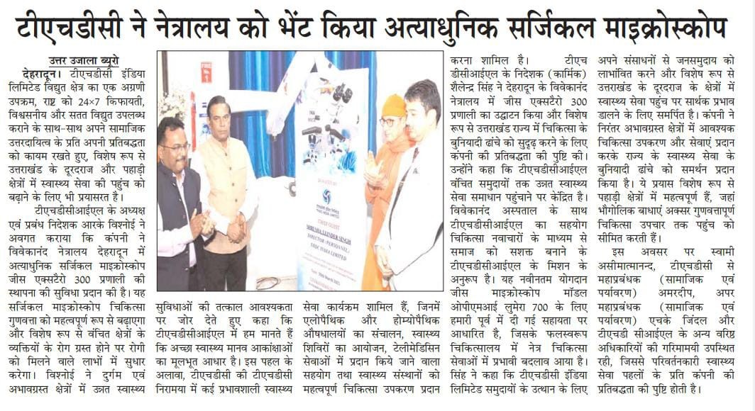 टीएचडीसीआईएल के निदेशक (कार्मिक), श्री शैलेन्द्र सिंह ने देहरादून के विवेकानंद नेत्रालय में ज़ीस एक्सटैरो 300 (ZEISS EXTARO 300) प्रणाली का उद्घाटन किया और विशेष रूप से उत्तराखंड राज्य में चिकित्सा के बुनियादी ढांचे को सुदृढ़ करने के लिए कंपनी की प्रतिबद्धता की पुष्टि की। उन्होंने कहा कि “टीएचडीसीआईएल वंचित समुदायों तक उन्नत स्वास्थ्य सेवा समाधान पहुंचाने पर केंद्रित है। विवेकानंद अस्पताल के साथ टीएचडीसीआईएल का सहयोग चिकित्सा नवाचारों के माध्यम से समाज को सशक्त बनाने के टीएचडीसीआईएल के मिशन के अनुरूप है। यह नवीनतम योगदान ज़ीस माइक्रोस्कोप मॉडल ओपीएमआई लुमेरा 700 के लिए हमारी पूर्व में दी गई सहायता पर आधारित है, जिसके फलस्वरूप चिकित्सालय में नेत्र चिकित्सा सेवाओं में प्रभावी बदलाव आया है।