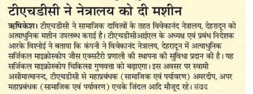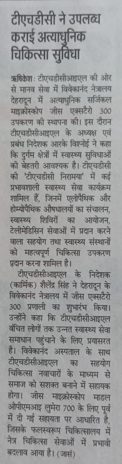 टीएचडीसीआईएल के अध्यक्ष एवं प्रबंध निदेशक, श्री आर. के. विश्नोई ने अवगत कराया कि कंपनी ने विवेकानंद नेत्रालय, देहरादून में अत्याधुनिक सर्जिकल माइक्रोस्कोप ज़ीस एक्सटैरो 300 (ZEISS EXTARO 300) प्रणाली की स्थापना की सुविधा प्रदान की है। यह सर्जिकल माइक्रोस्कोप चिकित्सा गुणवत्ता को महत्वपूर्ण रूप से बढ़ाएगा और विशेष रूप से वंचित क्षेत्रों के व्यक्तियों के रोग ग्रस्त होने पर रोगी को मिलने वाले लाभों में सुधार करेगा।