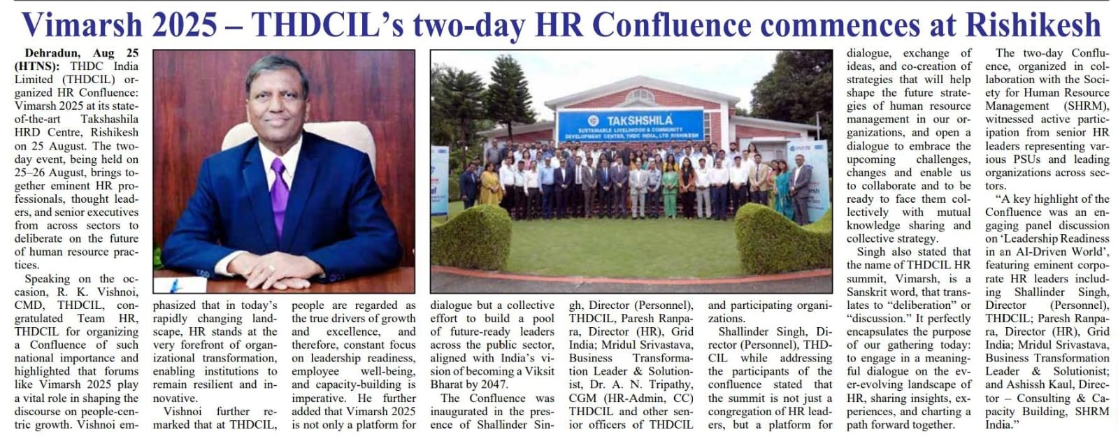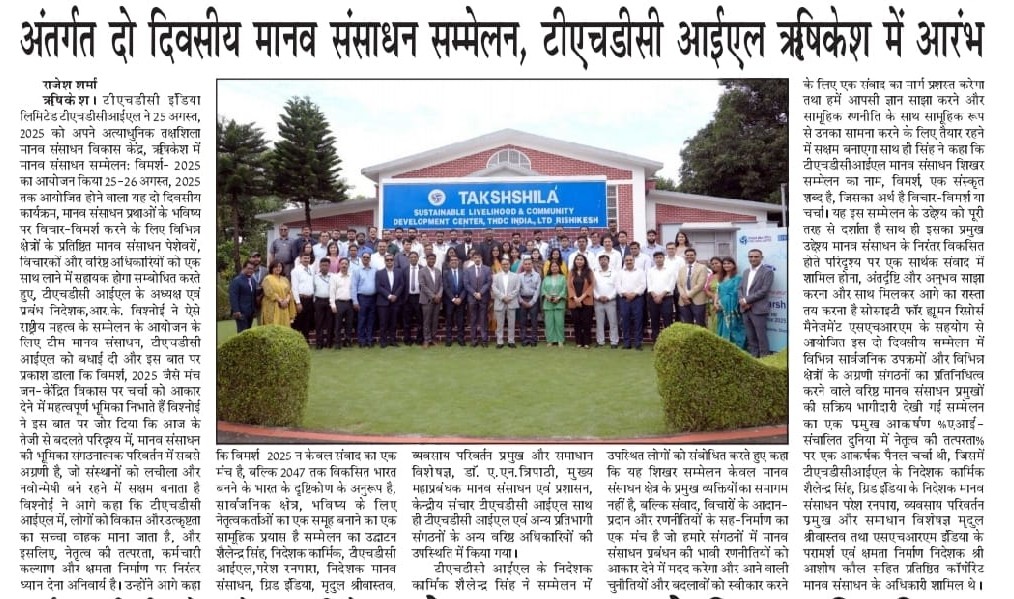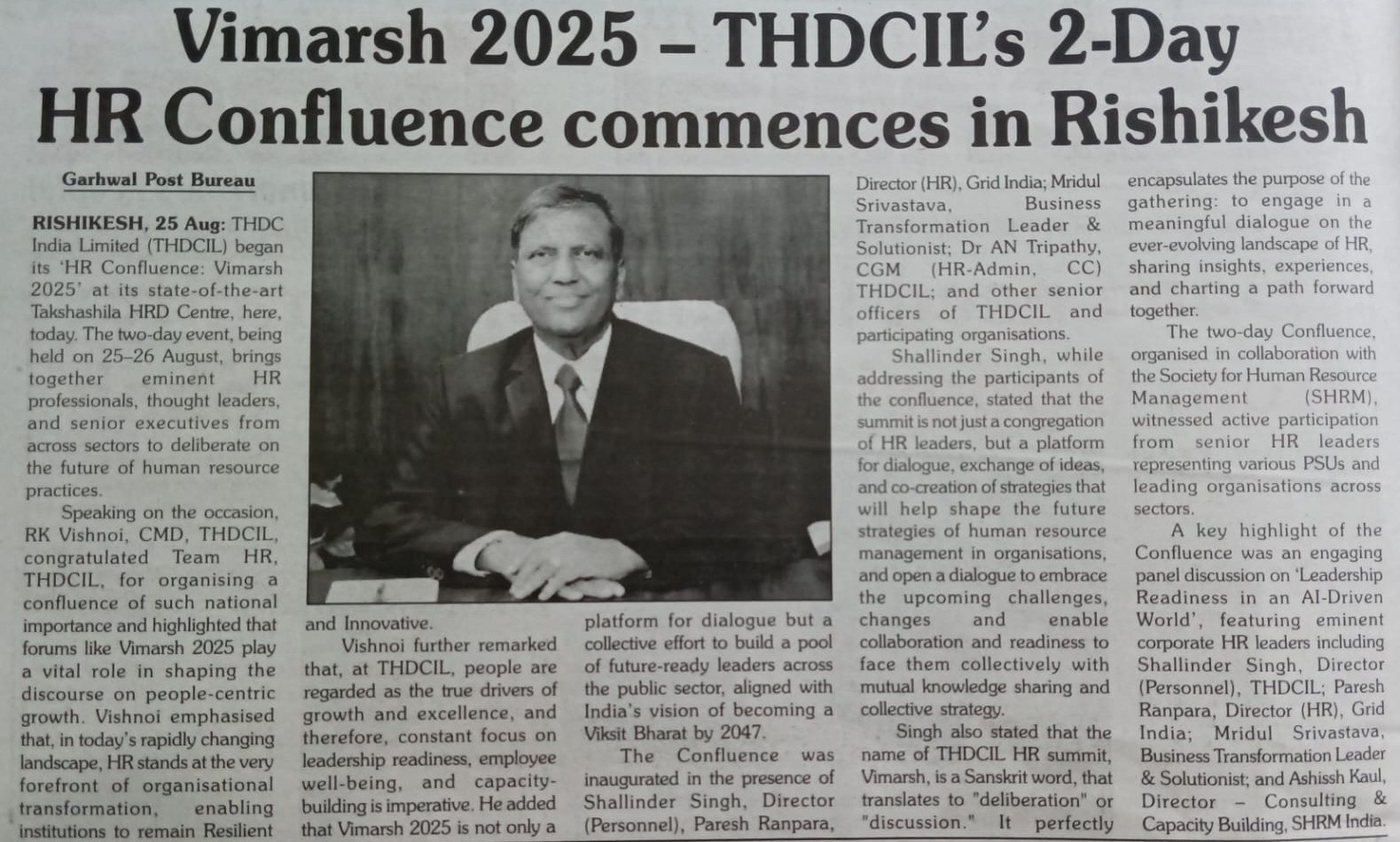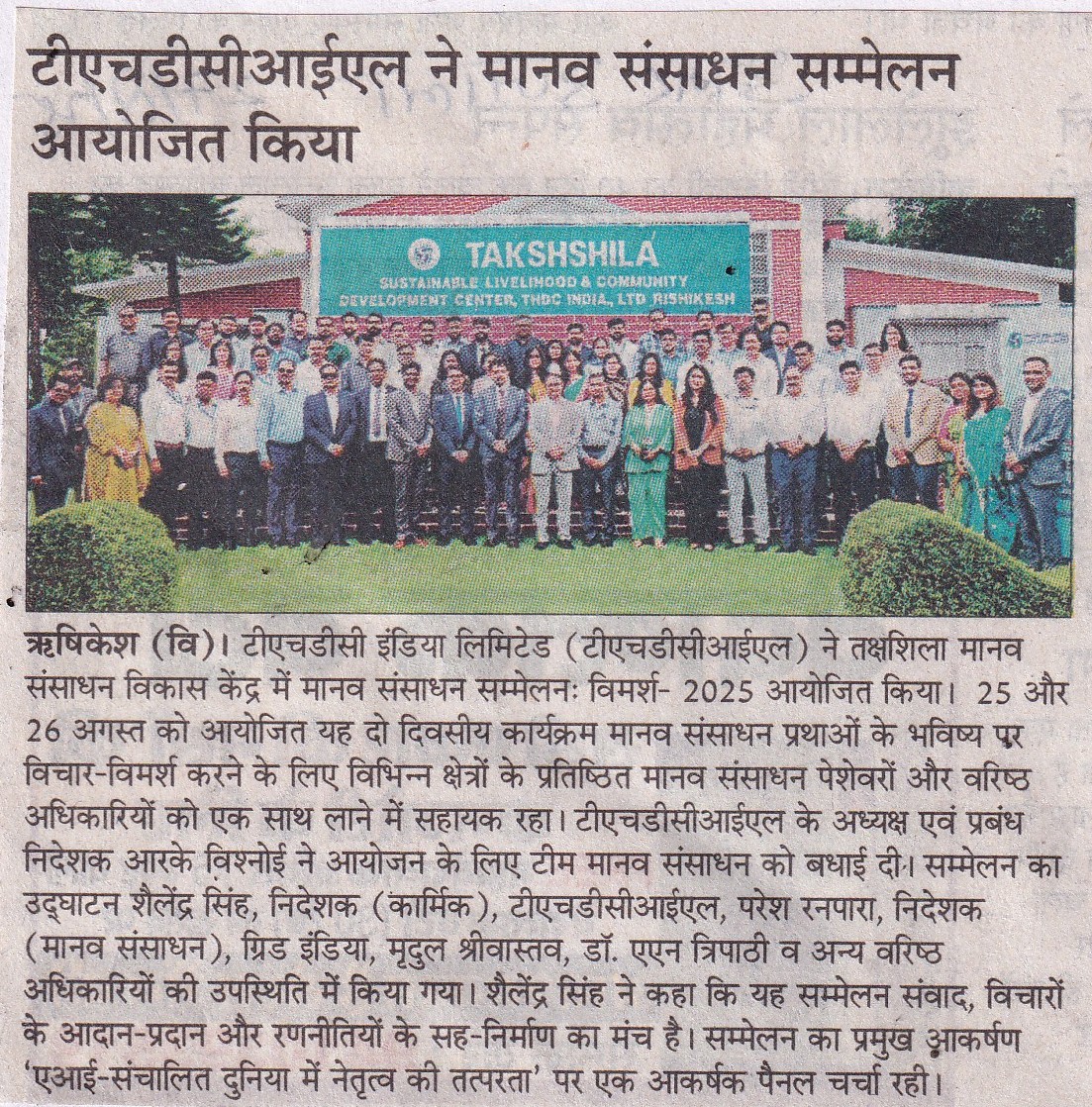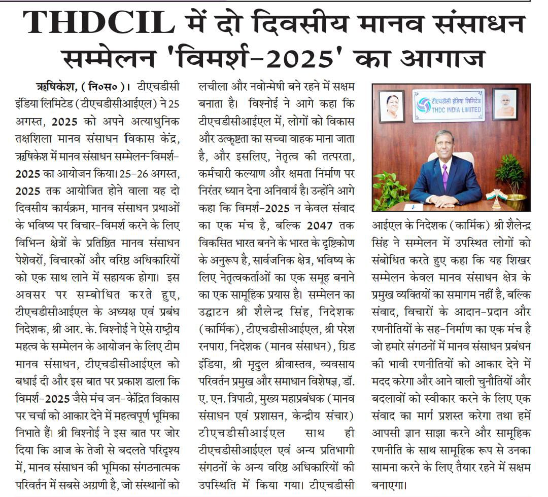ऋषिकेश, 25 अगस्त, 2025: टीएचडीसी इंडिया लिमिटेड (टीएचडीसीआईएल) ने 25 अगस्त, 2025 को अपने अत्याधुनिक तक्षशिला मानव संसाधन विकास केंद्र, ऋषिकेश में मानव संसाधन सम्मेलन: विमर्श- 2025 का आयोजन किया। 25-26 अगस्त, 2025 तक आयोजित होने वाला यह दो दिवसीय कार्यक्रम, मानव संसाधन प्रथाओं के भविष्य पर विचार-विमर्श करने के लिए विभिन्न क्षेत्रों के प्रतिष्ठित मानव संसाधन पेशेवरों, विचारकों और वरिष्ठ अधिकारियों को एक साथ लाने में सहायक होगा।