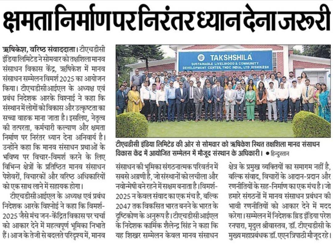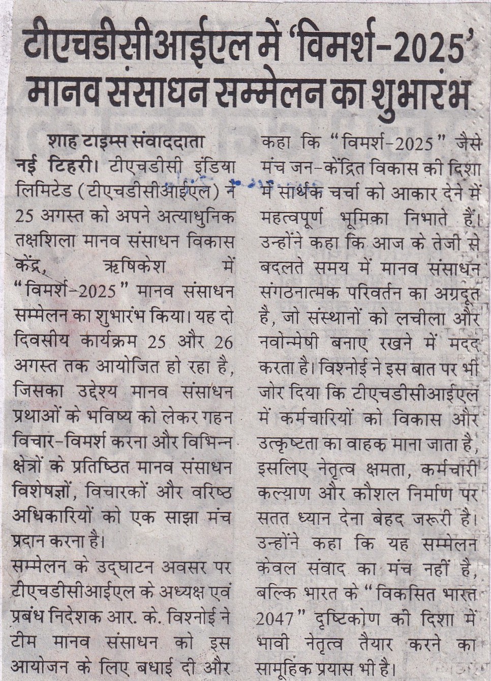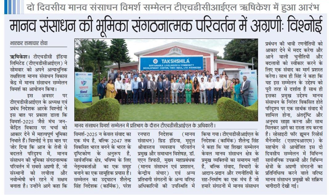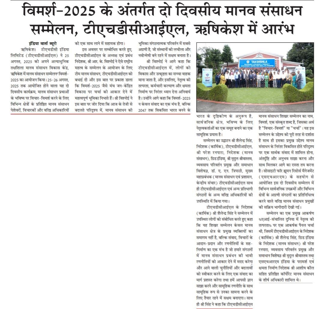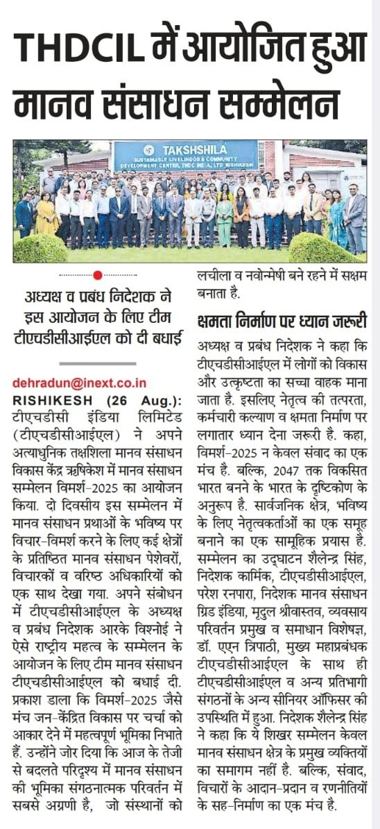 ऋषिकेश, 25 अगस्त, 2025: टीएचडीसी इंडिया लिमिटेड (टीएचडीसीआईएल) ने 25 अगस्त, 2025 को अपने अत्याधुनिक तक्षशिला मानव संसाधन विकास केंद्र, ऋषिकेश में मानव संसाधन सम्मेलन: विमर्श- 2025 का आयोजन किया। 25-26 अगस्त, 2025 तक आयोजित होने वाला यह दो दिवसीय कार्यक्रम, मानव संसाधन प्रथाओं के भविष्य पर विचार-विमर्श करने के लिए विभिन्न क्षेत्रों के प्रतिष्ठित मानव संसाधन पेशेवरों, विचारकों और वरिष्ठ अधिकारियों को एक साथ लाने में सहायक होगा।