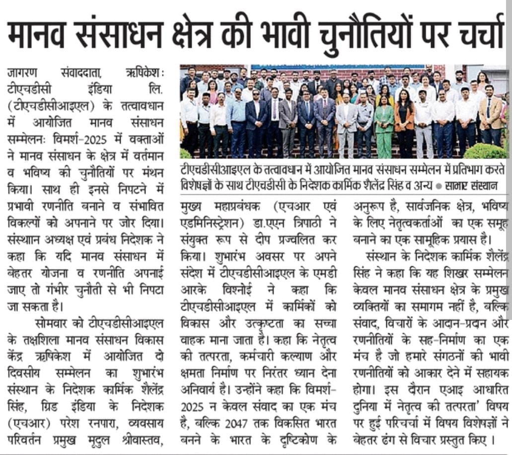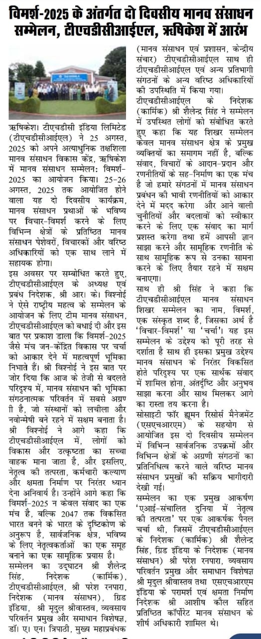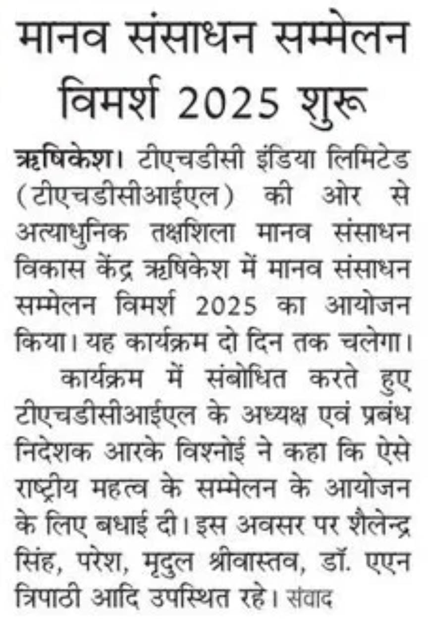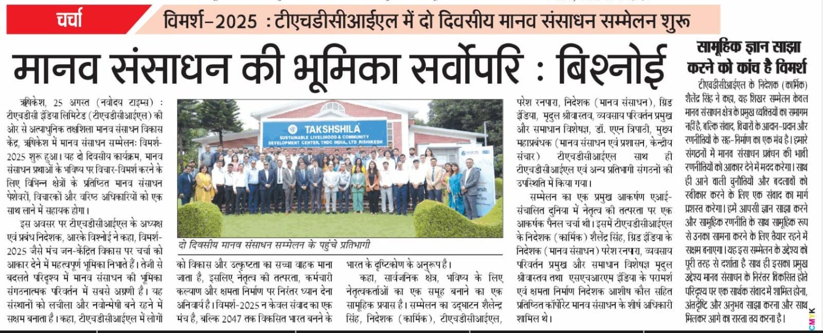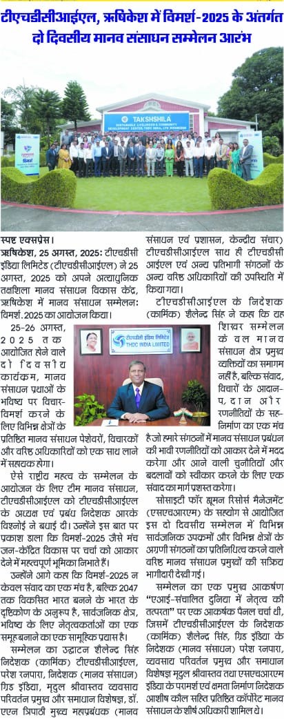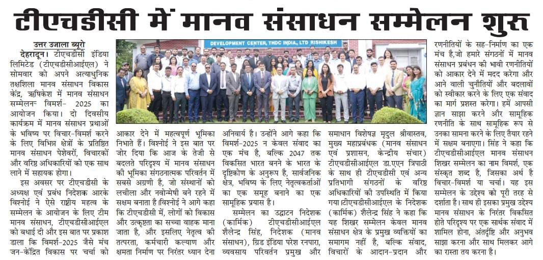 ऋषिकेश, 25 अगस्त, 2025: टीएचडीसी इंडिया लिमिटेड (टीएचडीसीआईएल) ने 25 अगस्त, 2025 को अपने अत्याधुनिक तक्षशिला मानव संसाधन विकास केंद्र, ऋषिकेश में मानव संसाधन सम्मेलन: विमर्श- 2025 का आयोजन किया। 25-26 अगस्त, 2025 तक आयोजित होने वाला यह दो दिवसीय कार्यक्रम, मानव संसाधन प्रथाओं के भविष्य पर विचार-विमर्श करने के लिए विभिन्न क्षेत्रों के प्रतिष्ठित मानव संसाधन पेशेवरों, विचारकों और वरिष्ठ अधिकारियों को एक साथ लाने में सहायक होगा।