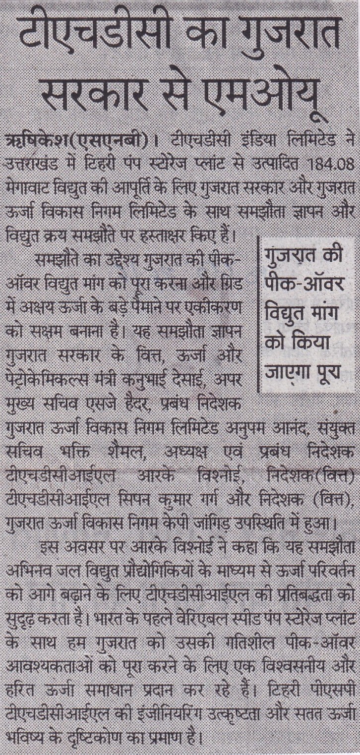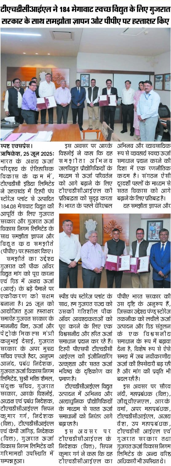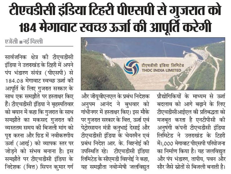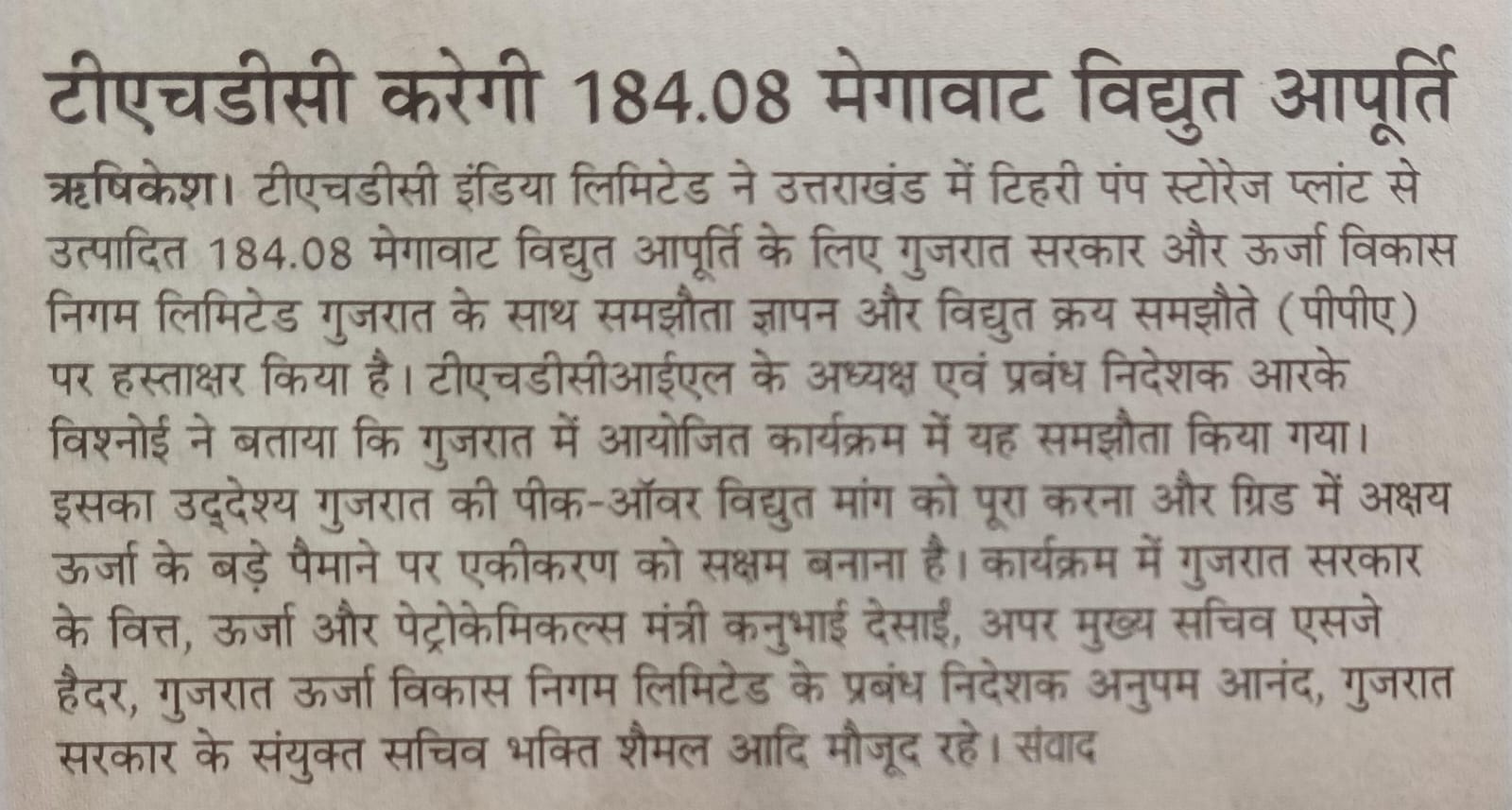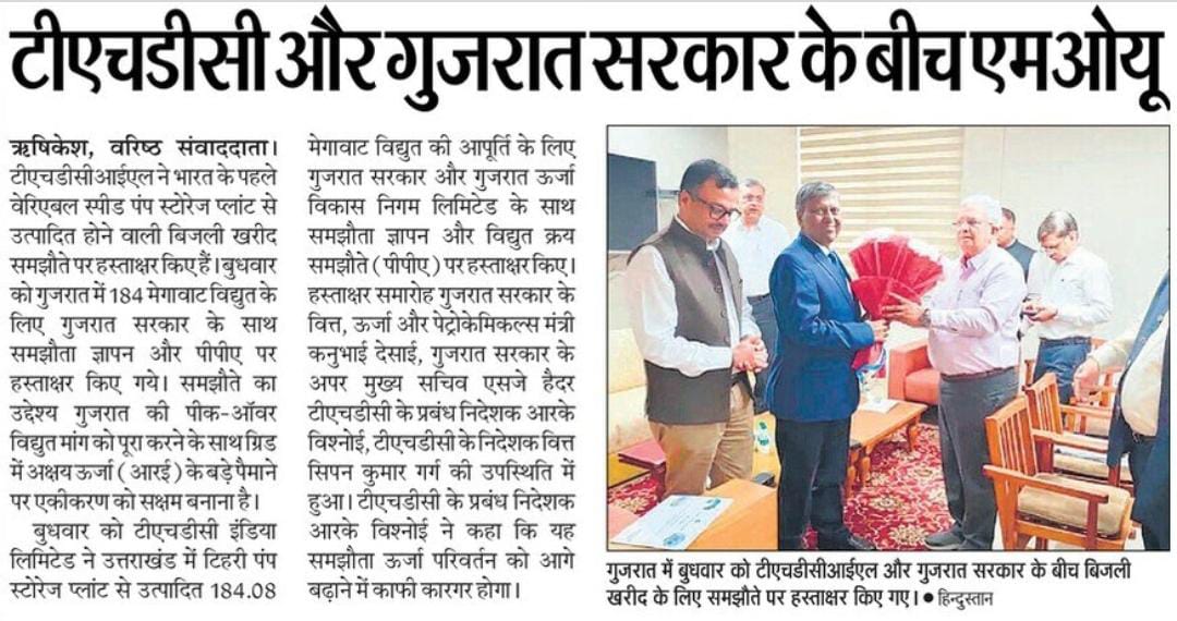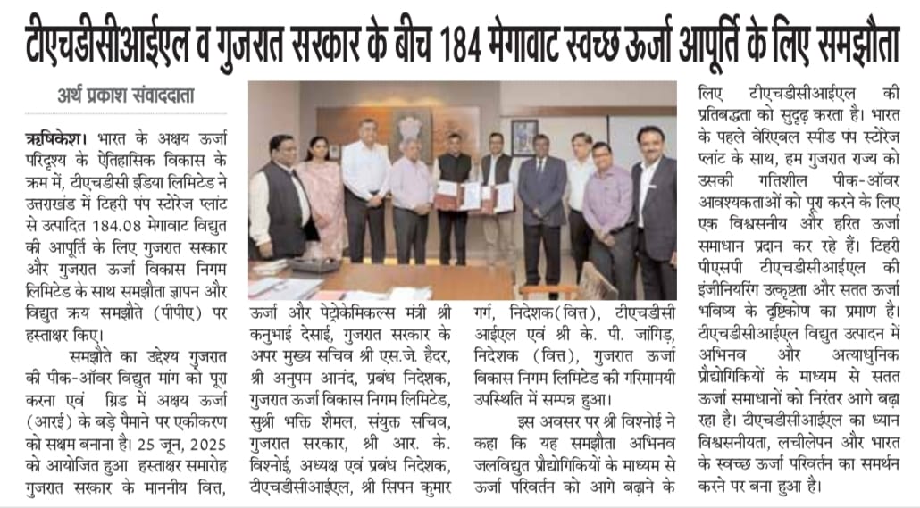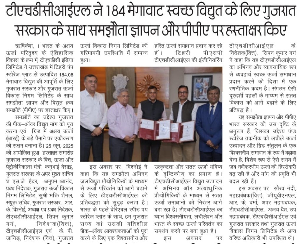ऋषिकेश, 25-06-2025: भारत के अक्षय ऊर्जा परिदृश्य के ऐतिहासिक विकास के क्रम में, टीएचडीसी इंडिया लिमिटेड ने उत्तराखंड में टिहरी पंप स्टोरेज प्लांट से उत्पादित 184.08 मेगावाट विद्युत की आपूर्ति के लिए गुजरात सरकार और गुजरात ऊर्जा विकास निगम लिमिटेड के साथ समझौता ज्ञापन और विद्युत क्रय समझौते (पीपीए) पर हस्ताक्षर किए।