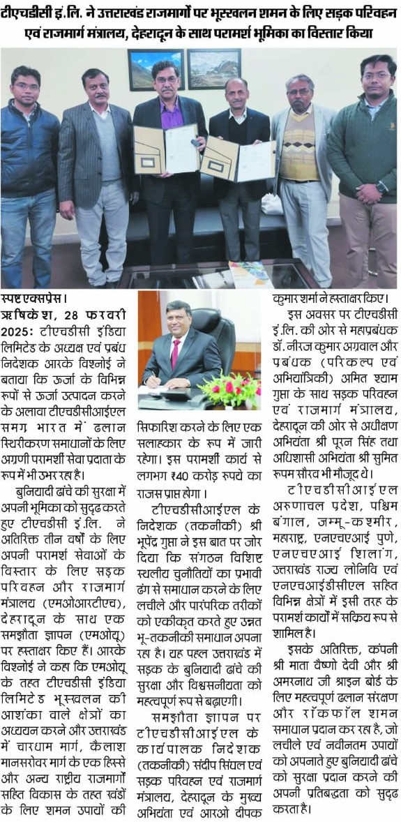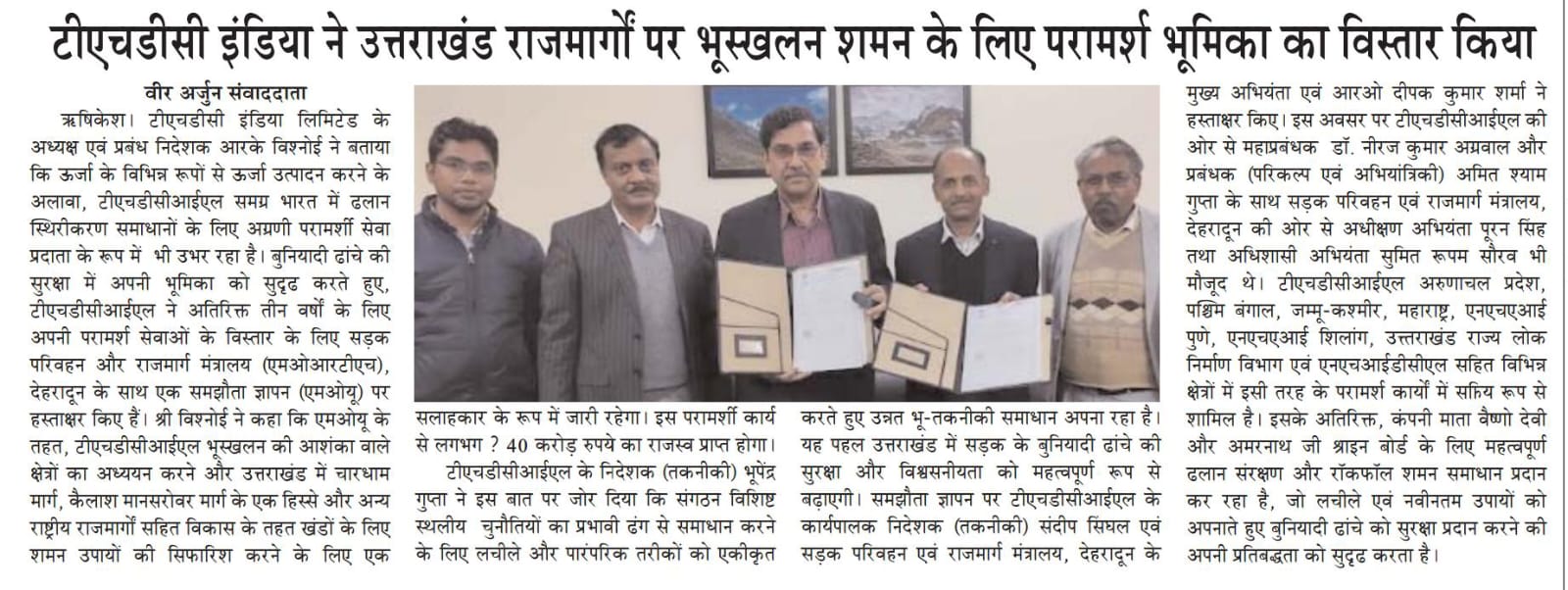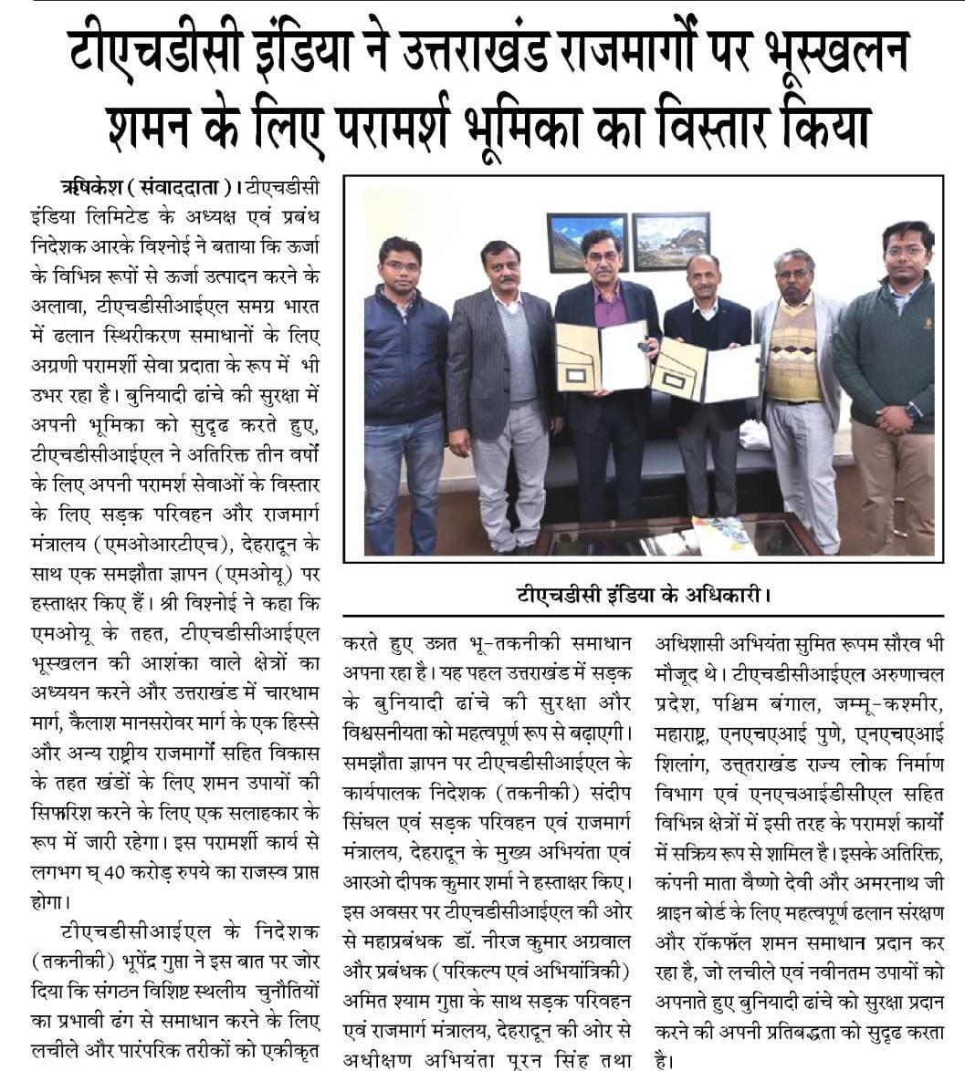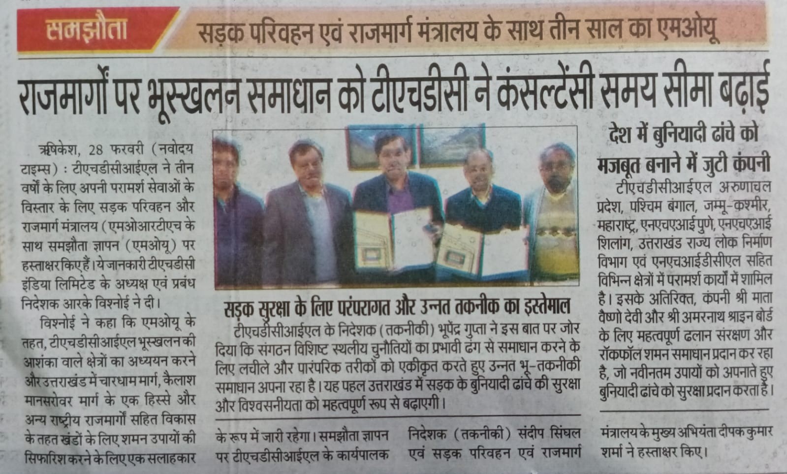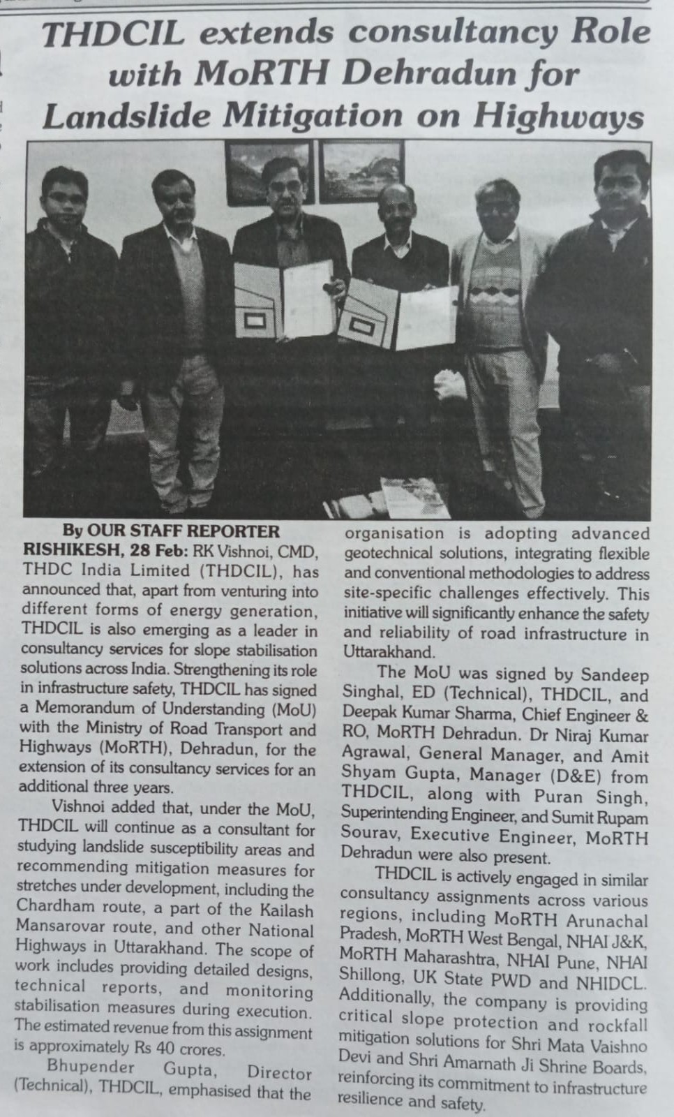 Rishikesh, 28-02-2025: Sh. R. K. Vishnoi, CMD, THDC India Limited (THDCIL), conveyed that apart from venturing into different forms of energy generation, THDCIL is also emerging as a leader in consultancy services for slope stabilization solutions across India. Strengthening its role in infrastructure safety, THDCIL has signed a Memorandum of Understanding (MoU) with the Ministry of Road Transport and Highways (MoRTH), Dehradun, for the extension of its consultancy services for an additional three years.