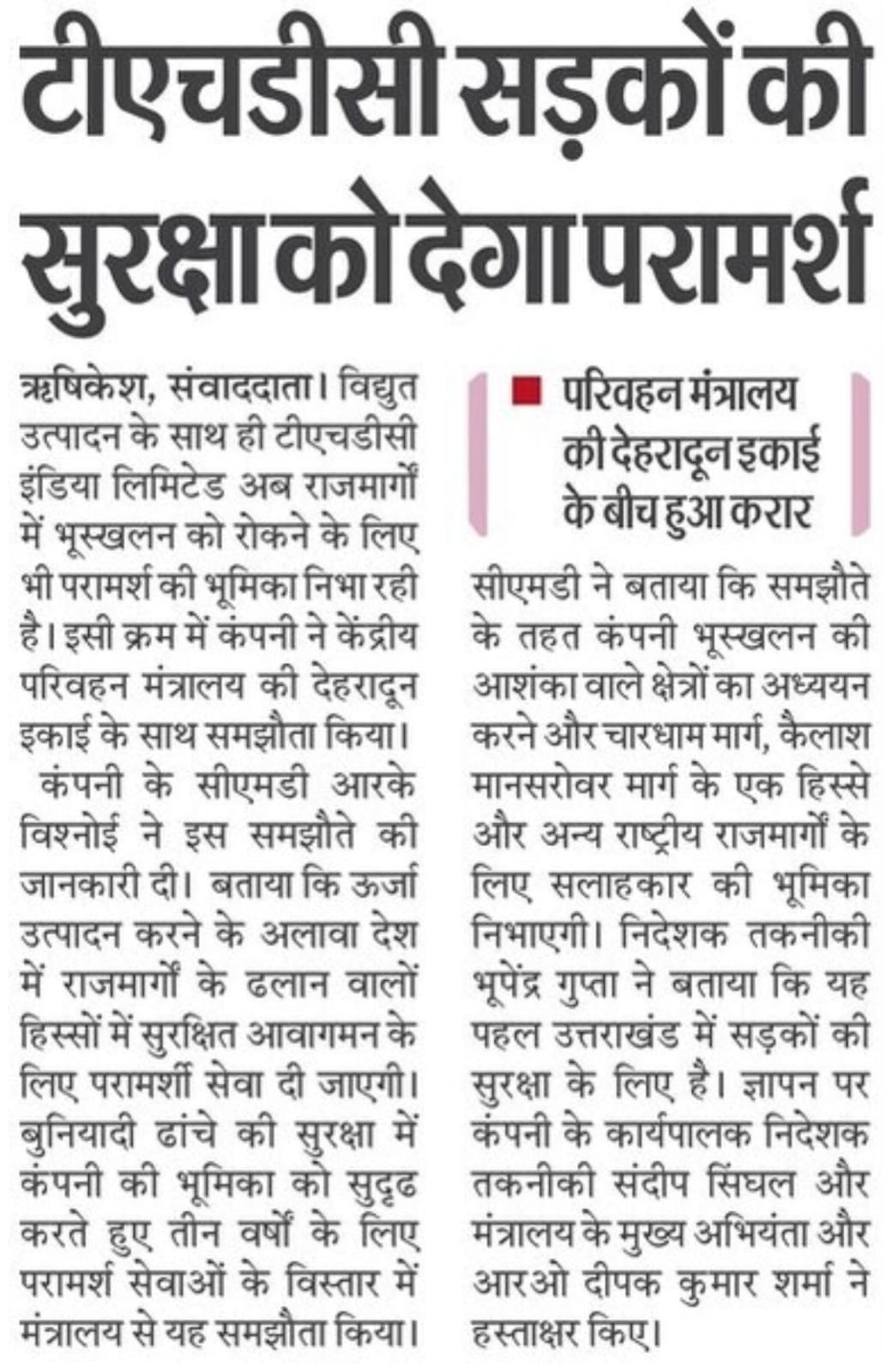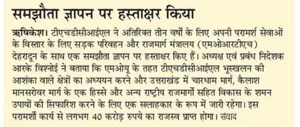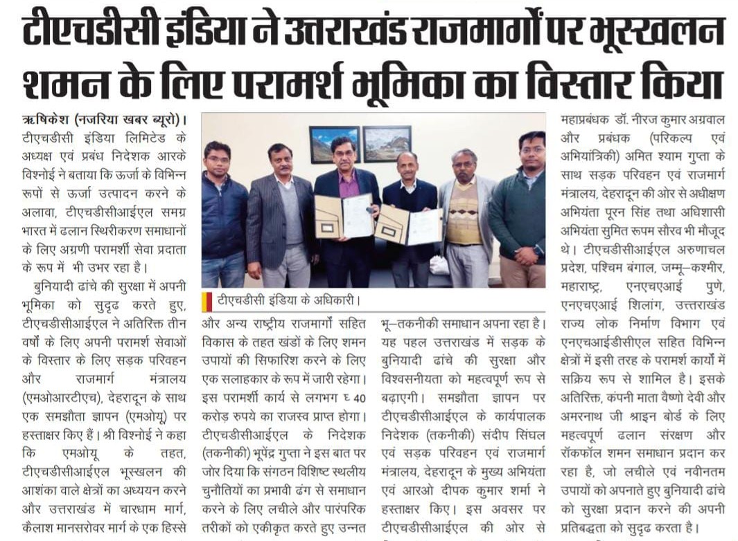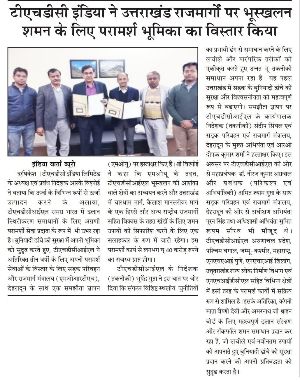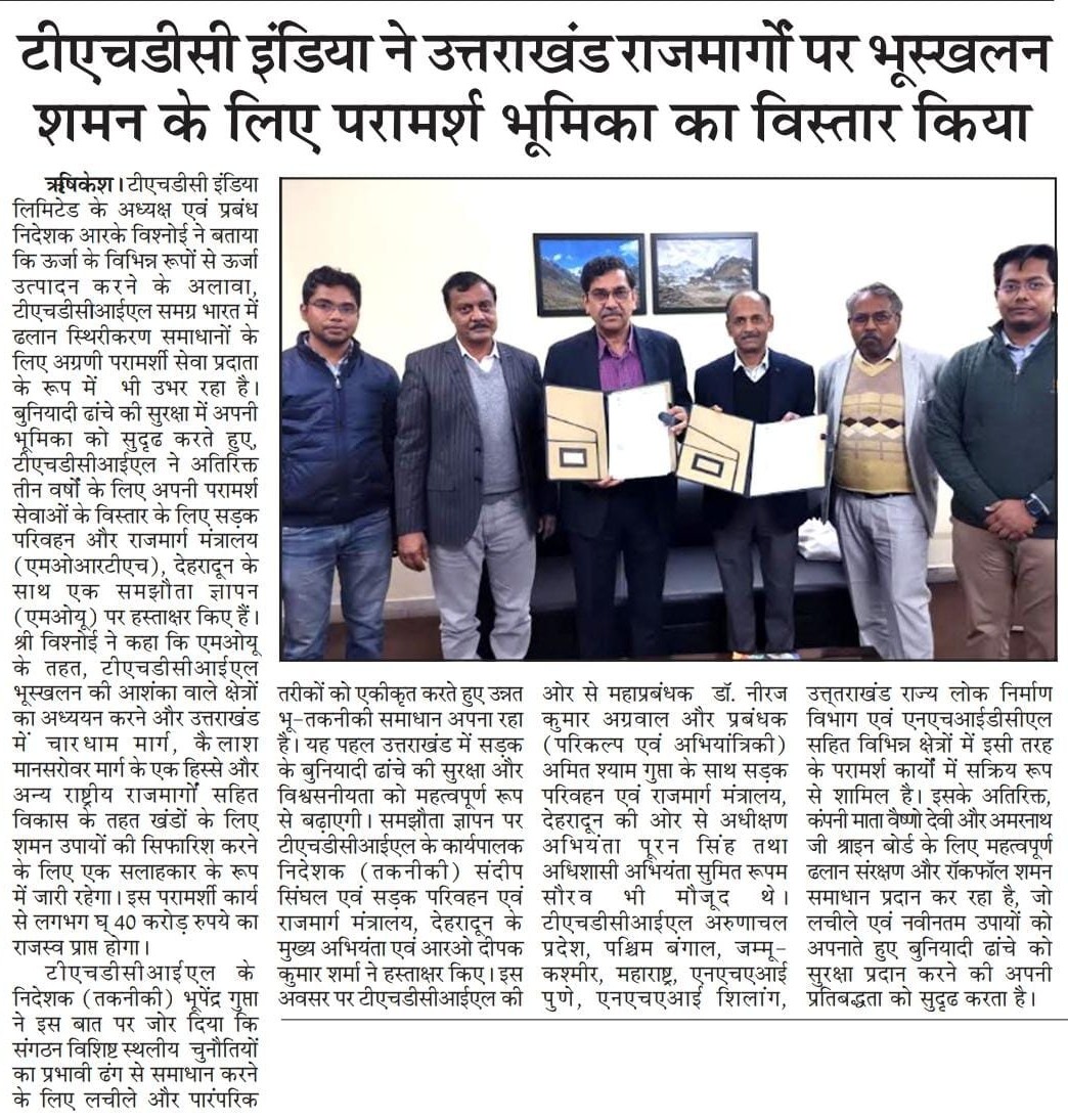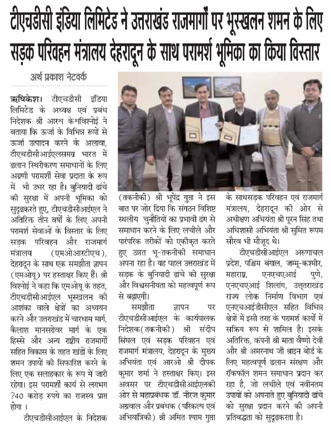 Sh. Vishnoi added that under the MoU, THDCIL will continue as a consultant for studying landslide susceptibility areas and recommending mitigation measures for stretches under development, including the Chardham route, a part of the Kailash Mansarovar route, and other National Highways in Uttarakhand. The scope of work includes providing detailed designs, technical reports, and monitoring stabilization measures during execution. The estimated revenue from this assignment is approximately ₹40 crores.