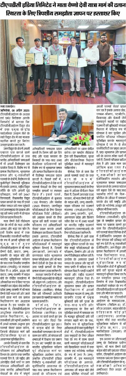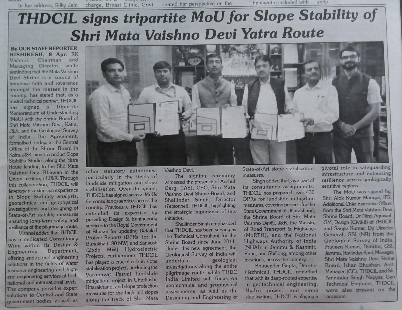 Rishikesh, 08-04-2025: Sh. R. K. Vishnoi, Chairman and Managing Director conveyed that THDCIL being a premier Central PSU in the Power Sector, has consistently displayed excellence by establishing new Bench-Marks in Energy Sector. THDCIL having its core strength in Hydro Energy, has also demonstrated its expertise in high-end engineering solutions, particularly in the fields of slope stabilization, landslide mitigation, and geotechnical consultancy, particularly in challenging Himalayan Geology. Besides, its firm commitment towards the National Power Policy, ‘for providing affordable, 24X7 reliable Power to all,’ it has always endeavoured to give back to the Society and contribute for up-liftment of masses and the over all progress of the Nation. Mata Vaishno Devi Shrine, is a source of immense faith and reverence amongst the masses in the Country and strengthening its role as a trusted technical partner, THDCIL has signed a Tripartite Memorandum of Understanding (MoU) with the Shrine Board of Shri Mata Vaishno Devi, Katra, J&K, and the Geological Survey of India. The Agreement, formalized on April 8, 2025, at the Central Office of the Shrine Board in Katra, J&K, aims to conduct Slope Stability Studies along the Yatra Route leading to the Shri Mata Vaishno Devi Bhawan in the Union Territory of J&K. Through this collaboration, THDCIL will leverage its extensive experience in Slope Stability analysis, geotechnical and geophysical investigations and designing of State-of-Art stability measures ensuring long-term safety and resilience of the pilgrimage route.