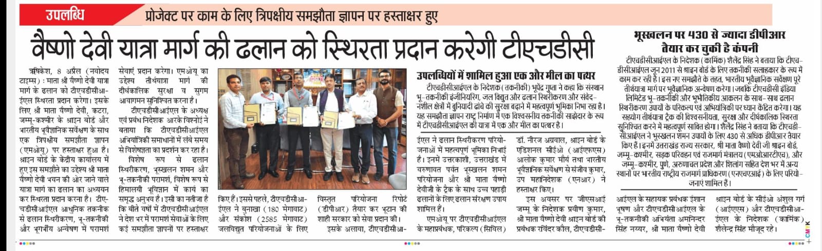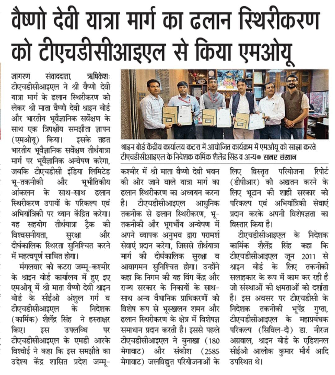 The MoU was signed by, Shri Alok Kumar Maurya, IFS, Additional Chief Executive Officer from the Shri Mata Vaishno Devi Shrine Board, Dr. Niraj Agrawal, GM, Design (Civil-II) of THDCIL and Sh. Sanjiv Kumar, Dy. Director General, GSI (NR) from the Geological Survey of India. Sh. Praveen Kumar, Director, GSI, Jammu, Sh. Ravinder Kaul, Manager, Shri Mata Vaishno Devi Shrine Board, Sh. Ishan Bhushan, Asst. Manager, (CC), THDCIL and Sh. Amninder Singh Nayyar, Geo Technical Engineer, THDCIL were also present during the occasion.