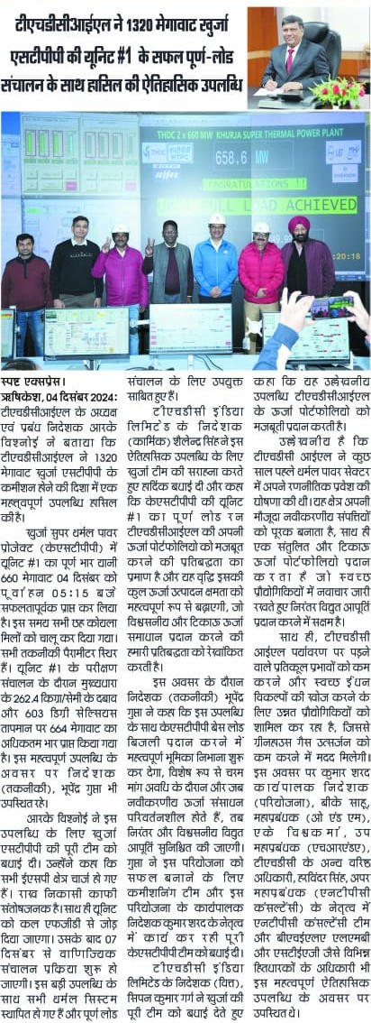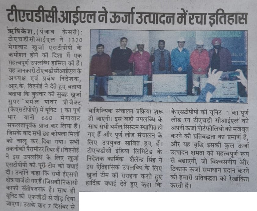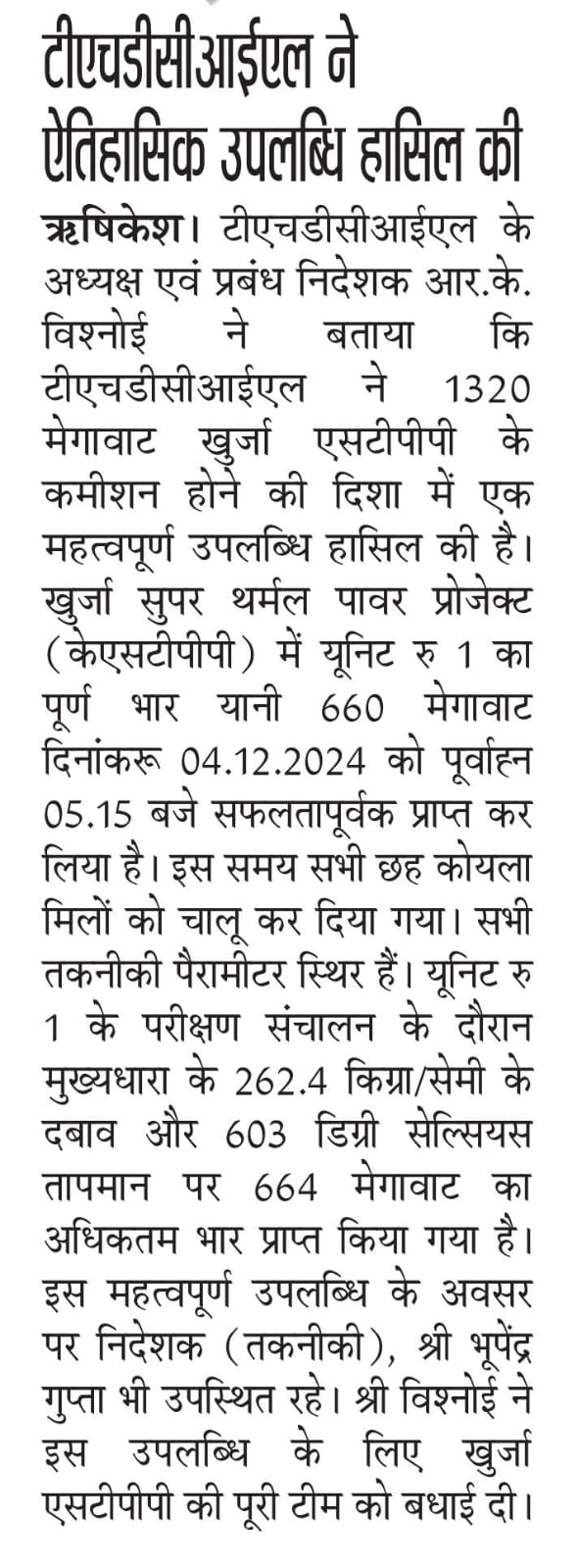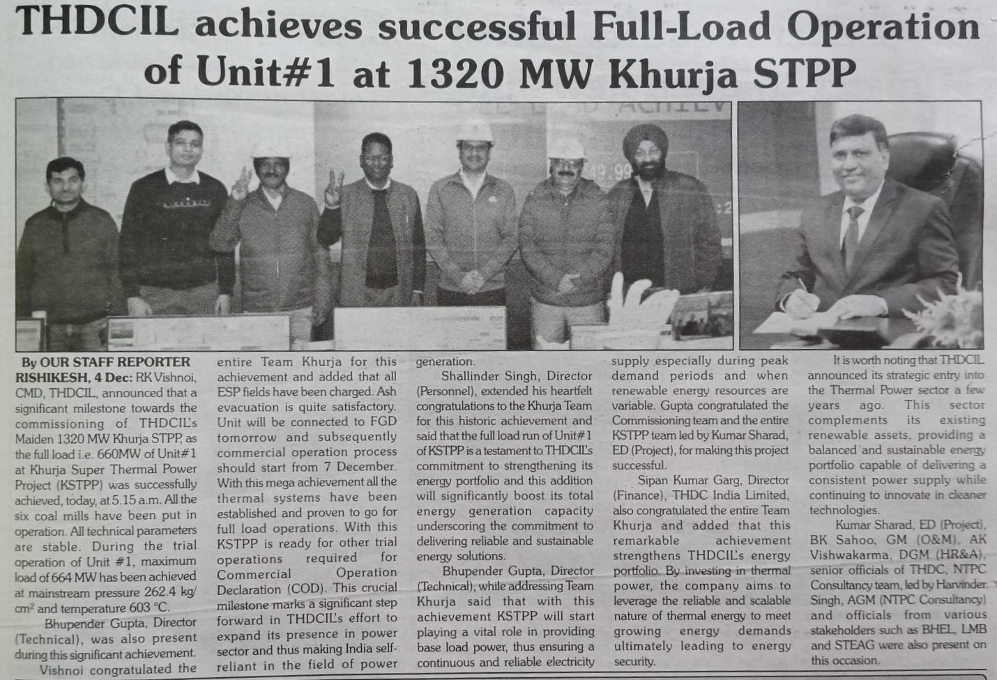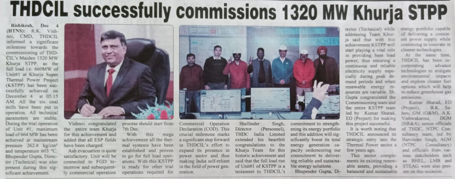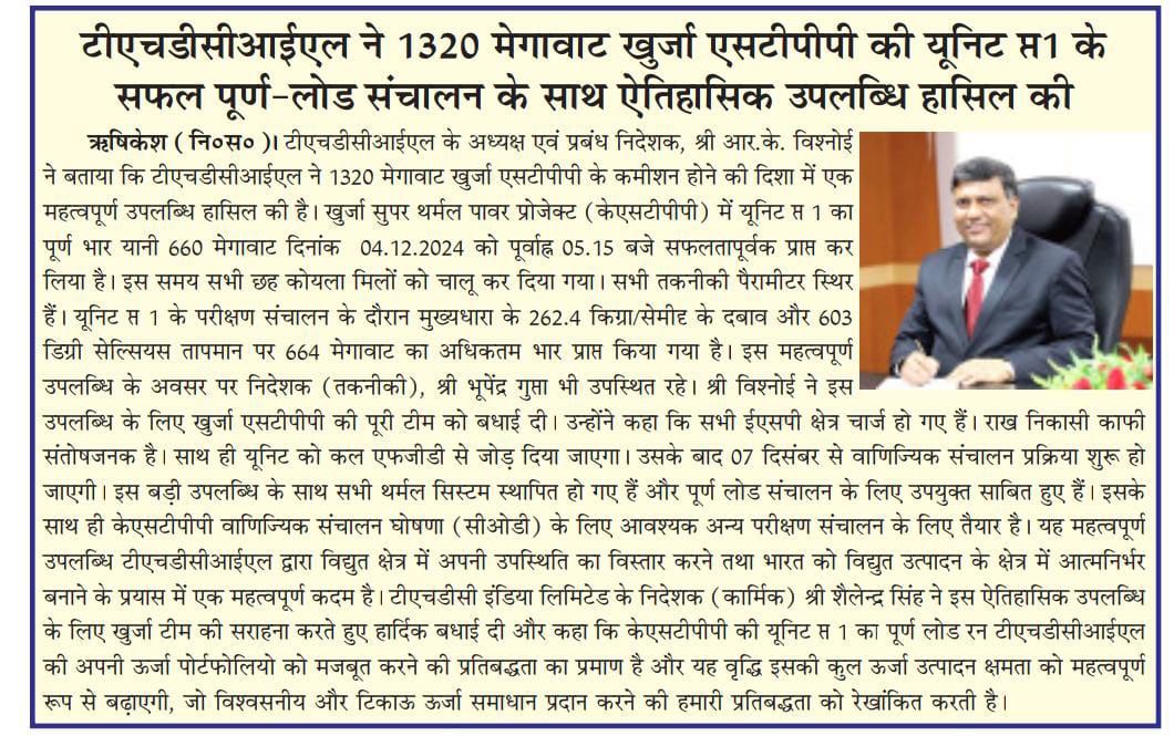 Rishikesh, 04-12-2024:Sh. R.K. Vishnoi, CMD, THDCIL informed a significant milestone towards the commissioning of THDCIL’s Maiden 1320 MW Khurja STPP, as the full load i.e. 660MW of Unit#1 at Khurja Super Thermal Power Project (KSTPP) has been successfully achieved on 04.12.2024 , at 05.15 AM. All the six coal mills have been put in operation. All technical parameters are stable. During the trial operation of Unit #1, maximum load of 664 MW has been achieved at mainstream pressure 262.4 kg/cm² and temperature 603 °C. Sh. Bhupender Gupta, Director (Technical) was also present during this significant achievement.
