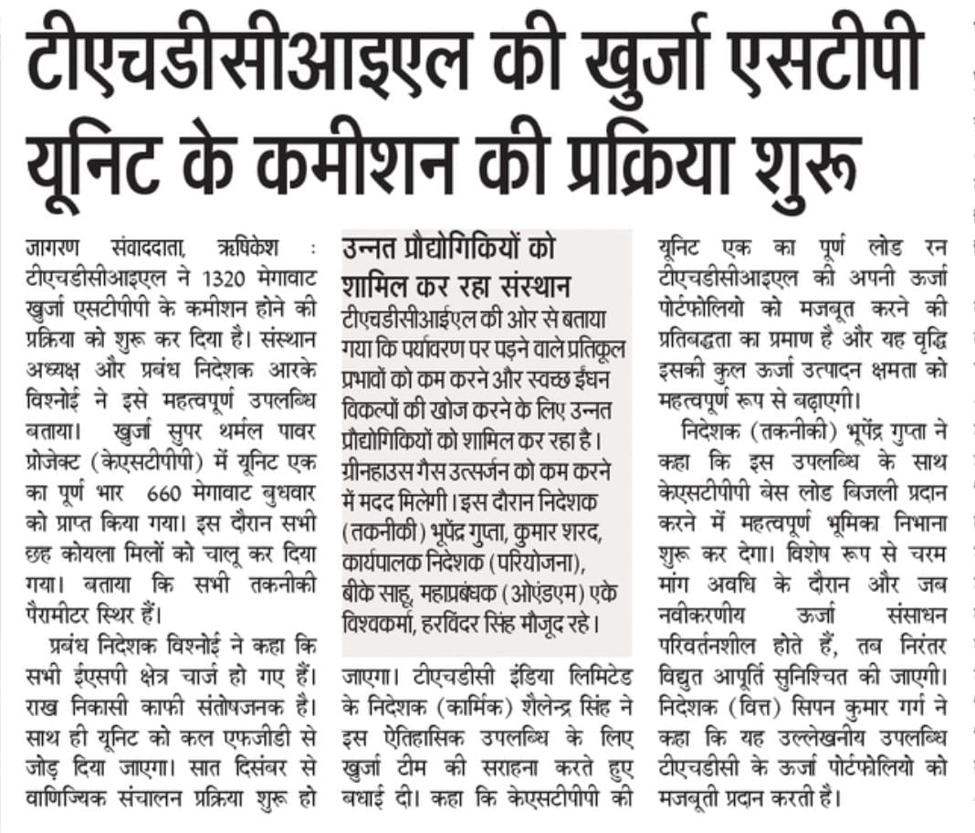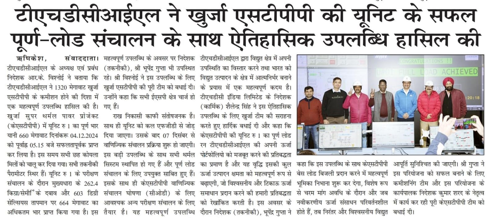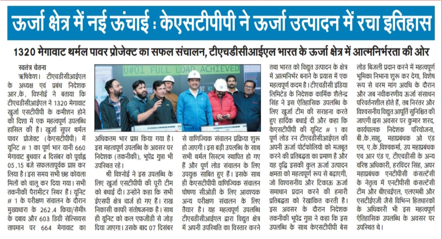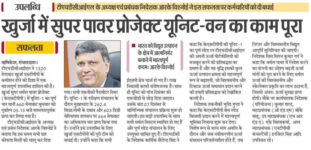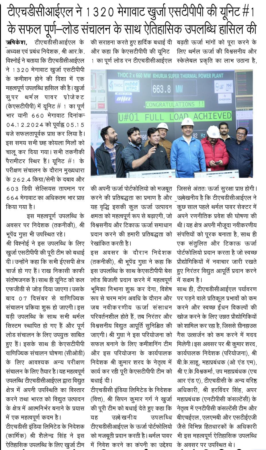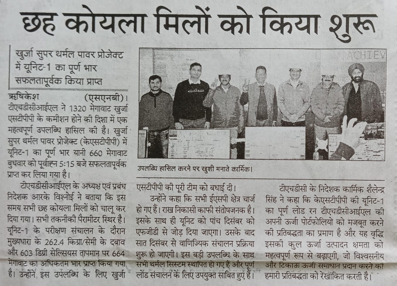 Rishikesh, 04-12-2024:Sh. R.K. Vishnoi, CMD, THDCIL informed a significant milestone towards the commissioning of THDCIL’s Maiden 1320 MW Khurja STPP, as the full load i.e. 660MW of Unit#1 at Khurja Super Thermal Power Project (KSTPP) has been successfully achieved on 04.12.2024 , at 05.15 AM. All the six coal mills have been put in operation. All technical parameters are stable. During the trial operation of Unit #1, maximum load of 664 MW has been achieved at mainstream pressure 262.4 kg/cm² and temperature 603 °C. Sh. Bhupender Gupta, Director (Technical) was also present during this significant achievement.