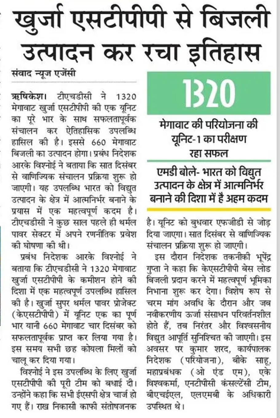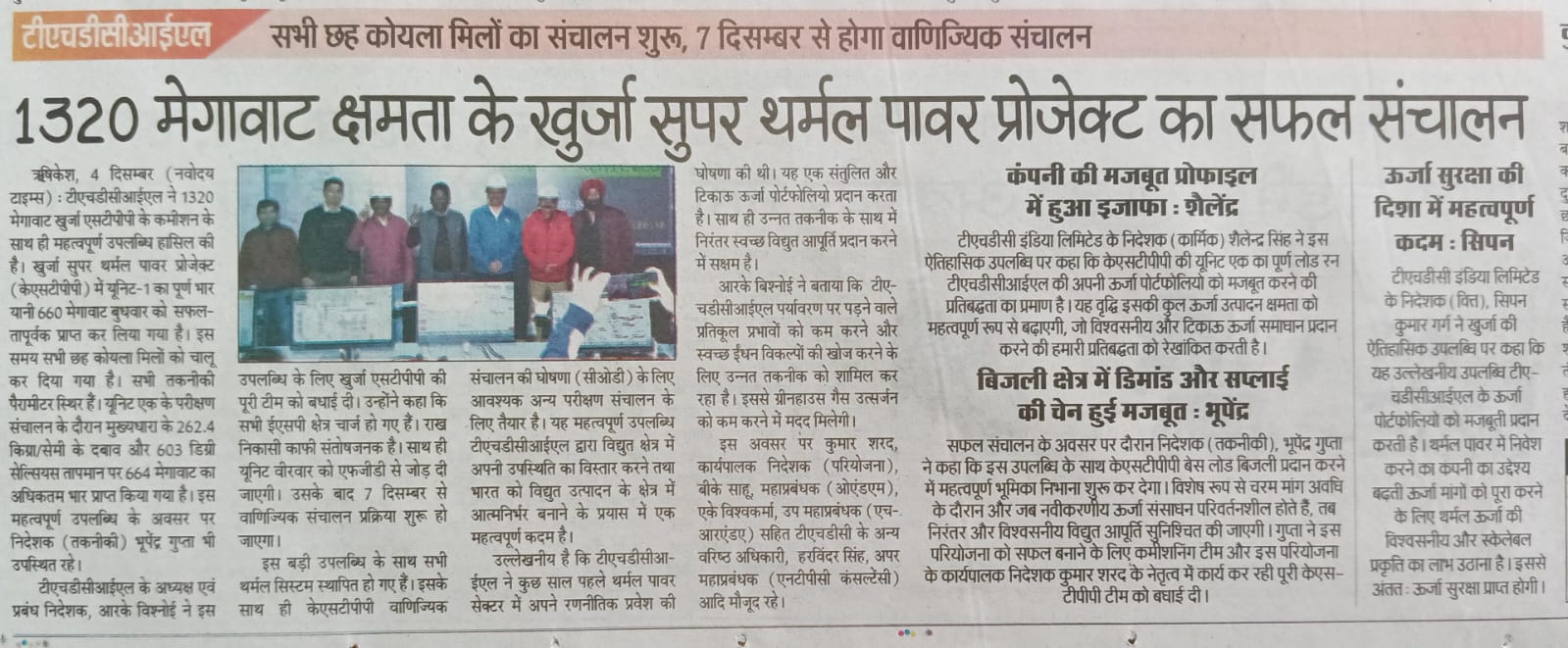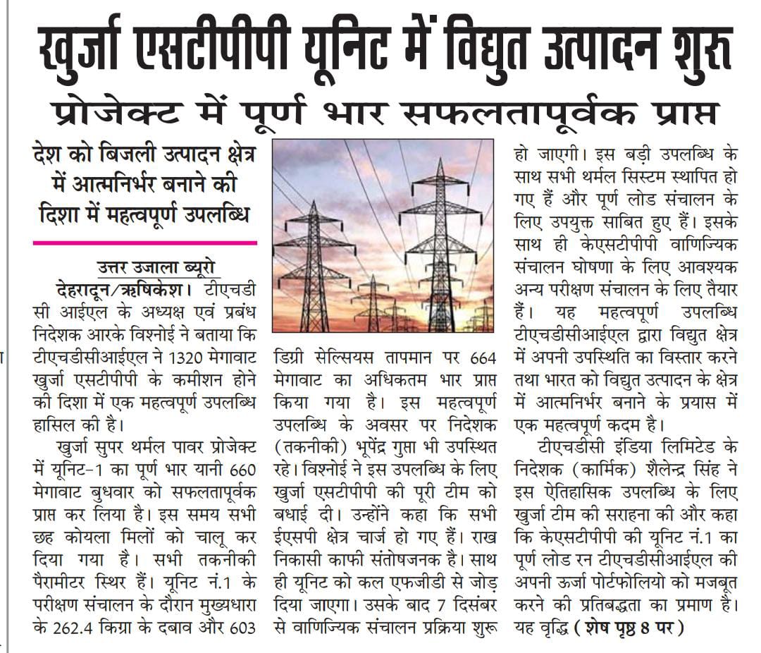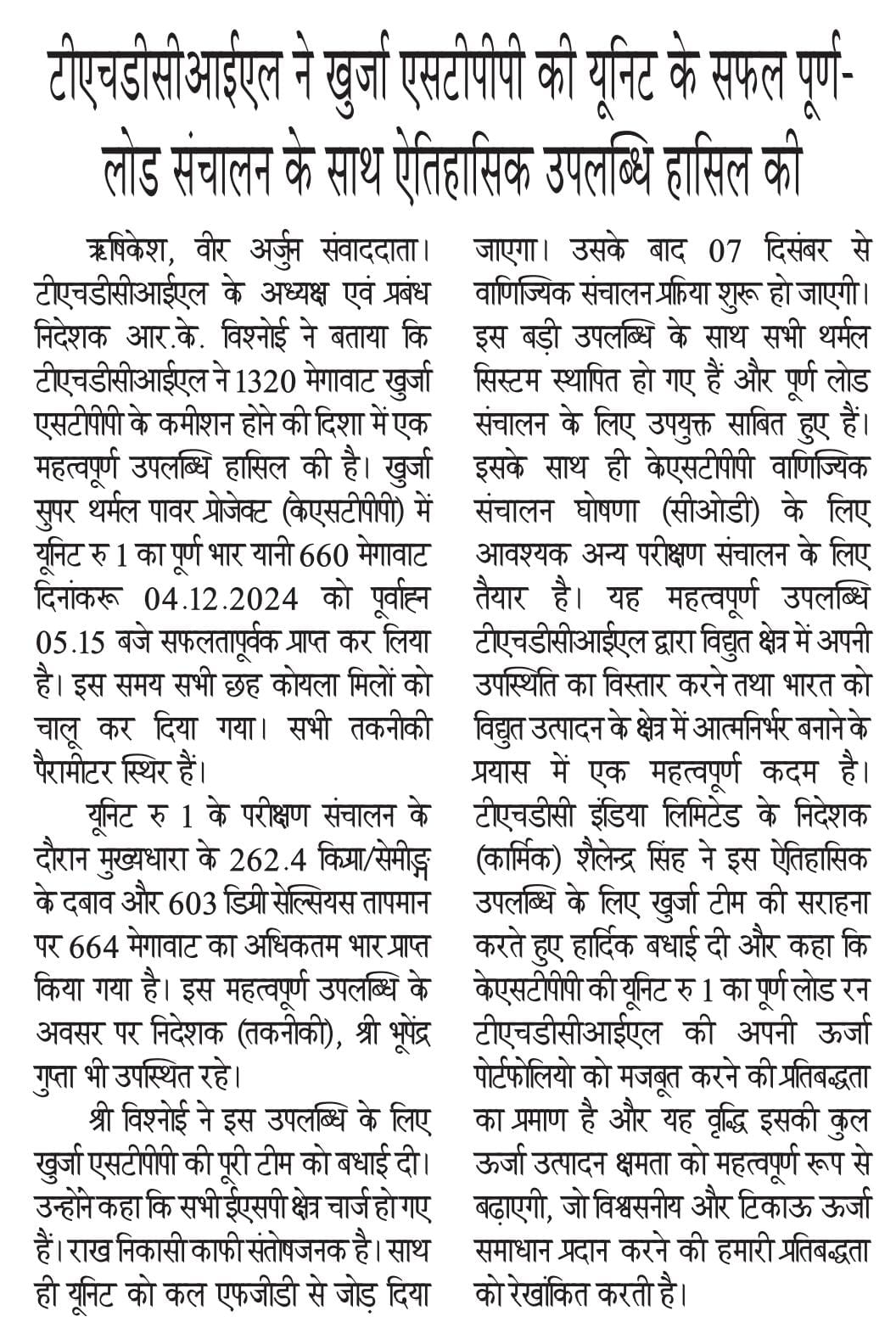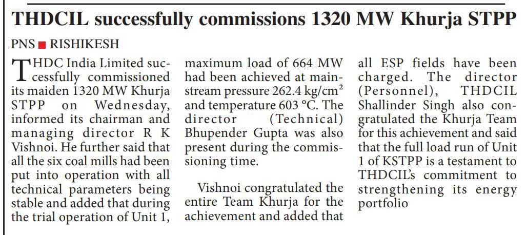 Rishikesh, 04-12-2024:Sh. R.K. Vishnoi, CMD, THDCIL informed a significant milestone towards the commissioning of THDCIL’s Maiden 1320 MW Khurja STPP, as the full load i.e. 660MW of Unit#1 at Khurja Super Thermal Power Project (KSTPP) has been successfully achieved on 04.12.2024 , at 05.15 AM. All the six coal mills have been put in operation. All technical parameters are stable. During the trial operation of Unit #1, maximum load of 664 MW has been achieved at mainstream pressure 262.4 kg/cm² and temperature 603 °C. Sh. Bhupender Gupta, Director (Technical) was also present during this significant achievement.