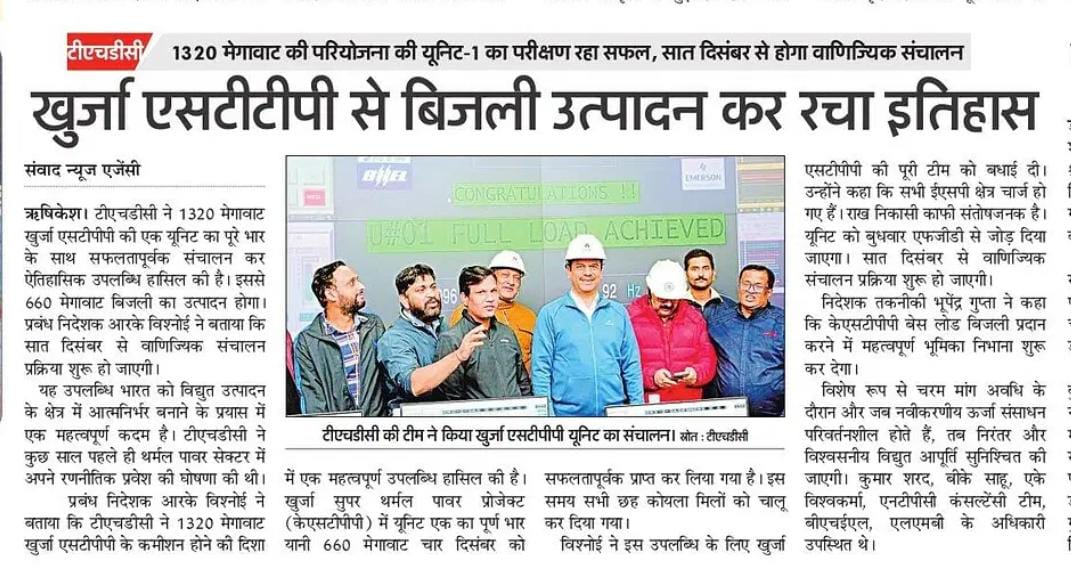 Sh. Shallinder Singh, Director (Personnel), THDC India Limited extended his heartfelt congratulations to the Khurja Team for this historic achievement and said that the full load run of Unit#1 of KSTPP is a testament to THDCIL’s commitment to strengthening its energy portfolio and this addition will significantly boost its total energy generation capacity underscoring our commitment to delivering reliable and sustainable energy solutions