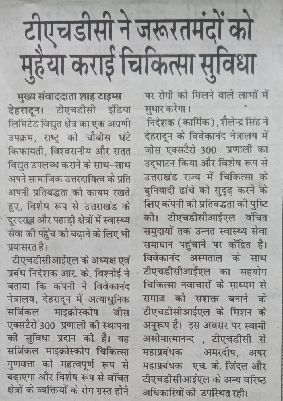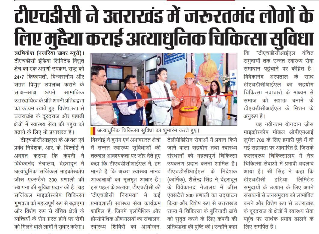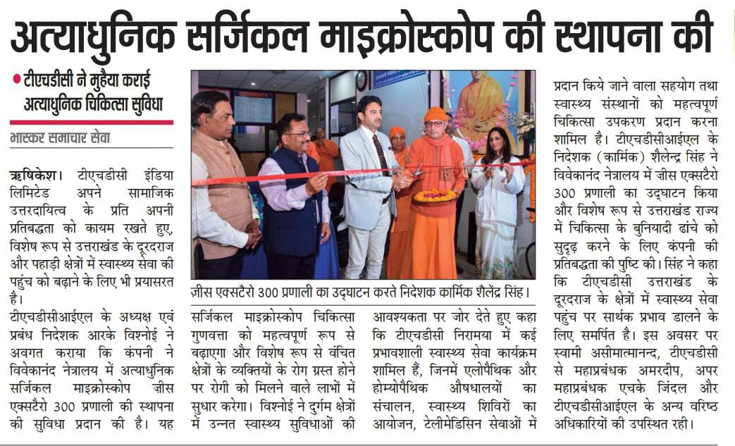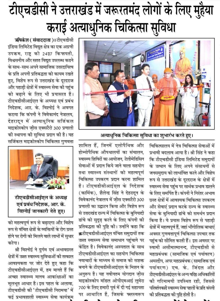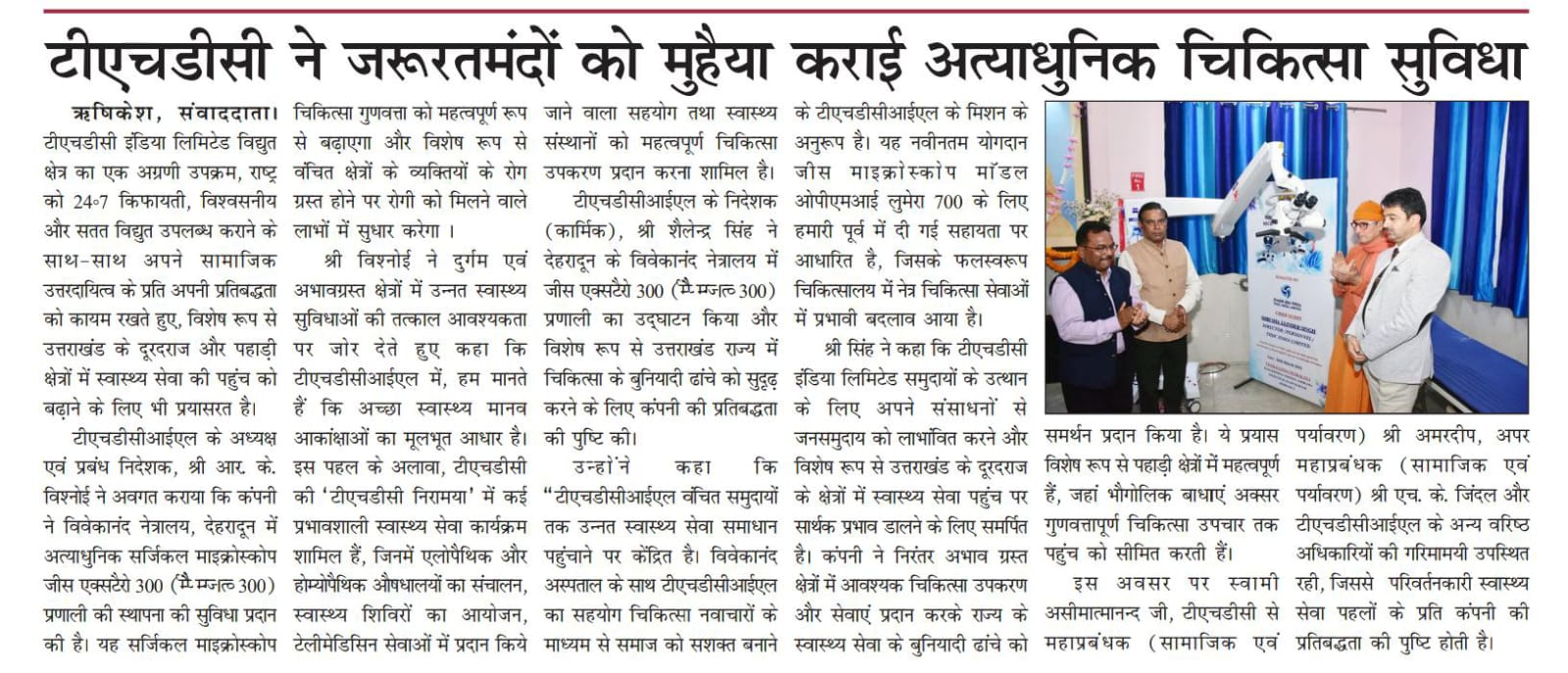 Sh. R. K. Vishnoi, Chairman and Managing Director, THDCIL informed that the company has facilitated the installation of State-of-the-Art surgical microscope ZEISS EXTARO 300 system at Vivekanand Netralya, Dehradun. This surgical microscope will significantly enhance medical precision and improve patient outcomes, especially for those from Underserved Regions.