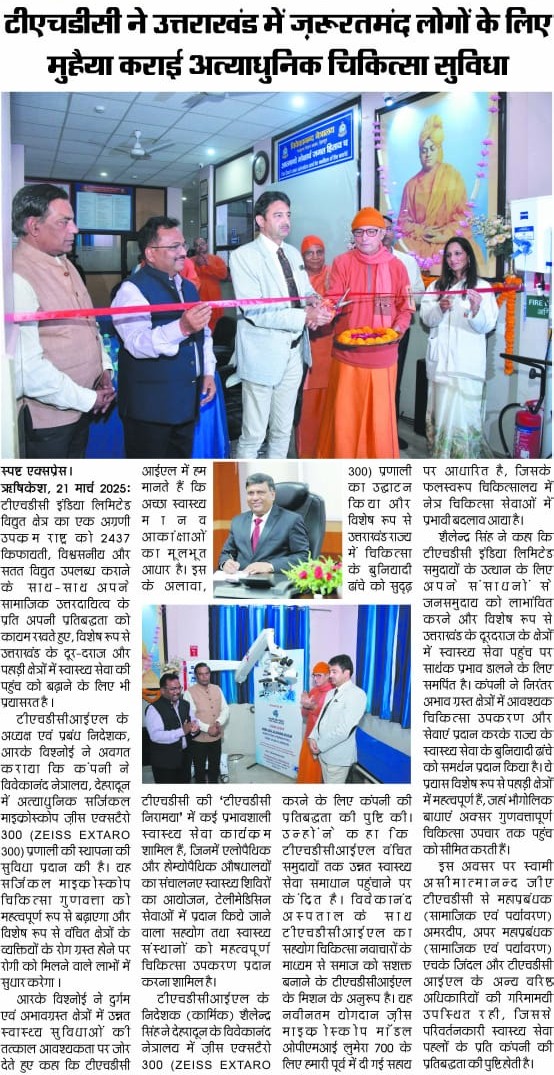 Sh. Shallinder Singh, Director (Personnel), THDCIL, inaugurated the ZEISS EXTARO 300 system at Vivekananda Netralaya, Dehradun and reaffirmed the company’s dedication to strengthening medical infrastructure especially in the state of Uttarakhand. He stated, “THDCIL remains focused on bringing advanced healthcare solutions to marginalized communities. Our collaboration with Vivekanand Hospital aligns with our mission to empower society through medical innovations. This latest contribution builds upon our prior assistance for the Zeiss Microscope Model OPMI LUMERA 700, which has already transformed eye care services at the hospital.