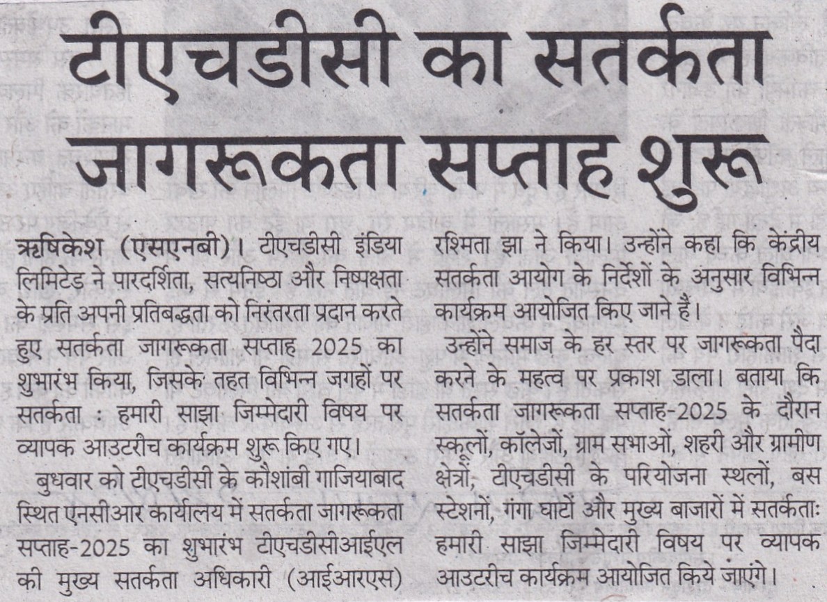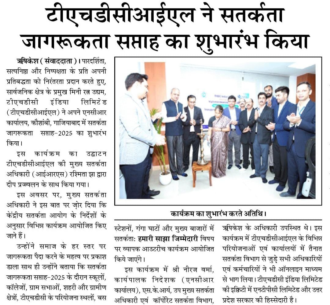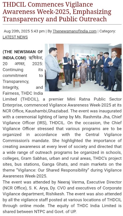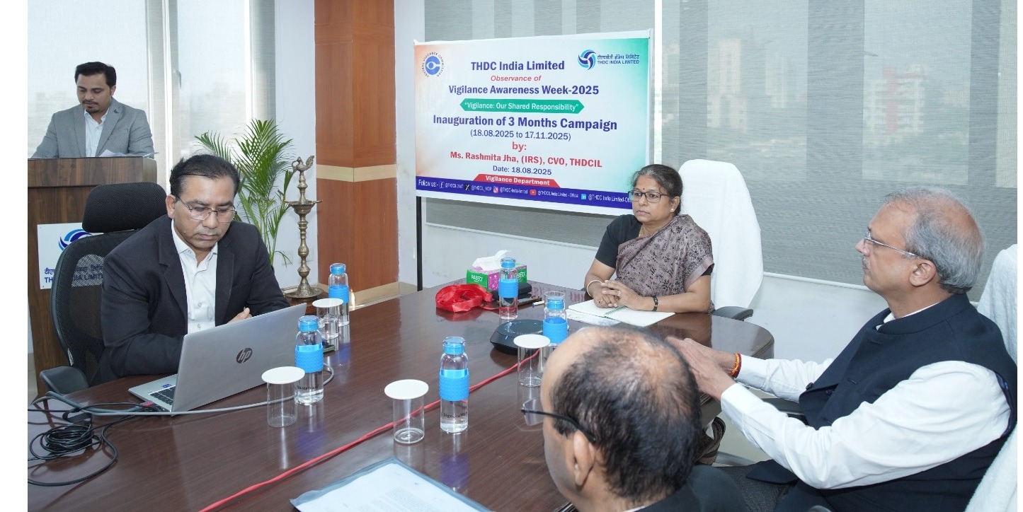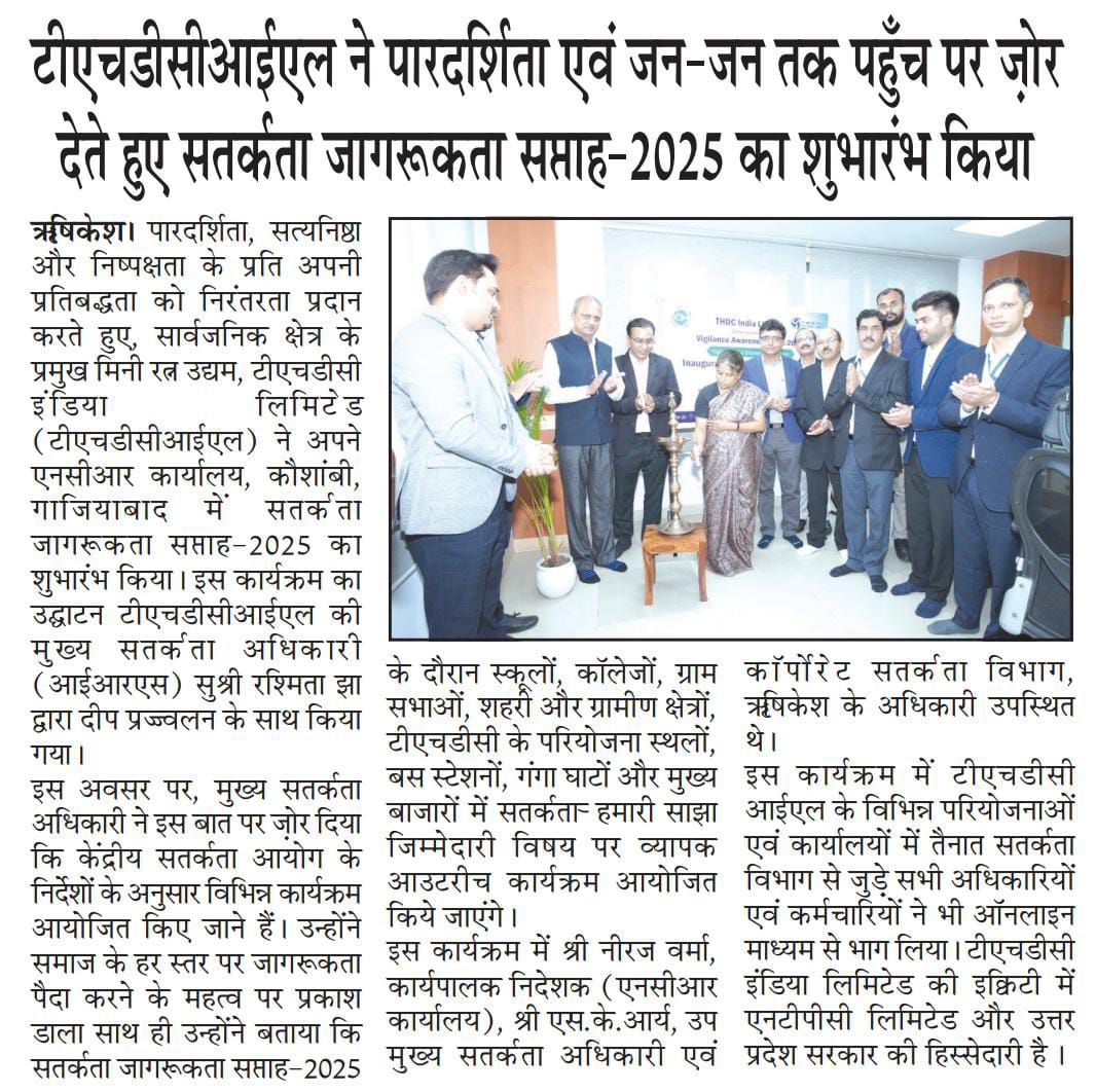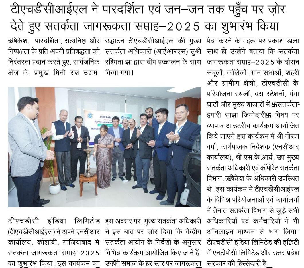 Rishikesh, 20 August, 2025: Continuing its commitment to Transparency, Integrity, and Fairness, THDC India Limited (THDCIL), a premier Mini Ratna Public Sector Enterprise, commenced Vigilance Awareness Week-2025 at its NCR Office, Kaushambi, Ghaziabad. The event was inaugurated with a ceremonial lighting of lamp by Ms. Rashmita Jha, Chief Vigilance Officer (IRS), THDCIL.