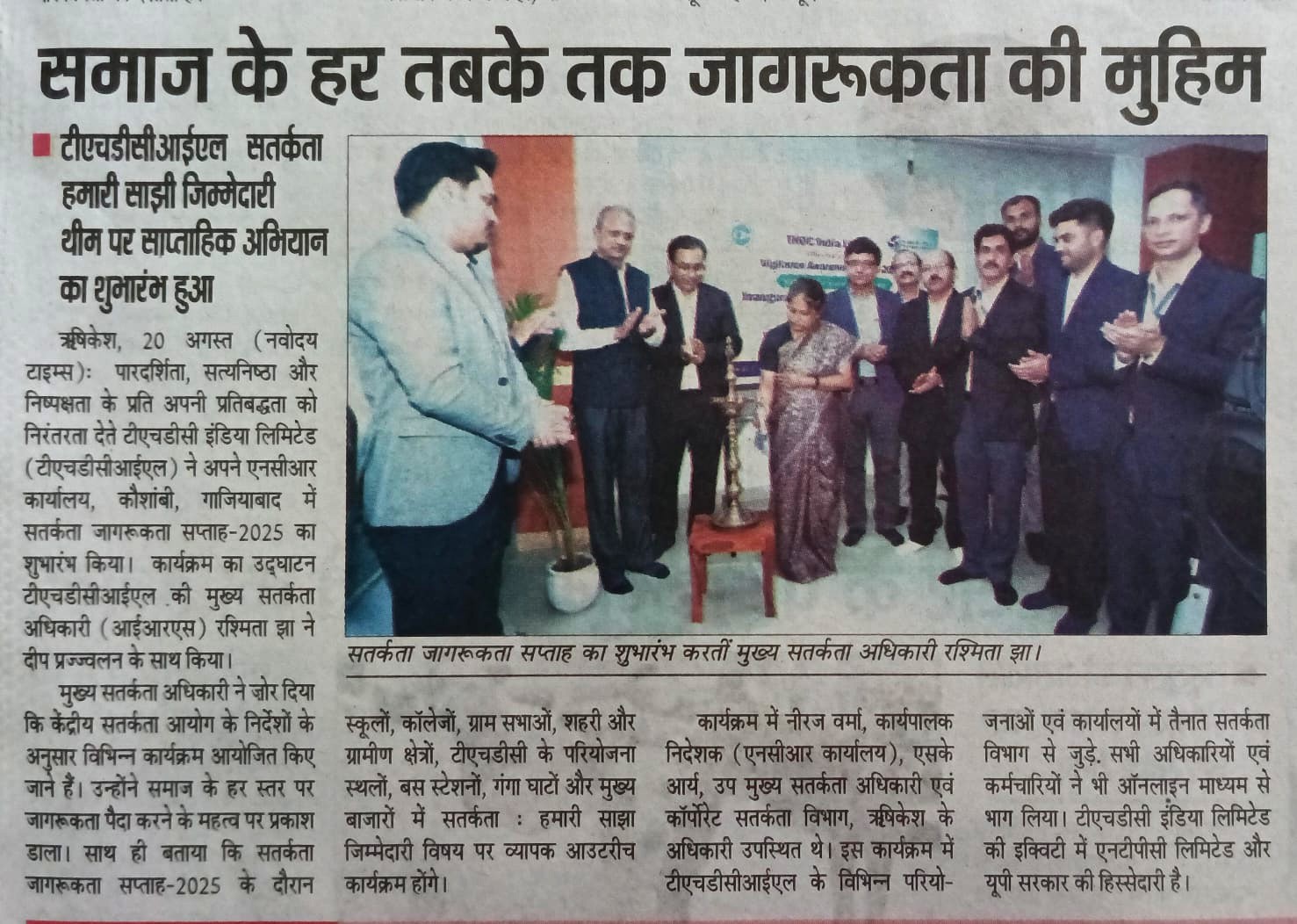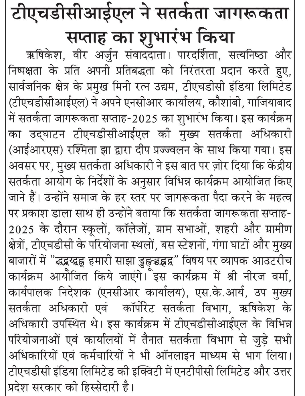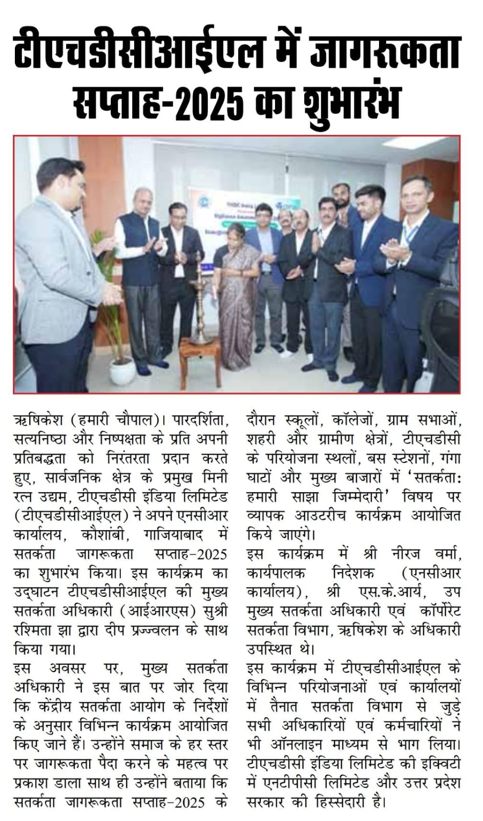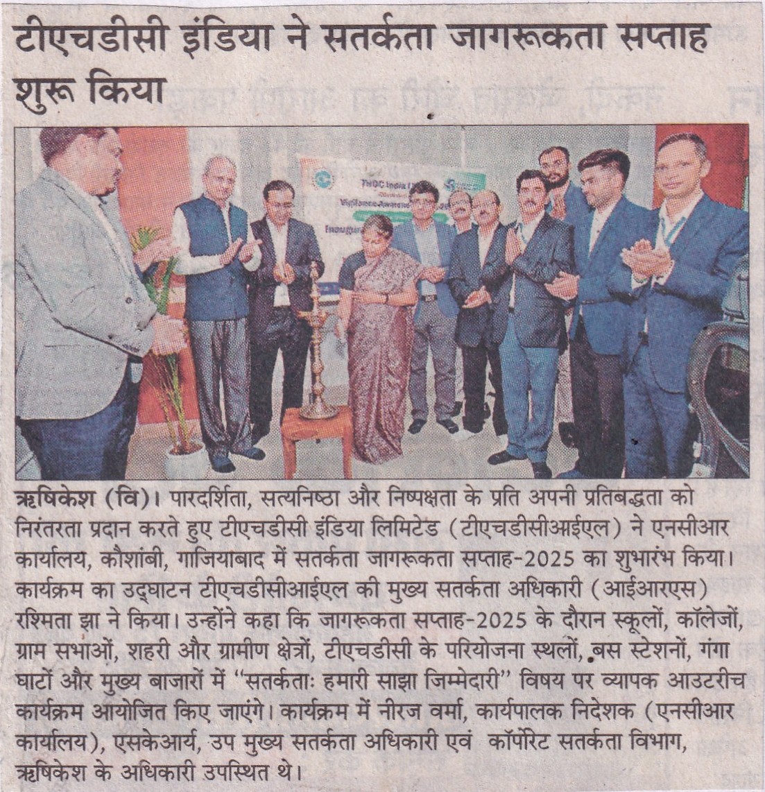 Rishikesh, 20 August, 2025: Continuing its commitment to Transparency, Integrity, and Fairness, THDC India Limited (THDCIL), a premier Mini Ratna Public Sector Enterprise, commenced Vigilance Awareness Week-2025 at its NCR Office, Kaushambi, Ghaziabad. The event was inaugurated with a ceremonial lighting of lamp by Ms. Rashmita Jha, Chief Vigilance Officer (IRS), THDCIL.