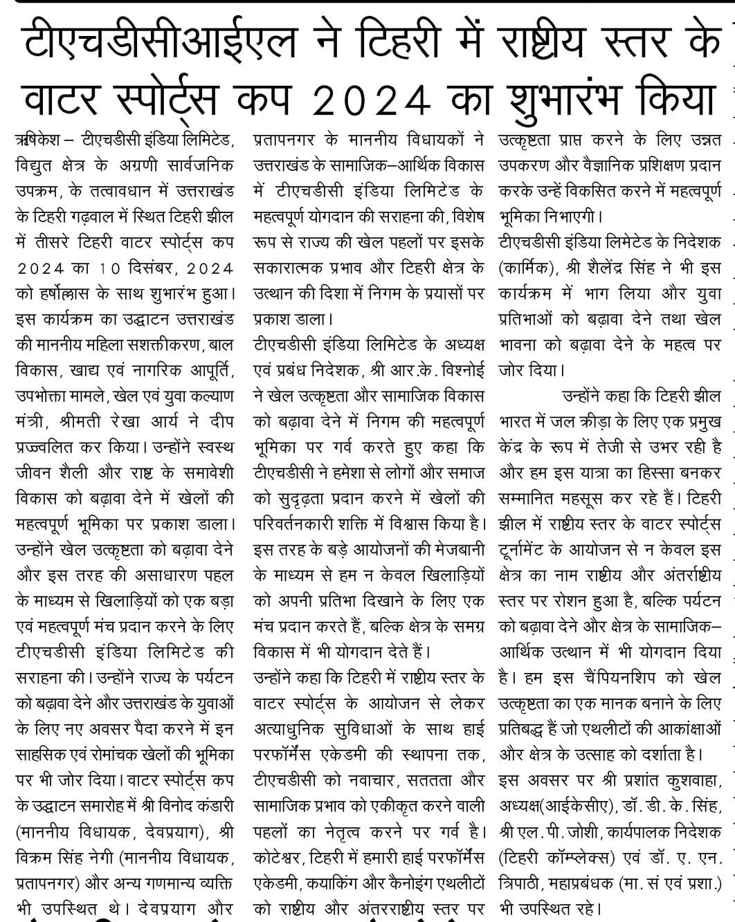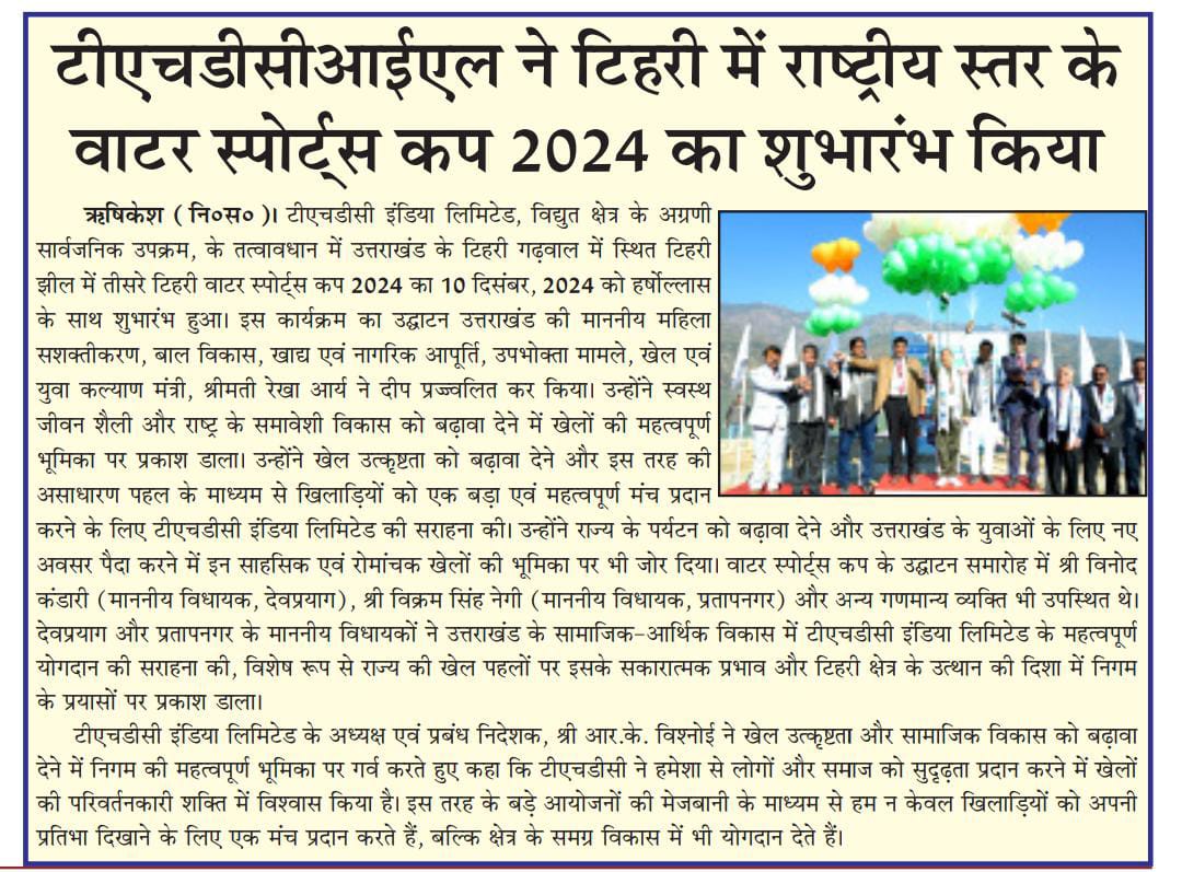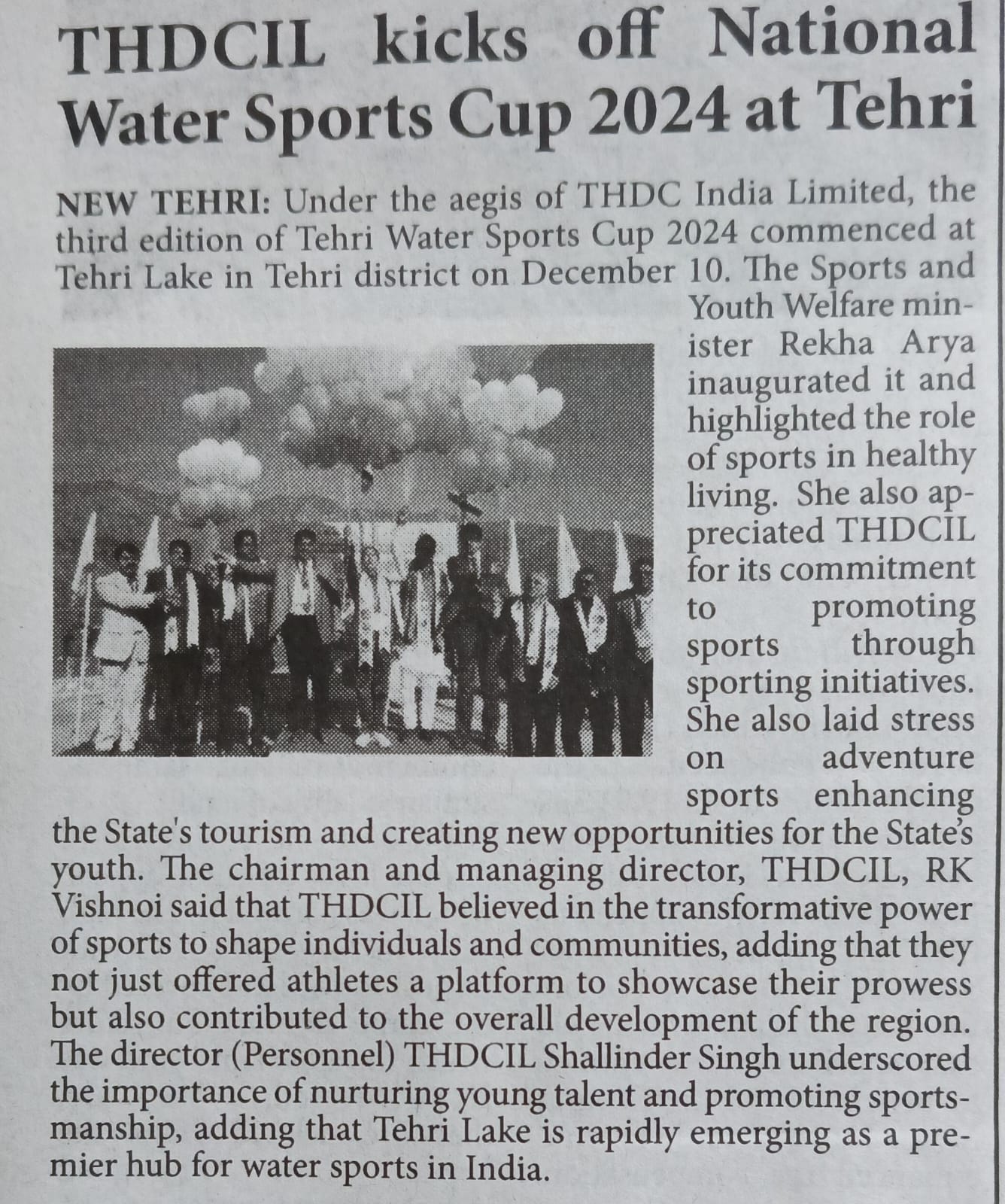 Rishikesh: 10-12-2024:- Under the aegis of THDC India Limited, a Schedule-A, Mini-Ratna, PSU, the highly anticipated Tehri Water Sports Cup 2024- 3rd Edition commenced with great enthusiasm on 10th December, 2024 at Tehri Lake in Tehri-Garhwal of Uttarakhand. The prestigious event was inaugurated by the Hon’ble Cabinet Minister of Women Empowerment, Child Development, Food Civil Supplies, Consumer Affairs, Sports and Youth Welfare, Government of Uttarakhand, Smt. Rekha Arya. She highlighted the role of Sports in healthy living and promoting inclusive development of the nation. She also extended her appreciation and praised THDC India Limited for its unwavering commitment to promoting sports excellence and supporting athletes through such exceptional initiatives. She also emphasized the role of adventure sports in enhancing the state's tourism and creating new opportunities for the youth of Uttarakhand. The event was also graced by several dignitaries such as., Hon’ble MLA Devprayag Sh. Vinod Kandari, Hon’ble MLA Pratapnagar Sh. Vikram Singh Negi and other dignitaries. Hon’ble MLA's of Devprayag and Pratapnagar expressed their appreciation for THDC India Limited's significant contribution to the socio-economic development of Uttarakhand, particularly highlighting its positive impact on the state's sports initiatives and its efforts towards the upliftment of the Tehri region.