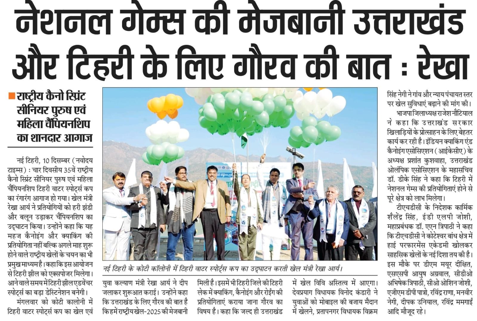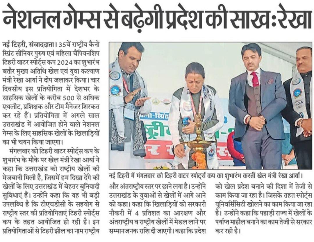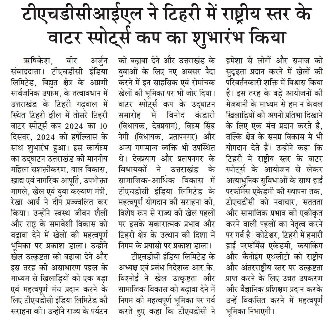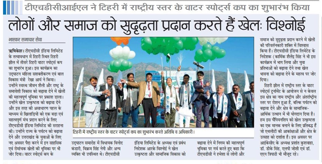 Rishikesh: 10-12-2024:- Under the aegis of THDC India Limited, a Schedule-A, Mini-Ratna, PSU, the highly anticipated Tehri Water Sports Cup 2024- 3rd Edition commenced with great enthusiasm on 10th December, 2024 at Tehri Lake in Tehri-Garhwal of Uttarakhand. The prestigious event was inaugurated by the Hon’ble Cabinet Minister of Women Empowerment, Child Development, Food Civil Supplies, Consumer Affairs, Sports and Youth Welfare, Government of Uttarakhand, Smt. Rekha Arya. She highlighted the role of Sports in healthy living and promoting inclusive development of the nation. She also extended her appreciation and praised THDC India Limited for its unwavering commitment to promoting sports excellence and supporting athletes through such exceptional initiatives. She also emphasized the role of adventure sports in enhancing the state's tourism and creating new opportunities for the youth of Uttarakhand. The event was also graced by several dignitaries such as., Hon’ble MLA Devprayag Sh. Vinod Kandari, Hon’ble MLA Pratapnagar Sh. Vikram Singh Negi and other dignitaries. Hon’ble MLA's of Devprayag and Pratapnagar expressed their appreciation for THDC India Limited's significant contribution to the socio-economic development of Uttarakhand, particularly highlighting its positive impact on the state's sports initiatives and its efforts towards the upliftment of the Tehri region.