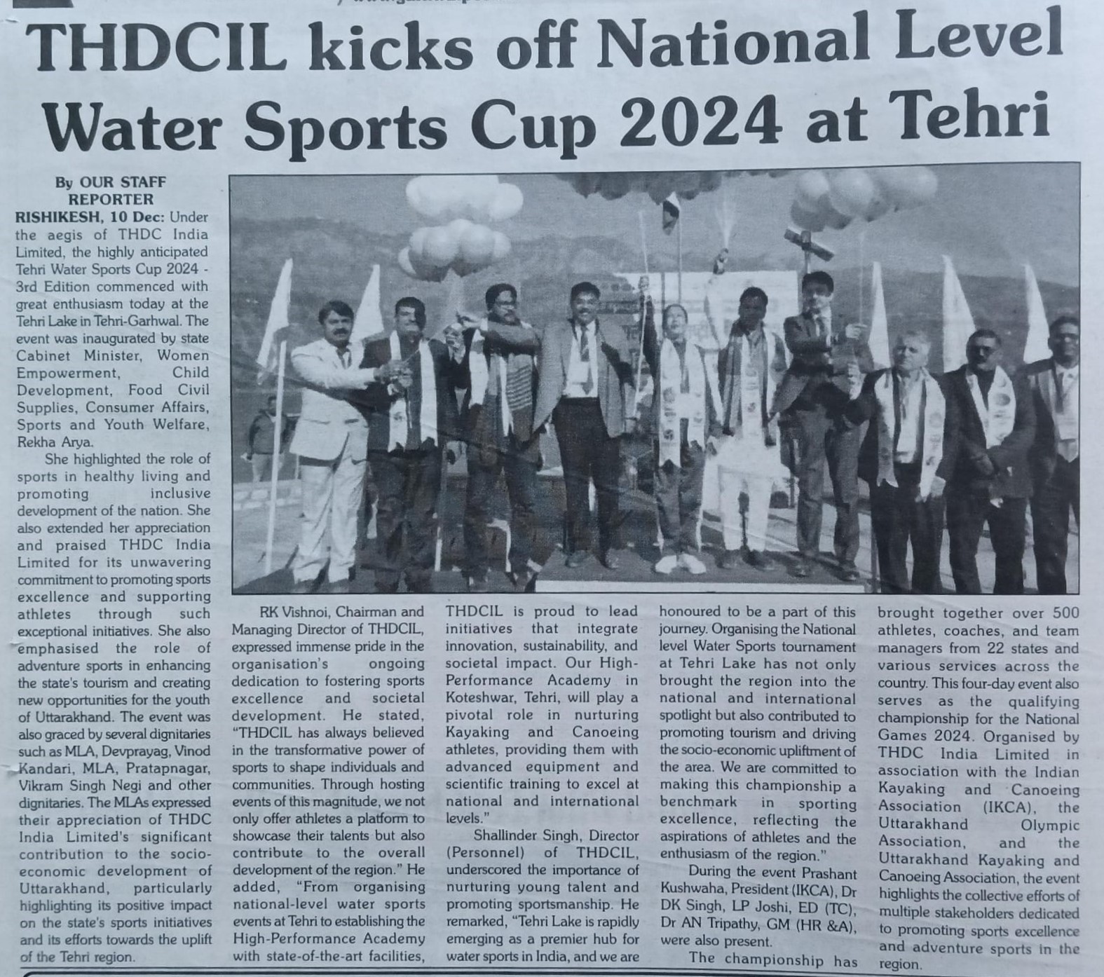 Sh. R. K. Vishnoi, Chairman and Managing Director of THDCIL, expressed immense pride in the organization’s ongoing dedication to fostering sports excellence and societal development. He stated, “THDCIL has always believed in the transformative power of sports to shape individuals and communities. Through hosting events of this magnitude, we not only offer athletes a platform to showcase their talents but also contribute to the overall development of the region.” He further added, “From organizing national-level water sports events at Tehri to establishing the High-Performance Academy with state-of-the-art facilities, THDCIL is proud to lead initiatives that integrate innovation, sustainability, and societal impact. Our High-Performance Academy in Koteshwar, Tehri, will play a pivotal role in nurturing Kayaking and Canoeing athletes, providing them with advanced equipment and scientific training to excel at national and international levels.”