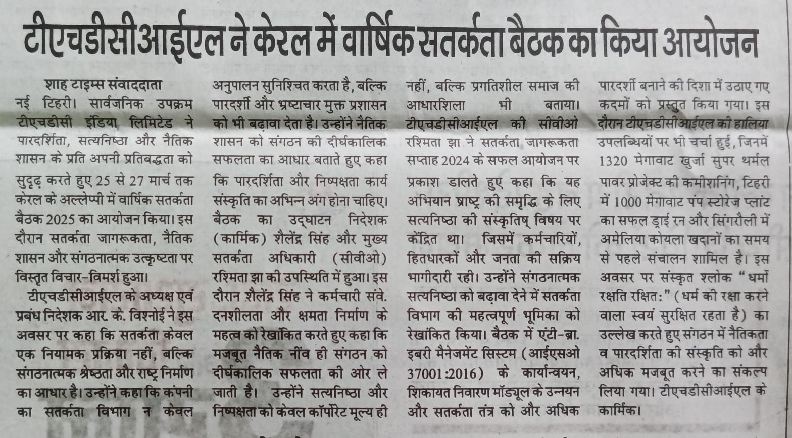 The event also shed light on THDCIL’s progressive initiatives in strengthening vigilance mechanisms, including the implementation of the Anti-Bribery Management System (ABMS) (ISO 37001:2016) to align with global anti-corruption standards and the enhancement of Complaint Handling Modules for greater transparency and accountability.
