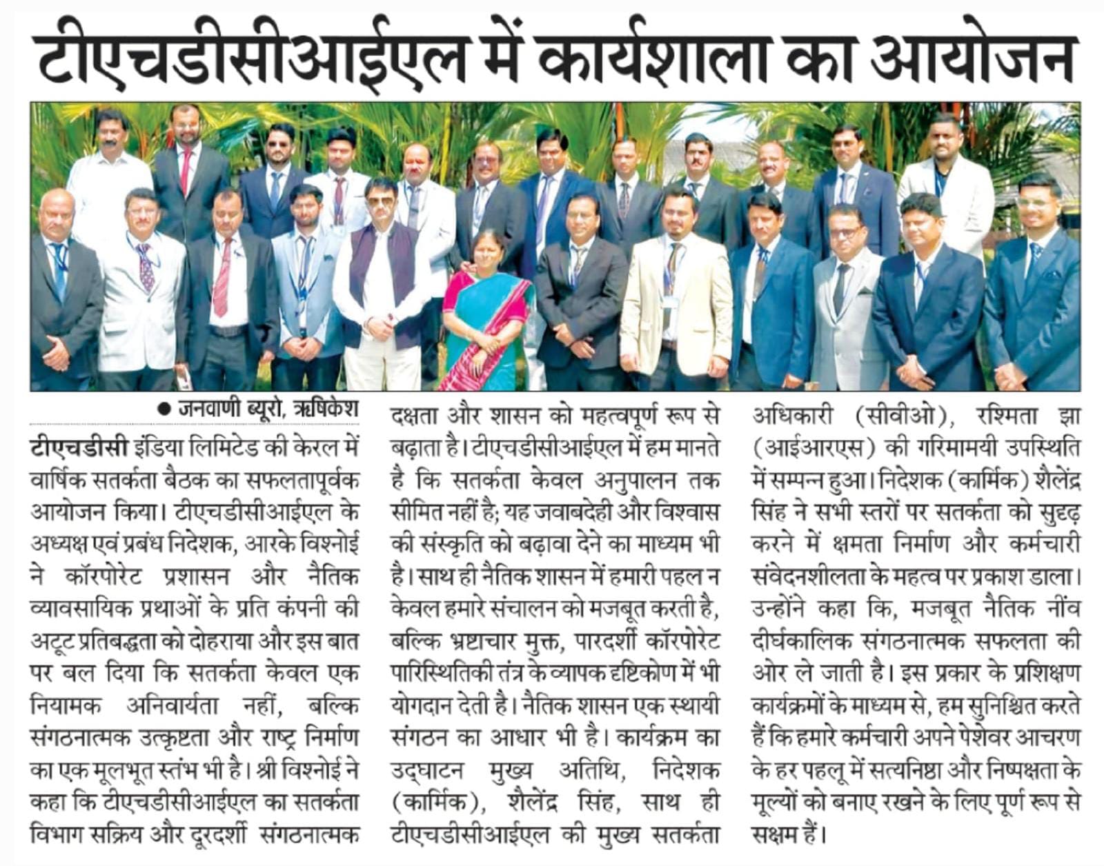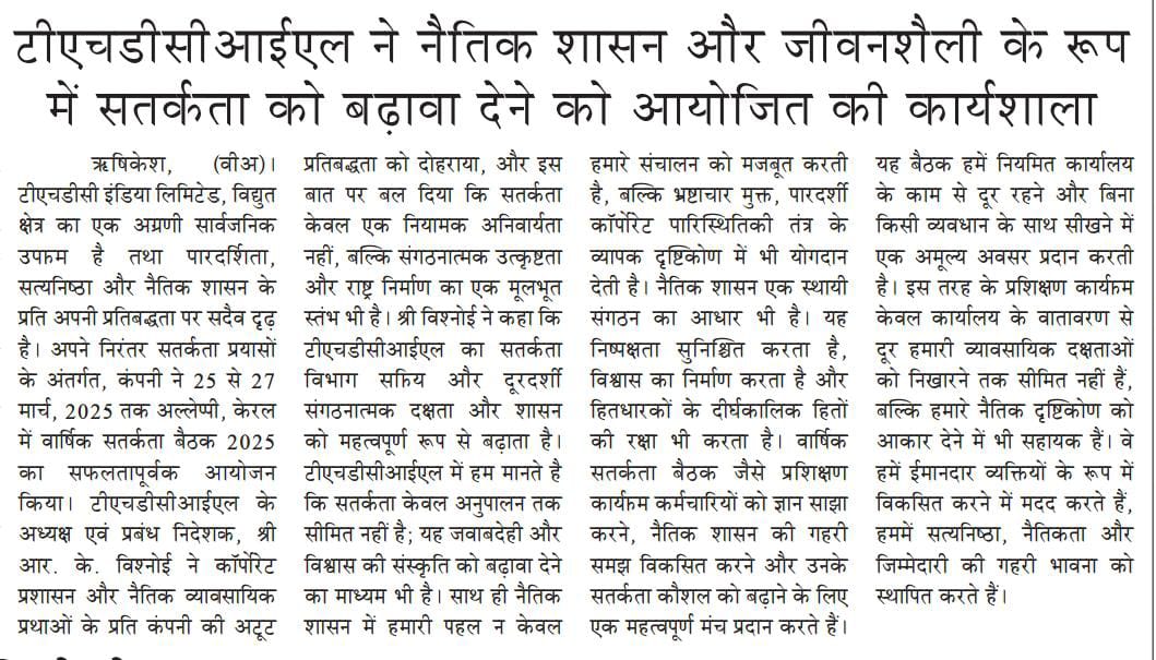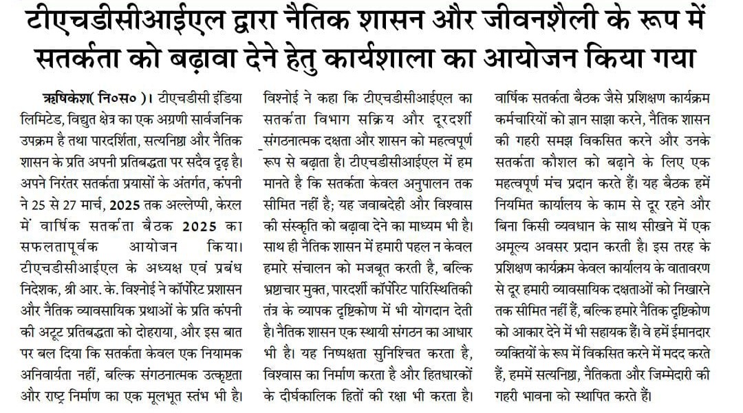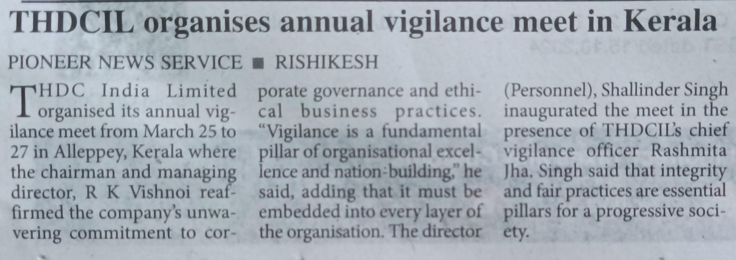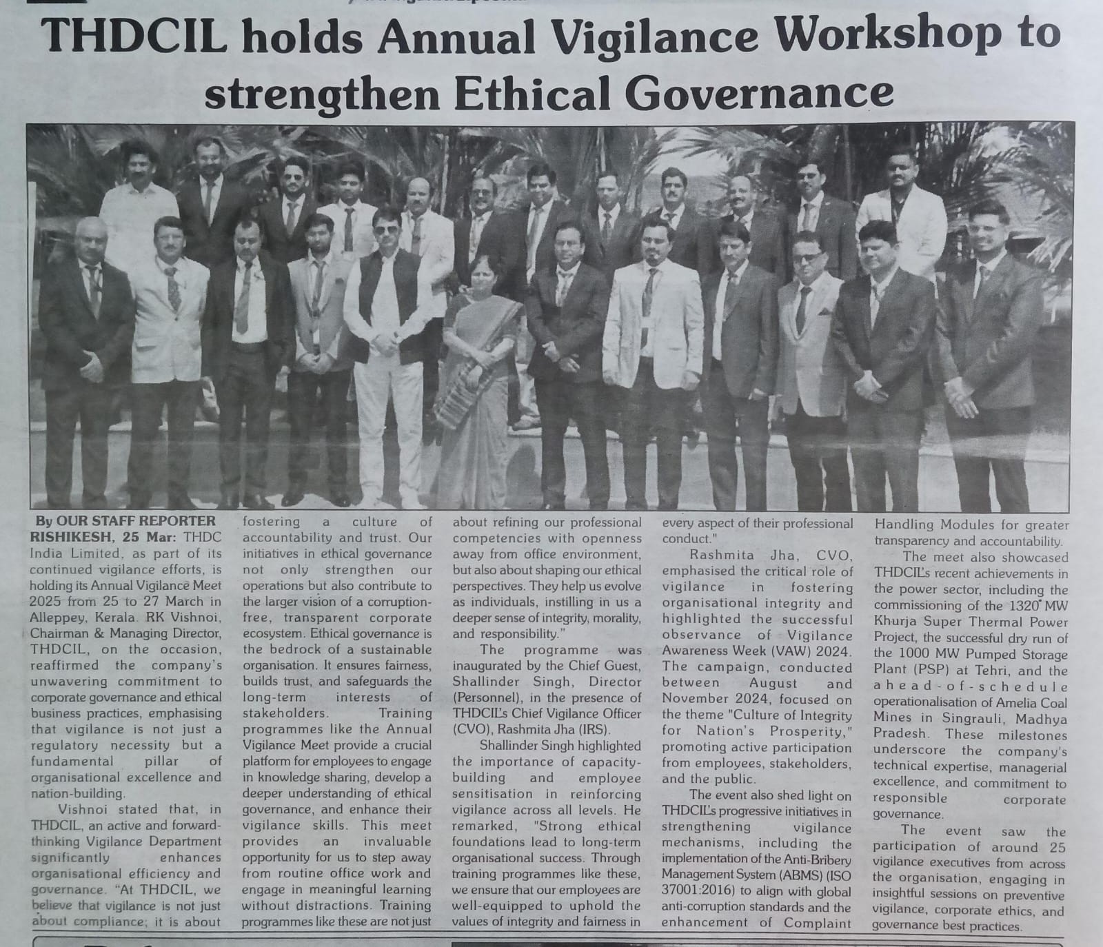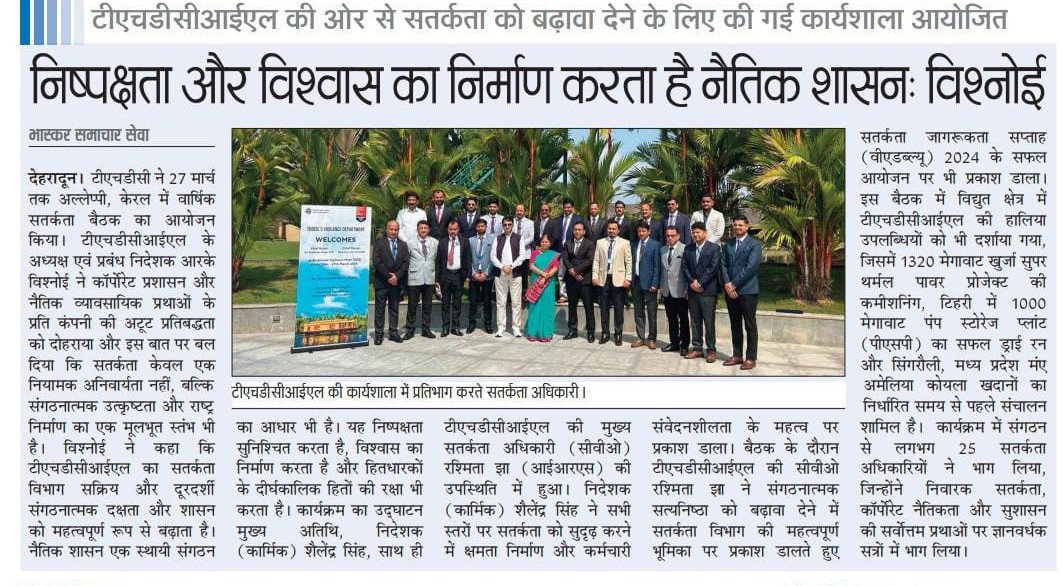 Sh. Vishnoi further emphasized that vigilance must be embedded into every layer of the organization. "Vigilance is not merely the responsibility of a few; it is a collective duty. Every employee, irrespective of role or designation, must be a torchbearer of integrity. Proactive vigilance measures and a strong ethical framework will help us maintain an environment where transparency, efficiency, and fairness are ingrained in our daily operations. Our commitment to these values will not only drive THDCIL towards excellence but also inspire the entire sector to operate with the highest ethical standards."