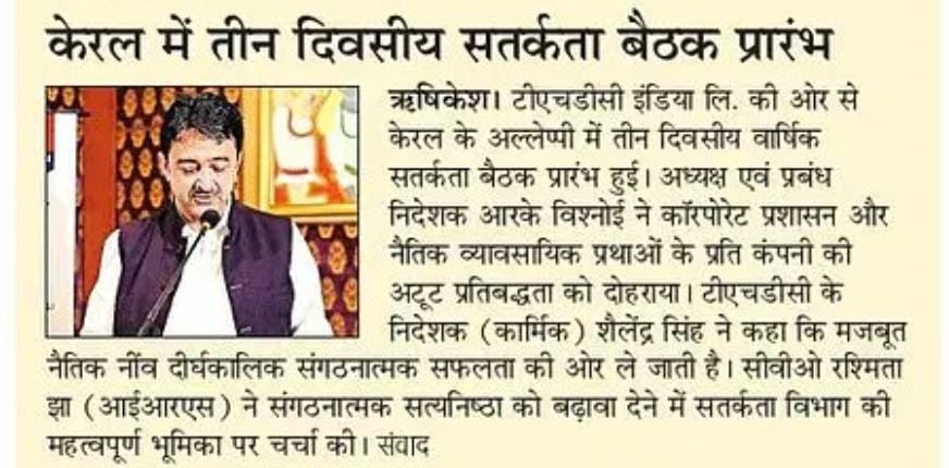 Rishikesh, 25-03-2025: THDC India Limited, a leading Power Sector PSU, remains steadfast in its commitment to transparency, integrity, and ethical governance. As part of its continued vigilance efforts, the company successfully organized the Annual Vigilance Meet 2025 from March 25 to 27, 2025, in Alleppey, Kerala. Sh. R. K. Vishnoi, Chairman & Managing Director, THDCIL, reaffirmed the company’s unwavering commitment to corporate governance and ethical business practices, emphasizing that vigilance is not just a regulatory necessity but a fundamental pillar of organizational excellence and nation-building.