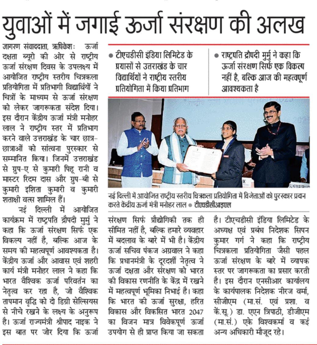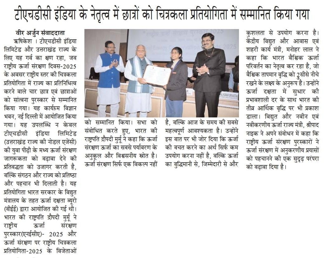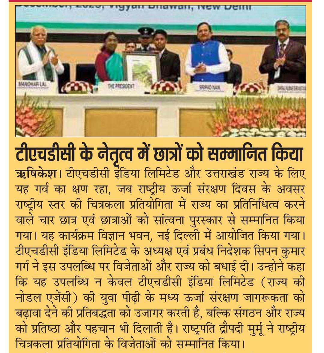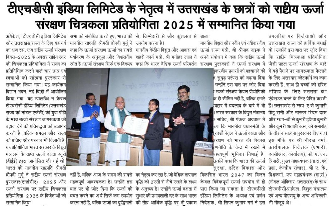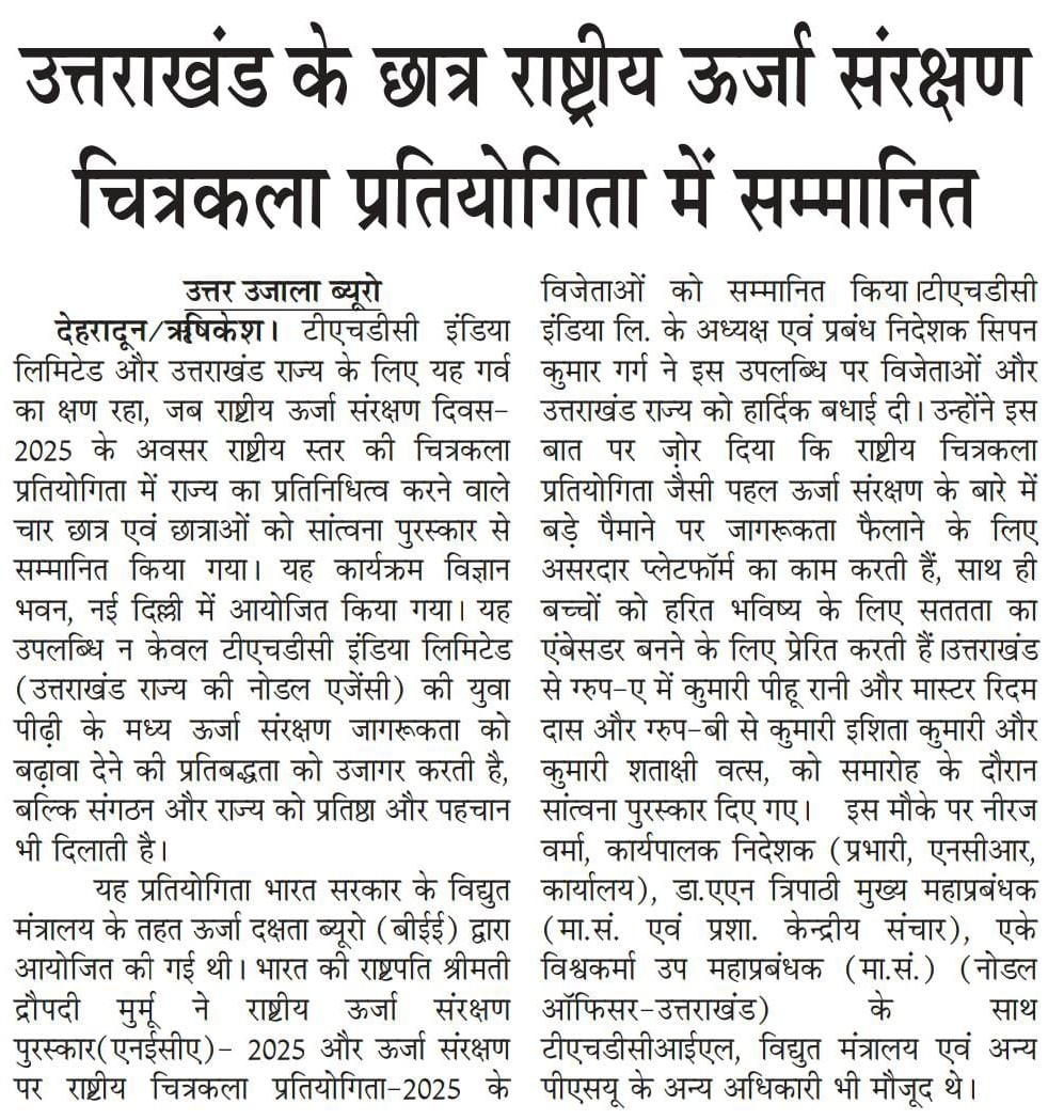 ऋषिकेश, 18 दिसंबर, 2025: टीएचडीसी इंडिया लिमिटेड और उत्तराखंड राज्य के लिए यह गर्व का क्षण रहा, जब राष्ट्रीय ऊर्जा संरक्षण दिवस-2025 के अवसर राष्ट्रीय स्तर की चित्रकला प्रतियोगिता में राज्य का प्रतिनिधित्व करने वाले चार छात्र एवं छात्राओं को सांत्वना पुरस्कार से सम्मानित किया गया। यह कार्यक्रम विज्ञान भवन, नई दिल्ली में आयोजित किया गया। यह उपलब्धि न केवल टीएचडीसी इंडिया लिमिटेड (उत्तराखंड राज्य की नोडल एजेंसी) की युवा पीढ़ी के मध्य ऊर्जा संरक्षण जागरूकता को बढ़ावा देने की प्रतिबद्धता को उजागर करती है, बल्कि संगठन और राज्य को प्रतिष्ठा और पहचान भी दिलाती है।