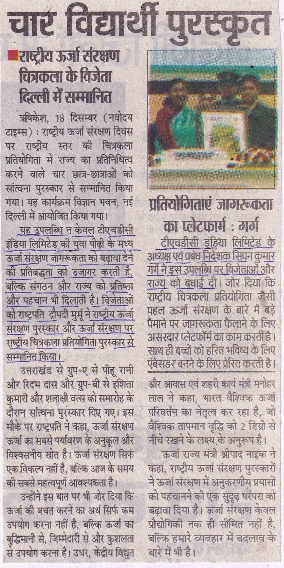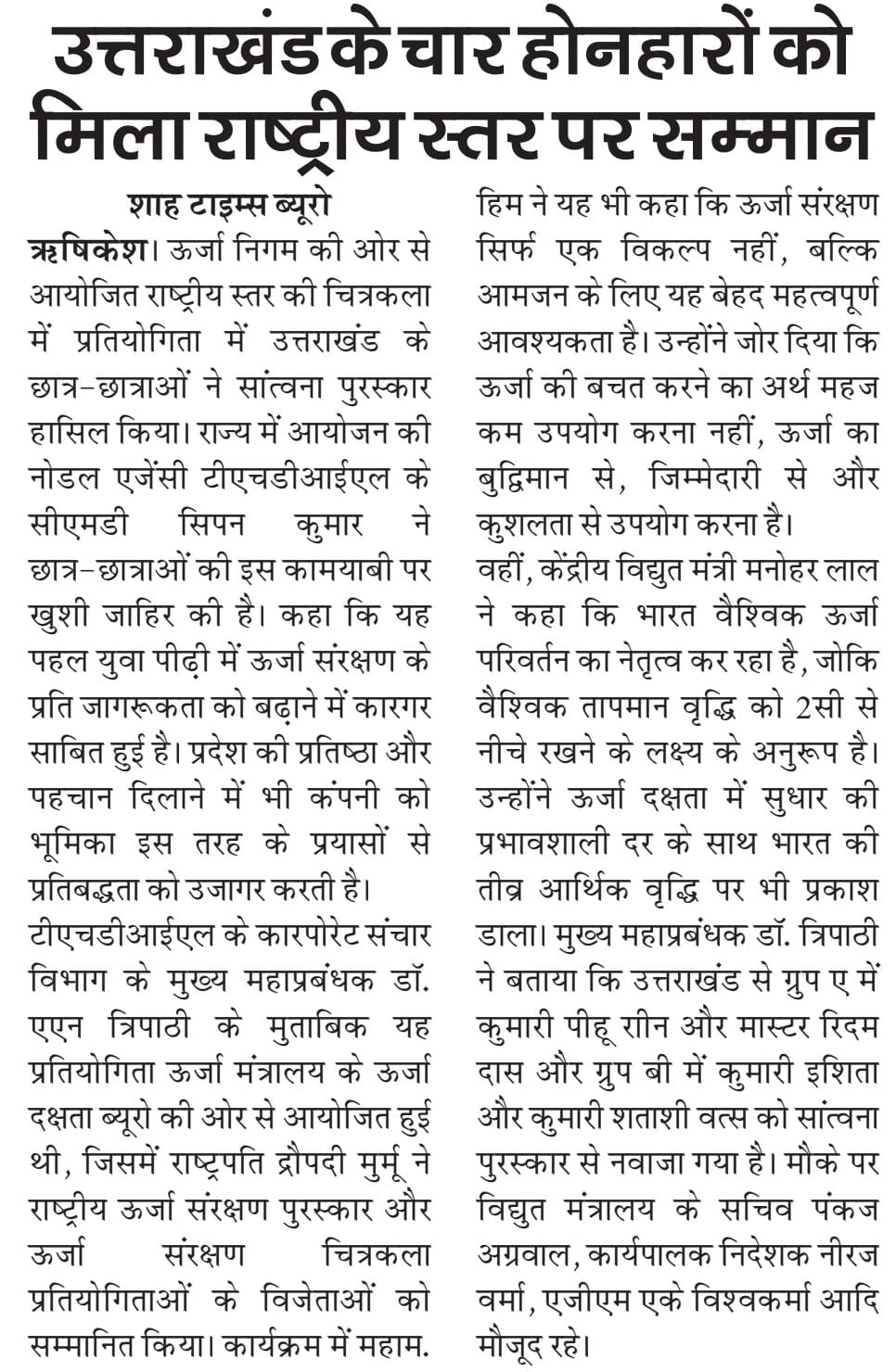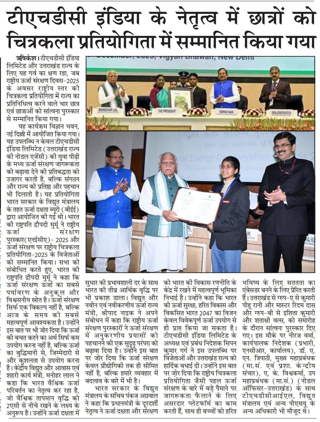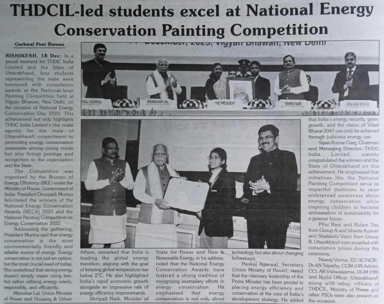 ऋषिकेश, 18 दिसंबर, 2025: टीएचडीसी इंडिया लिमिटेड और उत्तराखंड राज्य के लिए यह गर्व का क्षण रहा, जब राष्ट्रीय ऊर्जा संरक्षण दिवस-2025 के अवसर राष्ट्रीय स्तर की चित्रकला प्रतियोगिता में राज्य का प्रतिनिधित्व करने वाले चार छात्र एवं छात्राओं को सांत्वना पुरस्कार से सम्मानित किया गया। यह कार्यक्रम विज्ञान भवन, नई दिल्ली में आयोजित किया गया। यह उपलब्धि न केवल टीएचडीसी इंडिया लिमिटेड (उत्तराखंड राज्य की नोडल एजेंसी) की युवा पीढ़ी के मध्य ऊर्जा संरक्षण जागरूकता को बढ़ावा देने की प्रतिबद्धता को उजागर करती है, बल्कि संगठन और राज्य को प्रतिष्ठा और पहचान भी दिलाती है।