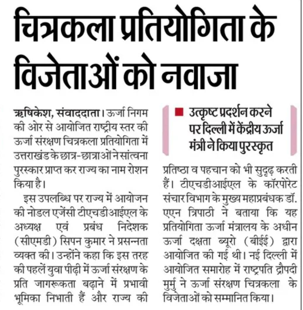 टीएचडीसी इंडिया लिमिटेड के अध्यक्ष एवं प्रबंध निदेशक, श्री सिपन कुमार गर्ग ने इस उपलब्धि पर विजेताओं और उत्तराखंड राज्य को हार्दिक बधाई दी। उन्होंने इस बात पर ज़ोर दिया कि राष्ट्रीय चित्रकला प्रतियोगिता जैसी पहल ऊर्जा संरक्षण के बारे में बड़े पैमाने पर जागरूकता फैलाने के लिए असरदार प्लेटफॉर्म का काम करती हैं, साथ ही बच्चों को हरित भविष्य के लिए सततता का एंबेसडर बनने के लिए प्रेरित करती हैं।