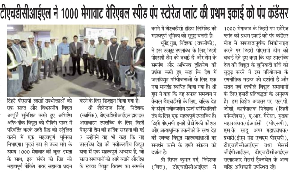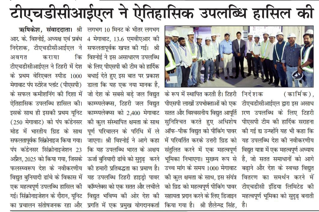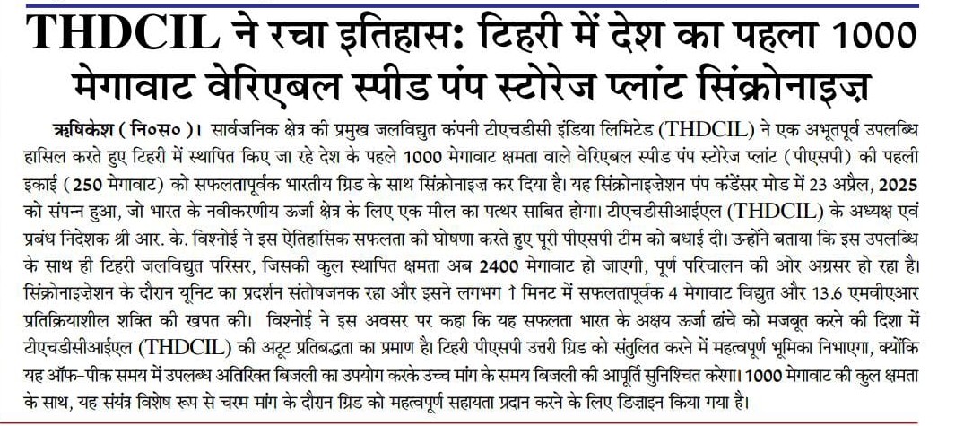 Sh. Shallinder Singh, Director (Personnel), THDCIL conveyed his heartfelt appreciation to Team Tehri PSP for this exceptional achievement and added that this accomplishment marks a significant chapter in India’s renewable energy journey, reinforcing THDC India Limited’s pivotal role in advancing sustainable solutions and supporting India’s clean energy transition.